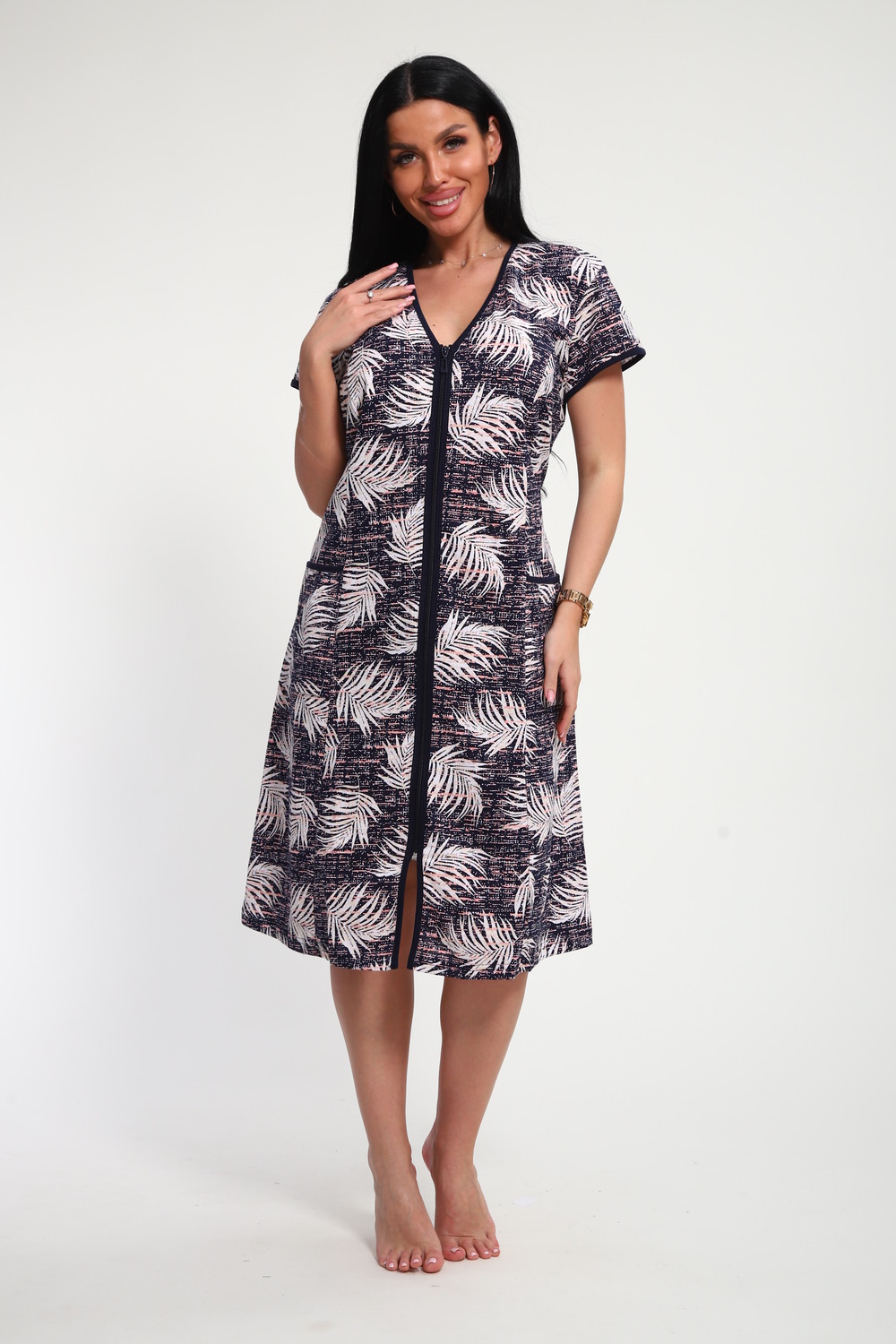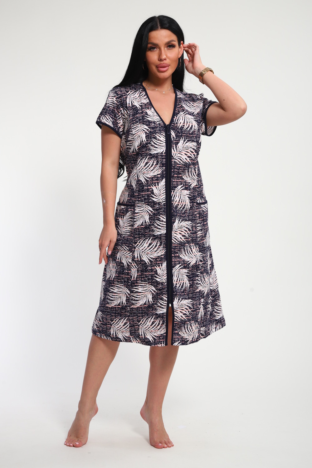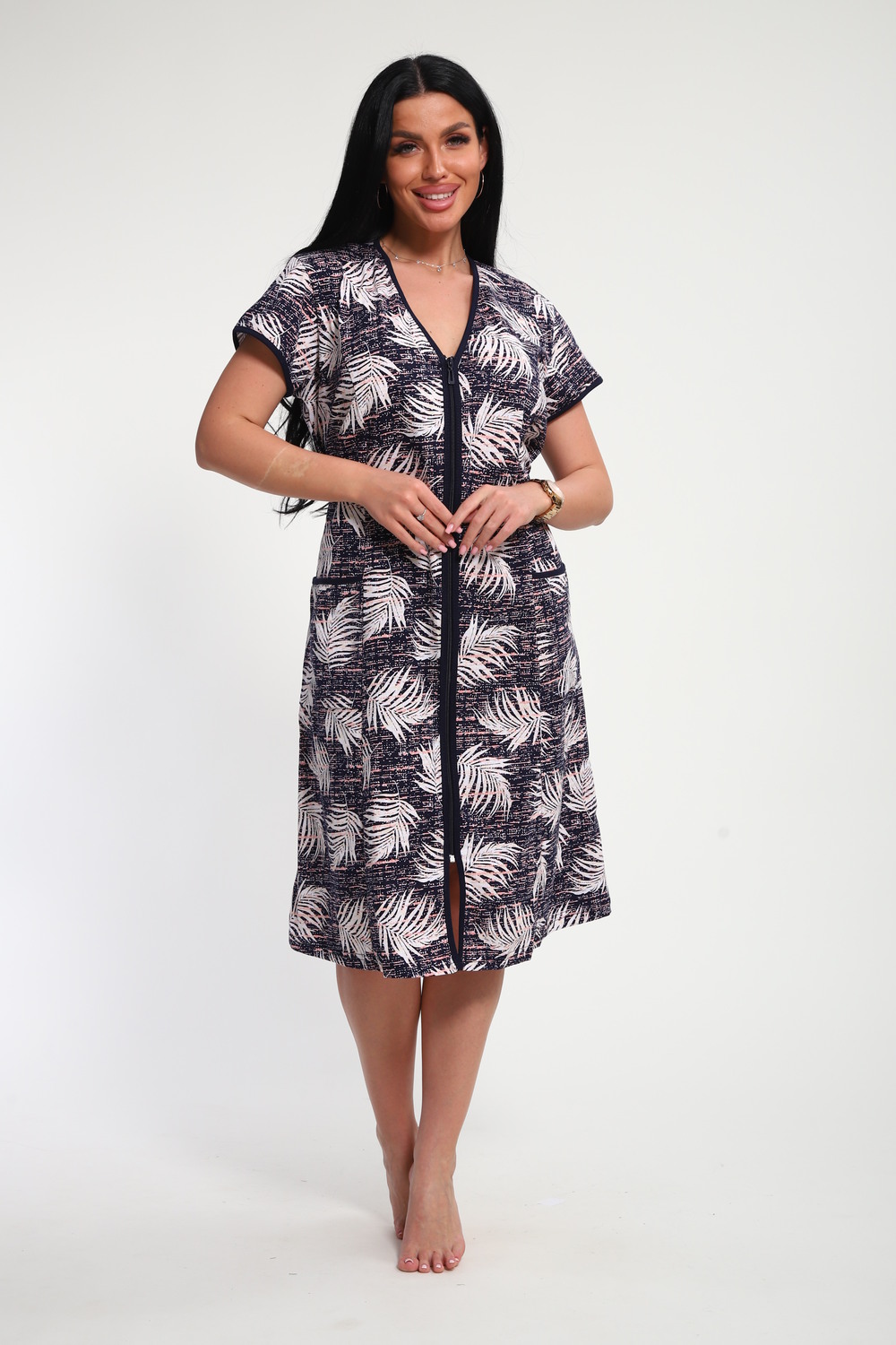 Халат женский на молнии с короткими рукавами, цветной окантовкой, по бокам имеются карманы - это стильный и удобный выбор для комфортного отдыха дома или после душа. Он изготовлен из высококачественного трикотажного материала 100% хлопок, который приятен к телу и обеспечивает мягкость и комфорт в носке. Одной из главных характеристик этого халата является его наличие молнии. Молния предоставляет удобство и легкость при надевании и снятии халата, а также позволяет регулировать степень открытости или закрытости в зависимости от предпочтений и комфорта. Женский халат на молнии доступен в больших размерах, что делает его идеальным выбором для женщин, которые ценят свободу движений и комфорт в одежде. Большие размеры обеспечивают свободу и расслабленность, не сковывая движений и создавая ощущение свободы.