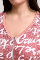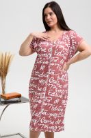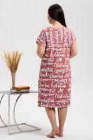 Халат с застежкой на молнию, полуприлегающего силуэта, длиной ниже колена, с V-образной горловиной, с накладными боковыми карманами. Рукав спущенный, короткий. В верхней части полочки расположены кокетки. Спинка с кокеткой. В нижней части боковых швов обработаны разрезы. Горловина, проймы и верх карманов обработаны бейкой из отделочного полотна с белым кантом и декоративной строчкой.