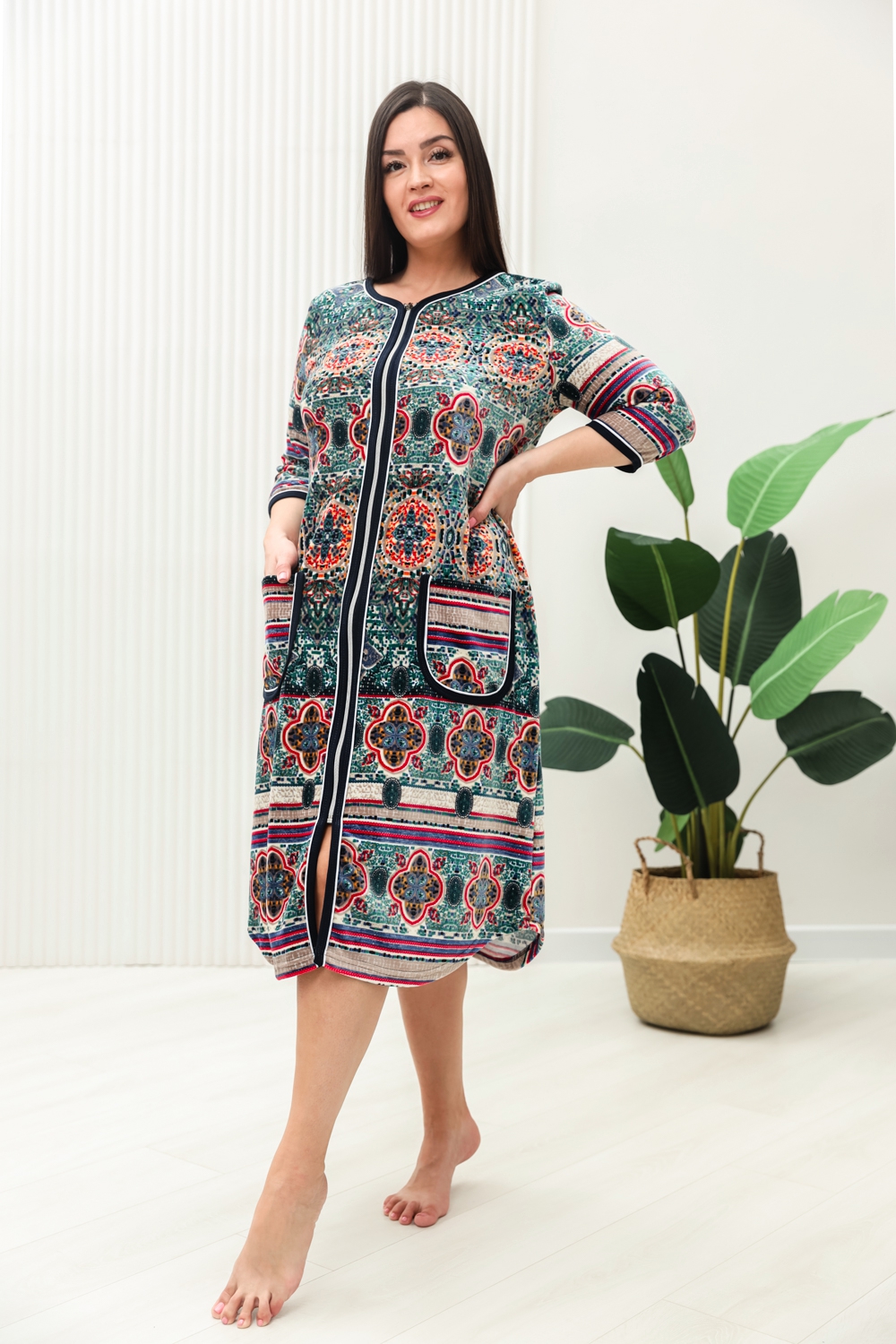 Халат женский полуприлегающий, расширенный к низу. Рукав втачной, 3/4. Застежка на тесьму-молнию. На полочке накладные карманы. Край борта, низ рукавов, карманы окантованы контрастной бейкой с белым кантом.