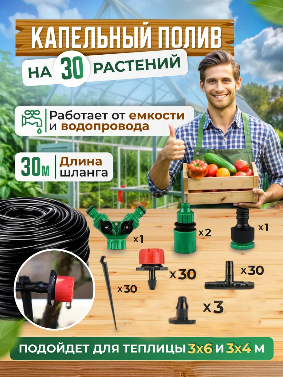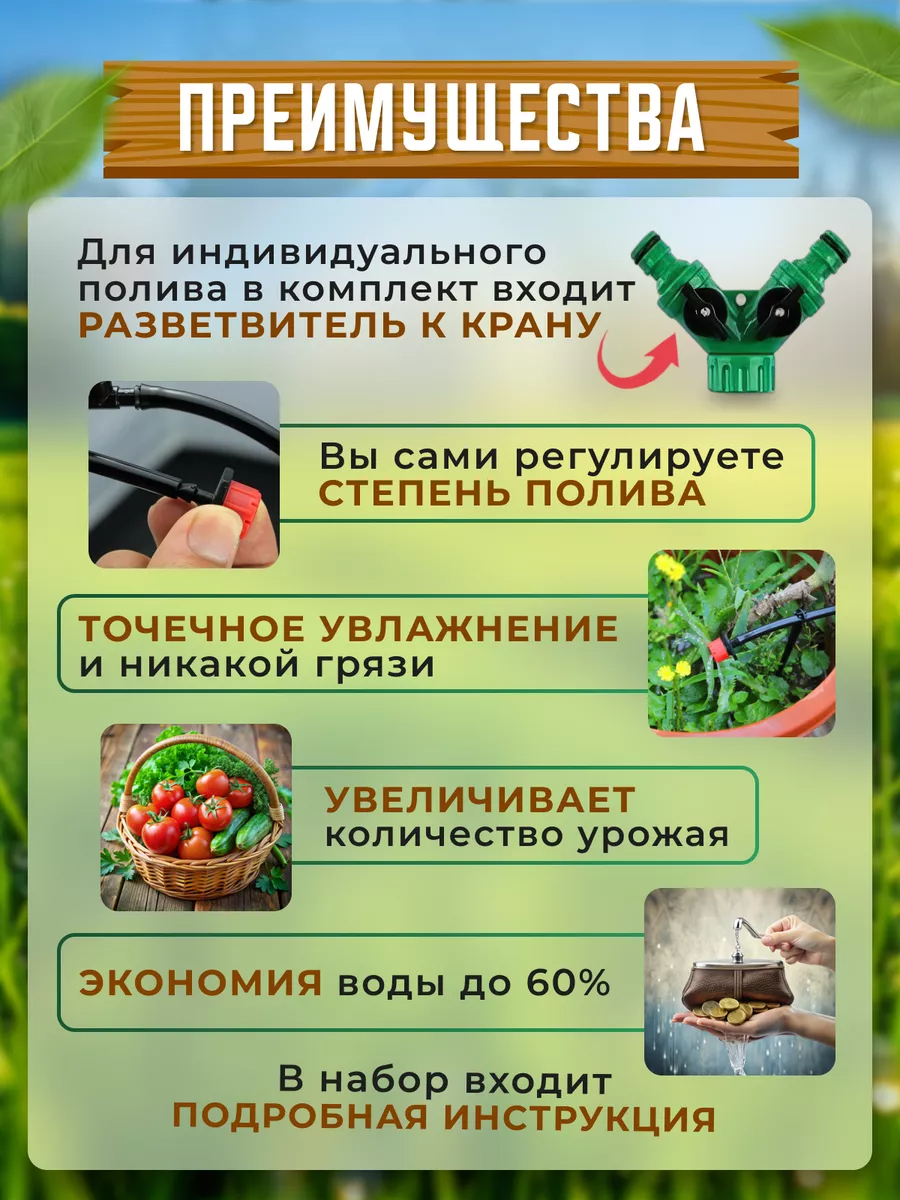 Уникальное решение для полива растений в теплице и в огороде - капельный полив от бочки и водопровода на 25 метров. Эта система обеспечит равномерное и эффективное водоснабжение вашим растениям, не требуя постоянного контроля и участия. Система капельного полива состоит из специальной микротрубки, которая подключаются к бочке с водой и распределяют влагу по всей теплице или по огороду. Благодаря автополиву вы сможете забыть о ежедневном поливе и наслаждаться здоровыми и крепкими растениями. Капельный полив обеспечивает газоотводный эффект, что позволяет избежать скопления влаги и появления гнили. Также он защищает от вредителей, таких как жуки, которые могут повредить ваши растения. Эта система идеально подходит для использования как на даче, так и в саду или огороде. А ещё можно настроить капельный полив дома, для комнатных растений. Комплект включает в себя все необходимые элементы для установки системы капельного полива – микротрубка из качественного ПВХ, тройники, капельницы, колышки держатели, один разветвитель на кран, для индивидуального полива в двух направлениях. Два переходника для микротрубки, и два разъема для крана, с резьбой и универсальный.
