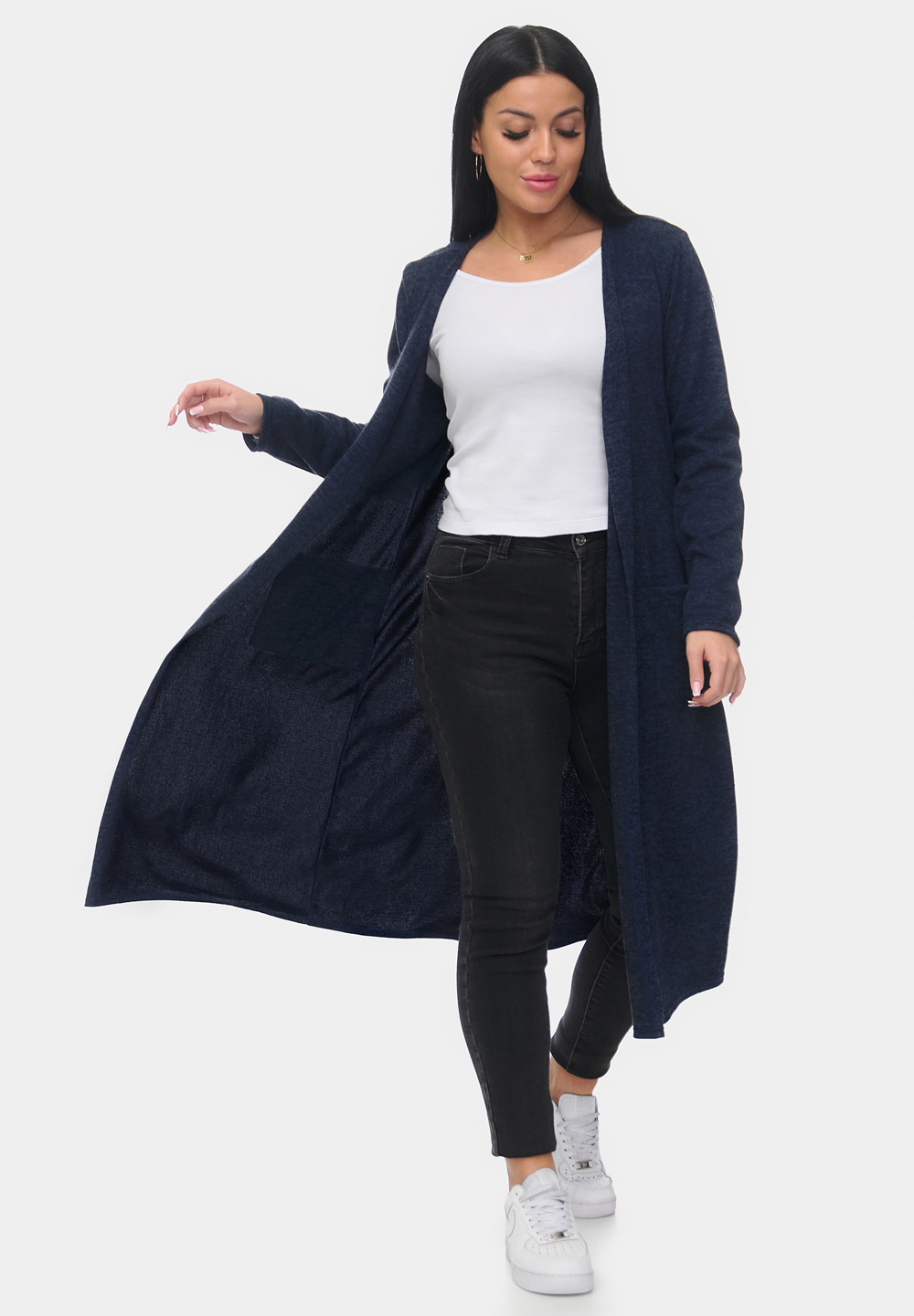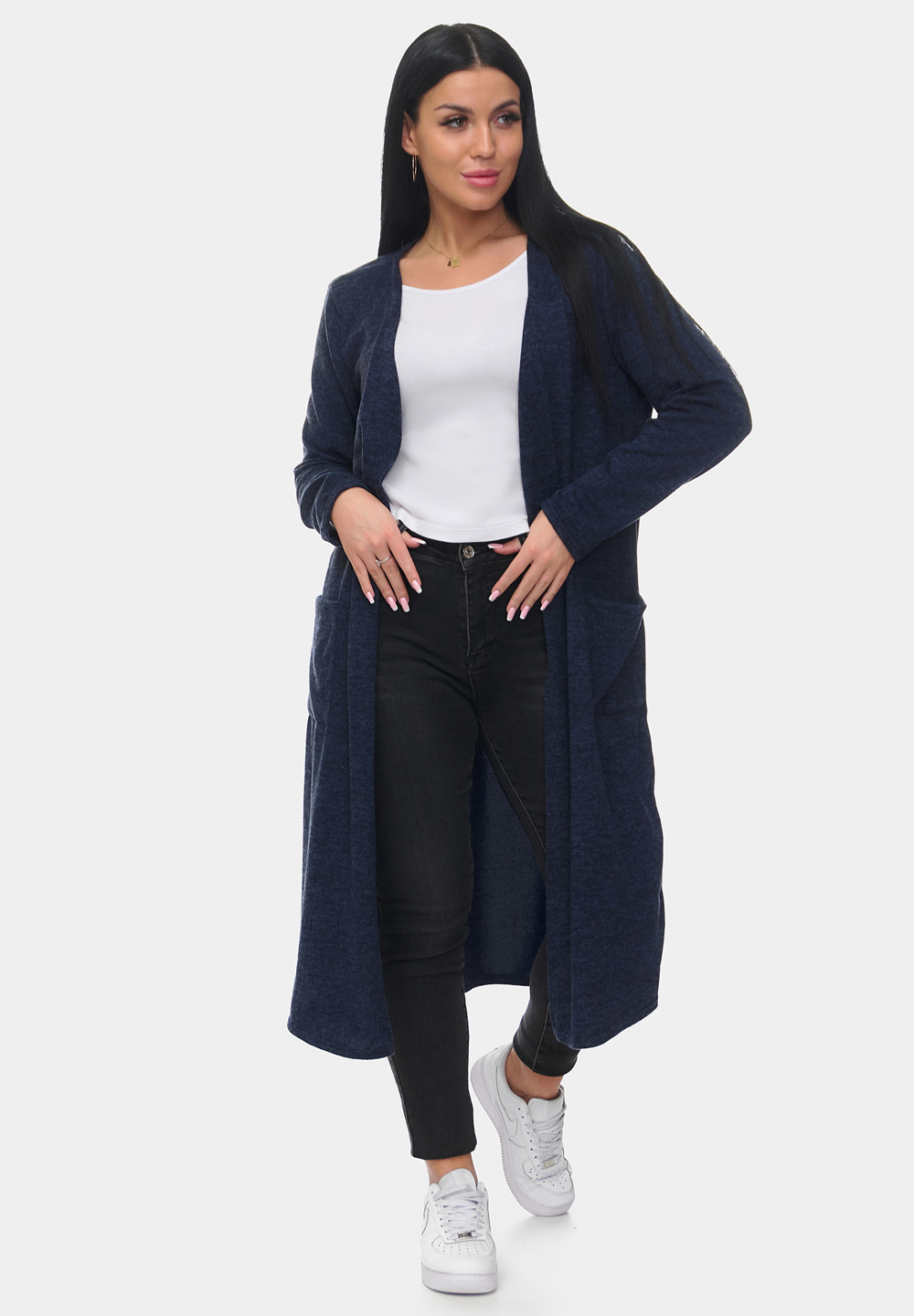 Стильный и уютный длинный кардиган из мягкой ангоры софт. Модель прямого кроя с удобными накладными карманами и открытой линией переда. Приятный на ощупь материал обеспечивает комфорт и тепло, идеально подходит для повседневных образов. Отлично сочетается с джинсами и брюками.