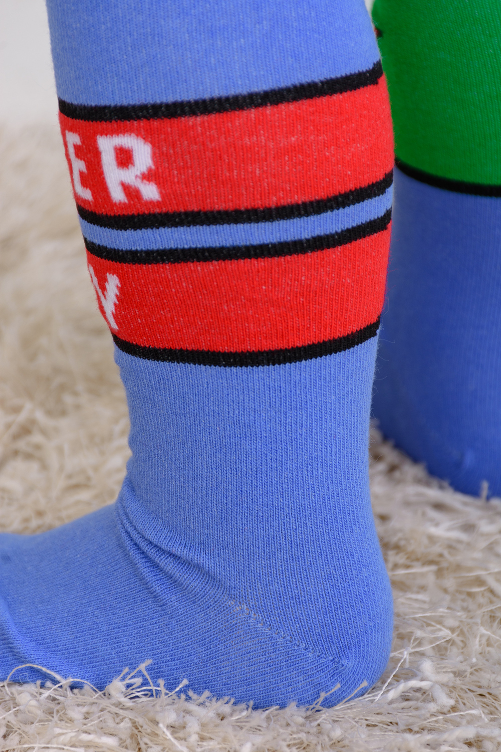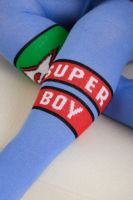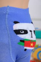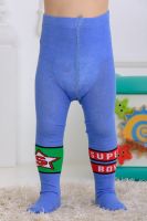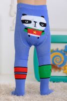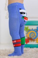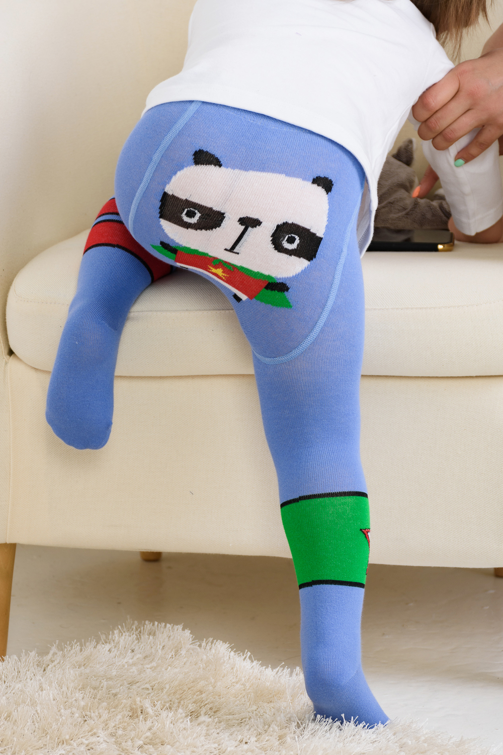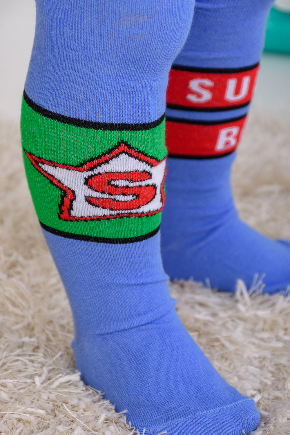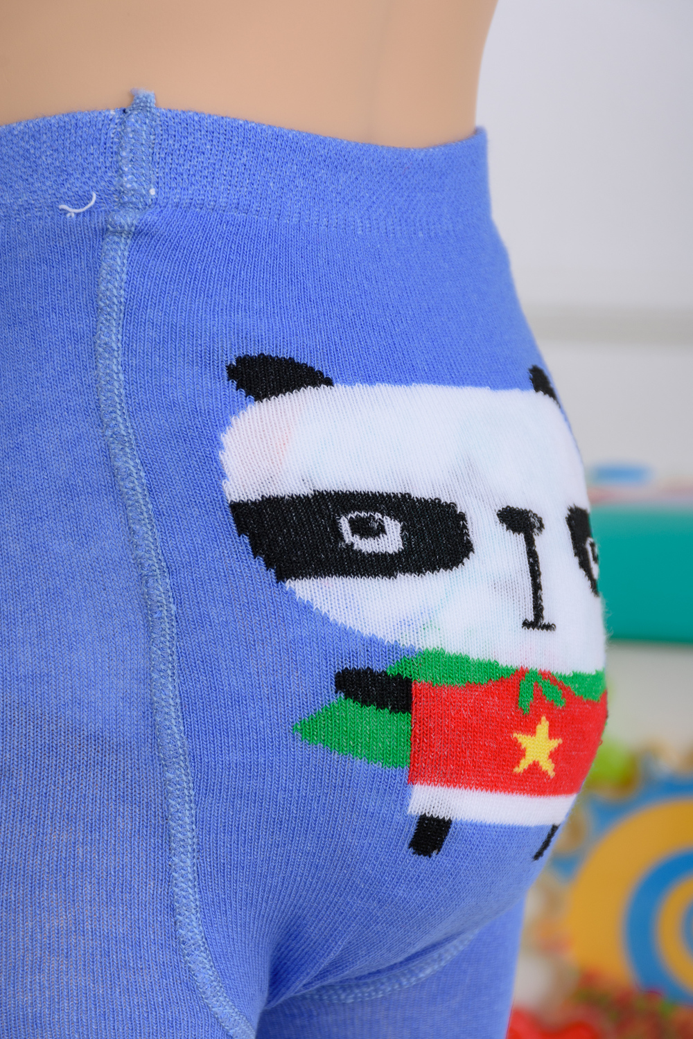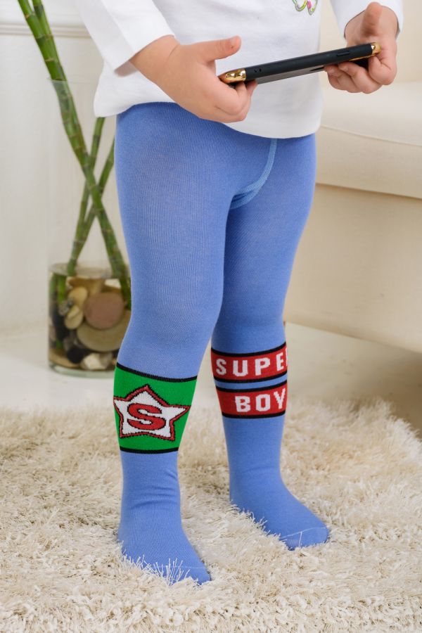 Детские колготки для мальчиков. Однотонный синий фон, в области коленей вывязаны полосы, звезда с буквой S и надпись "Super Boy". Сзади вывязан рисунок в виде панды