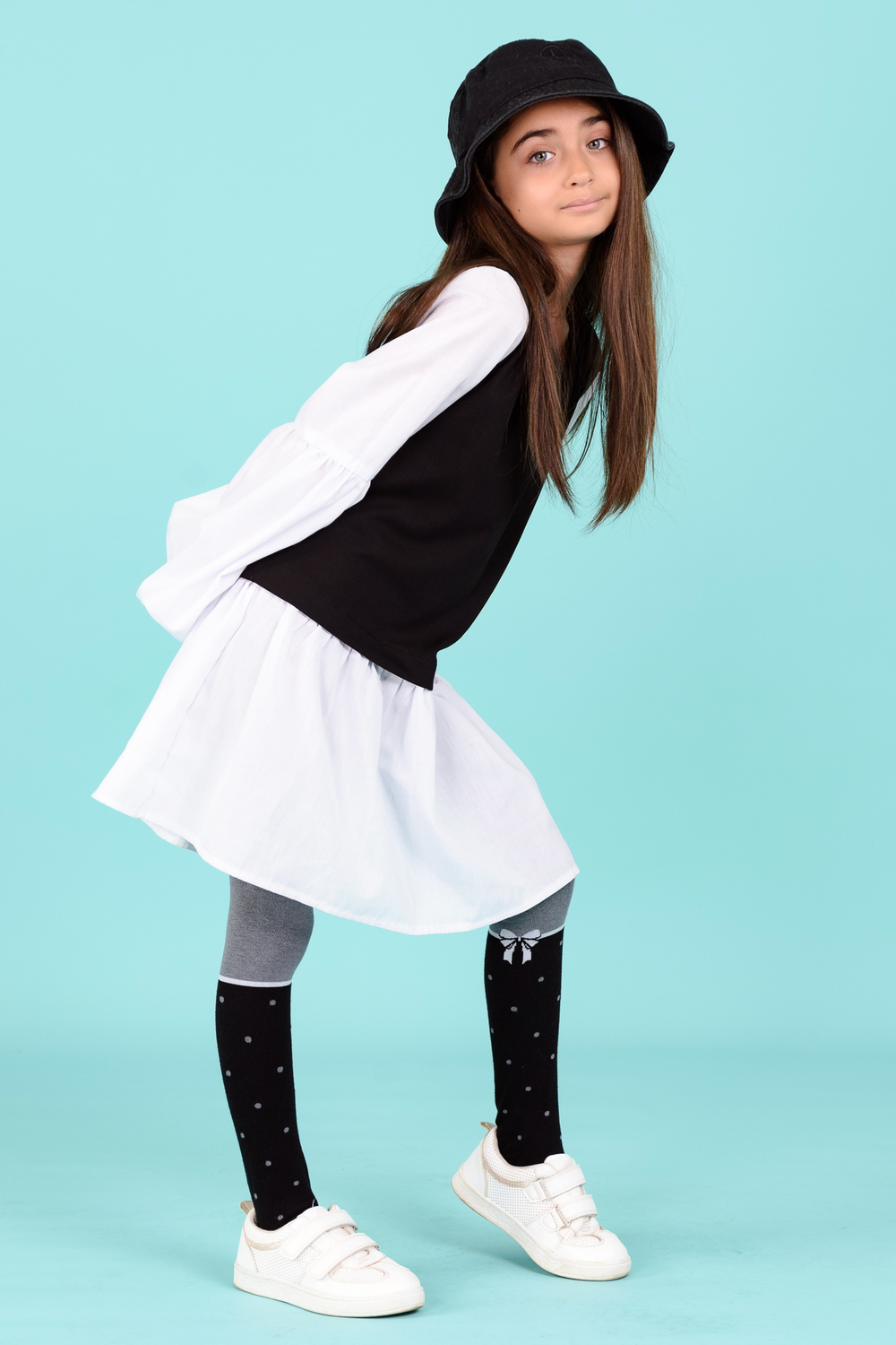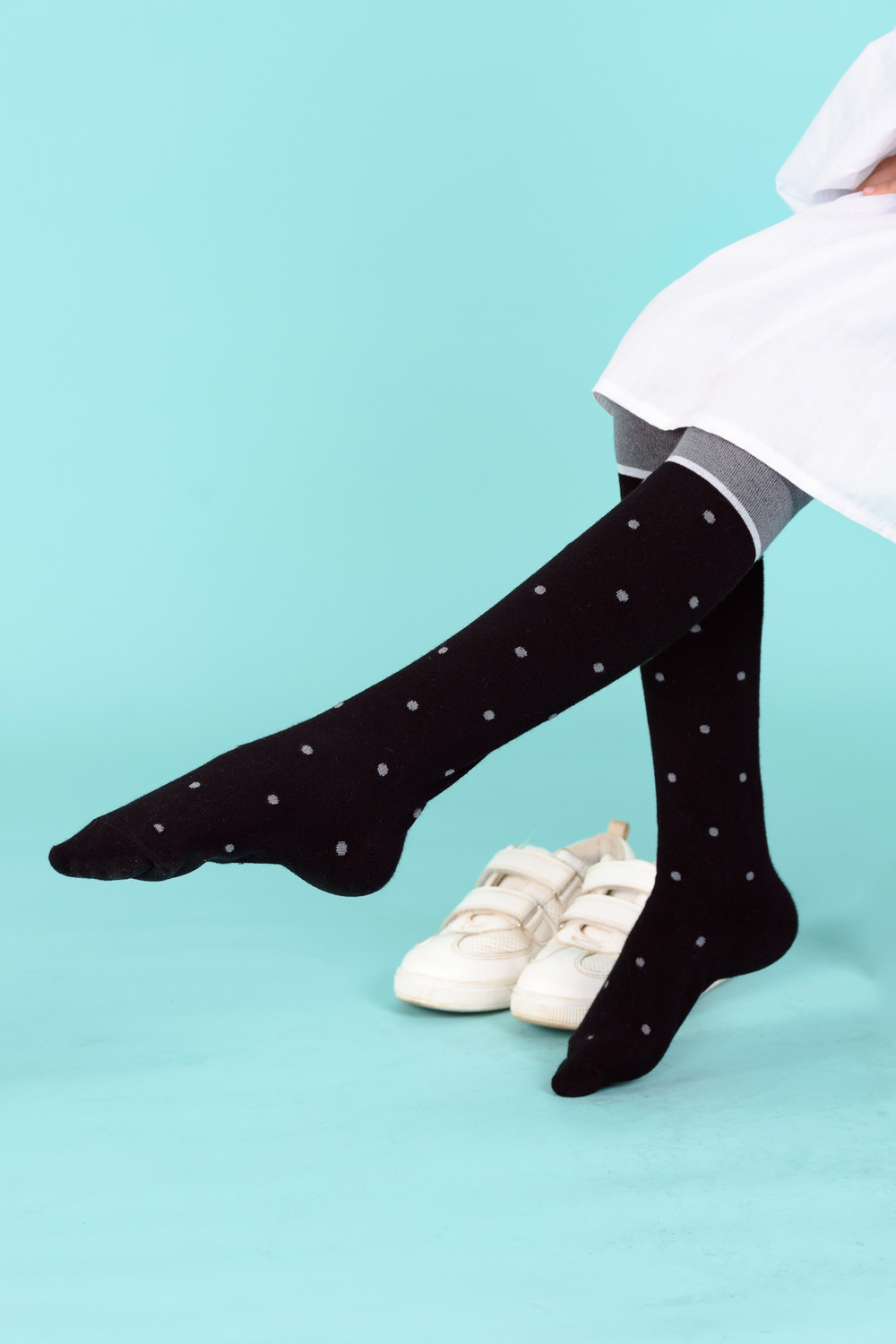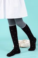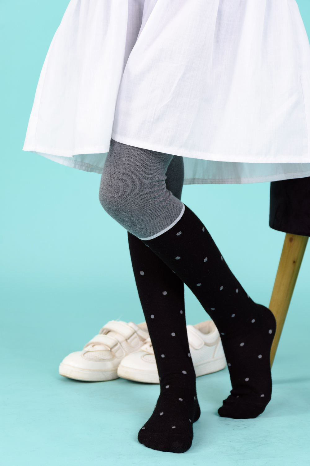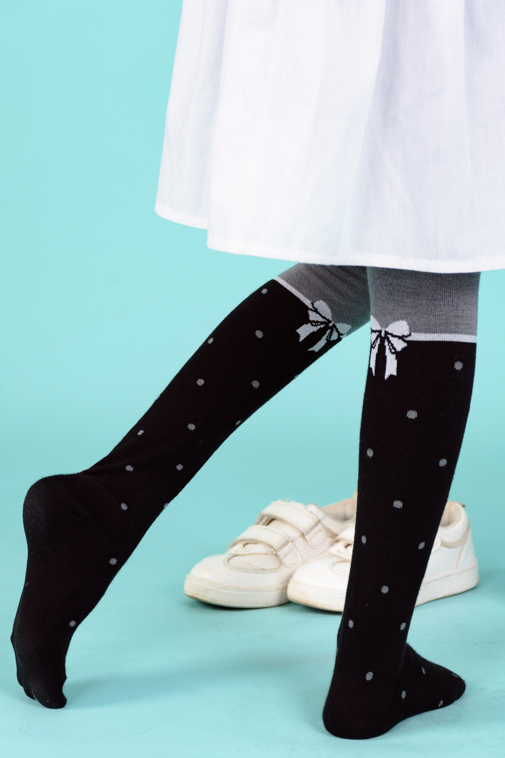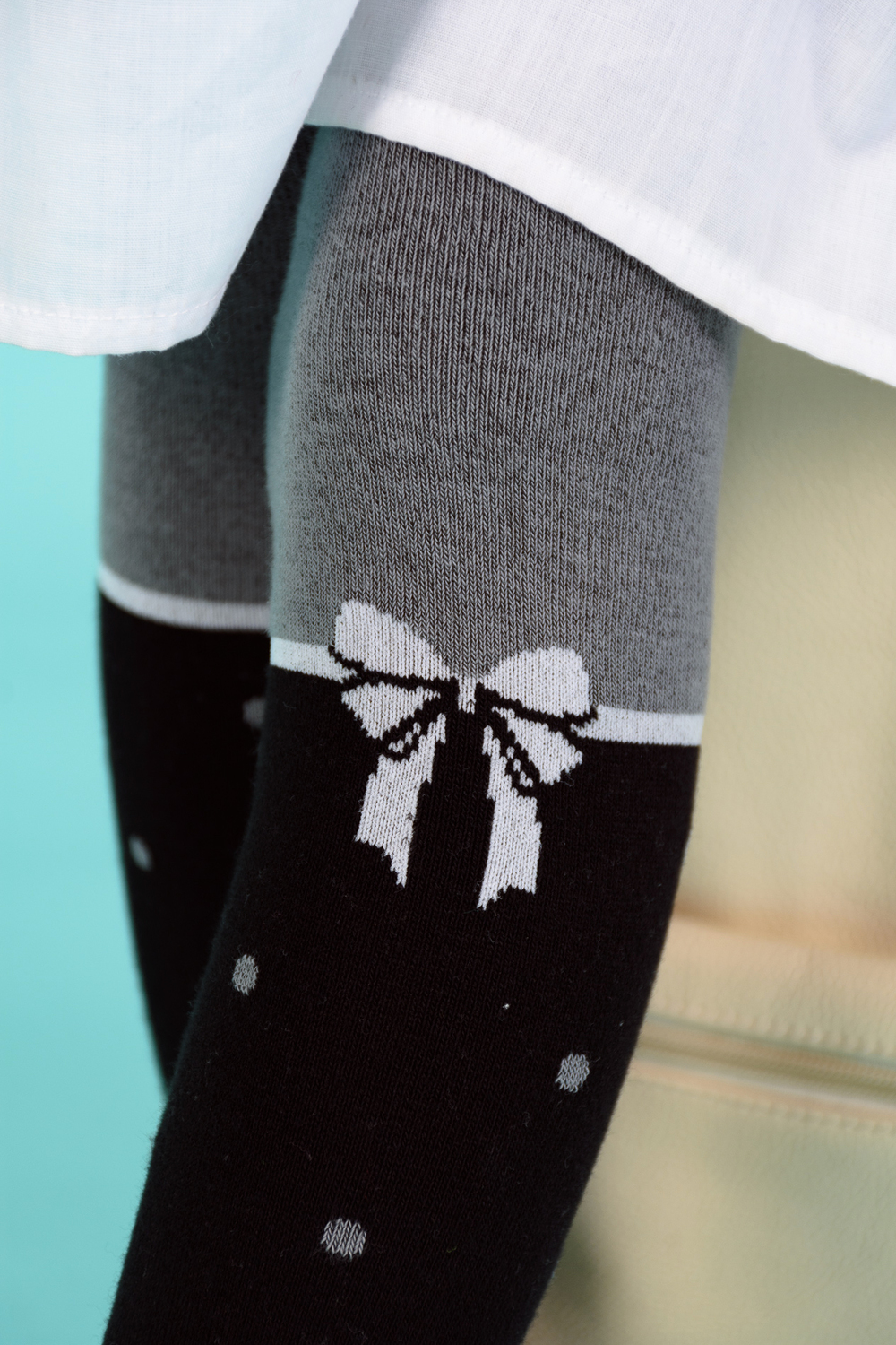 Колготки подростковые в лаконичных расцветках. Верх однотонный серый, низ черный в серый горошек с милым бантиком сзади. Спокойный дизайн и расцветка колготок отлично подойдут для стильного школьного образа.