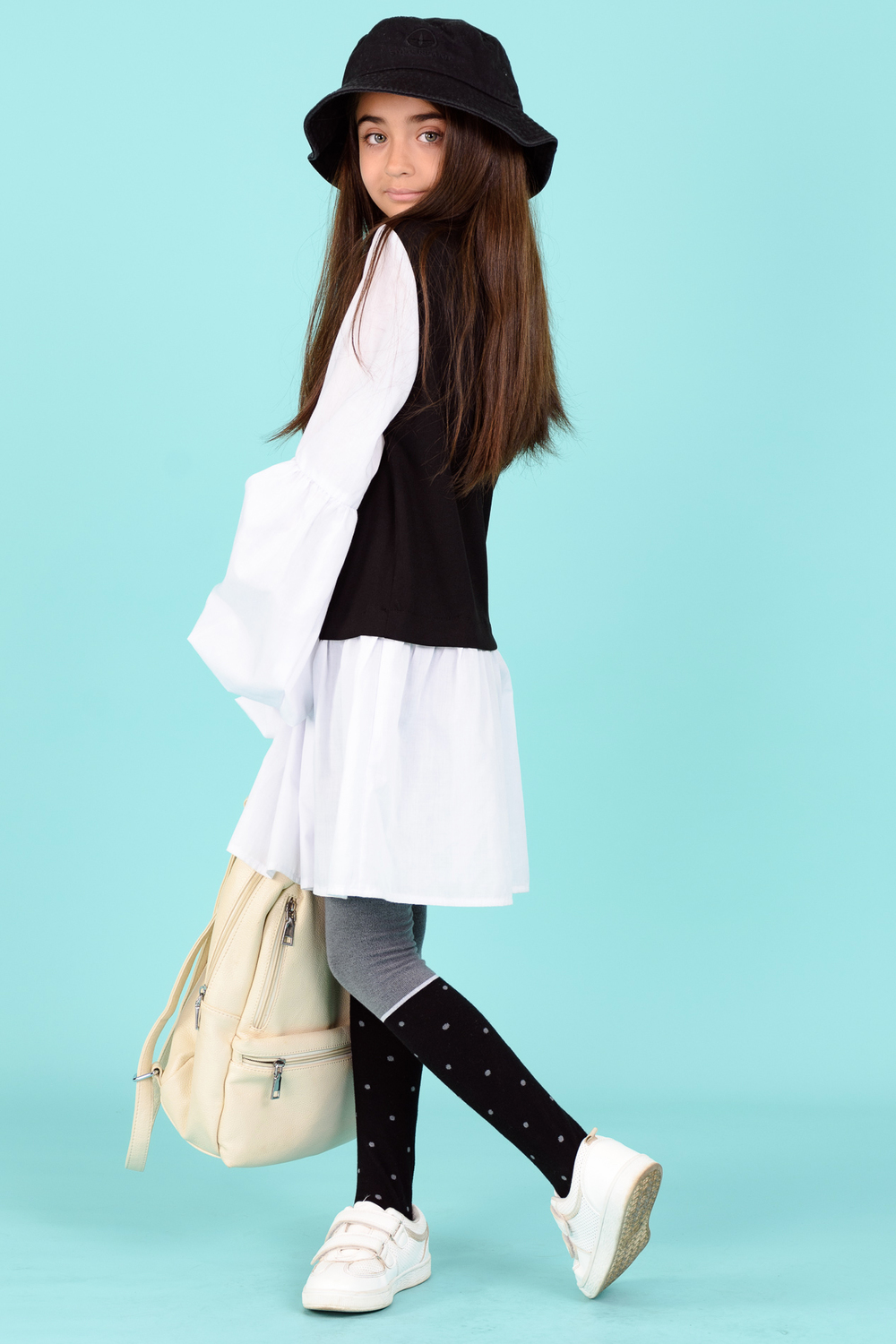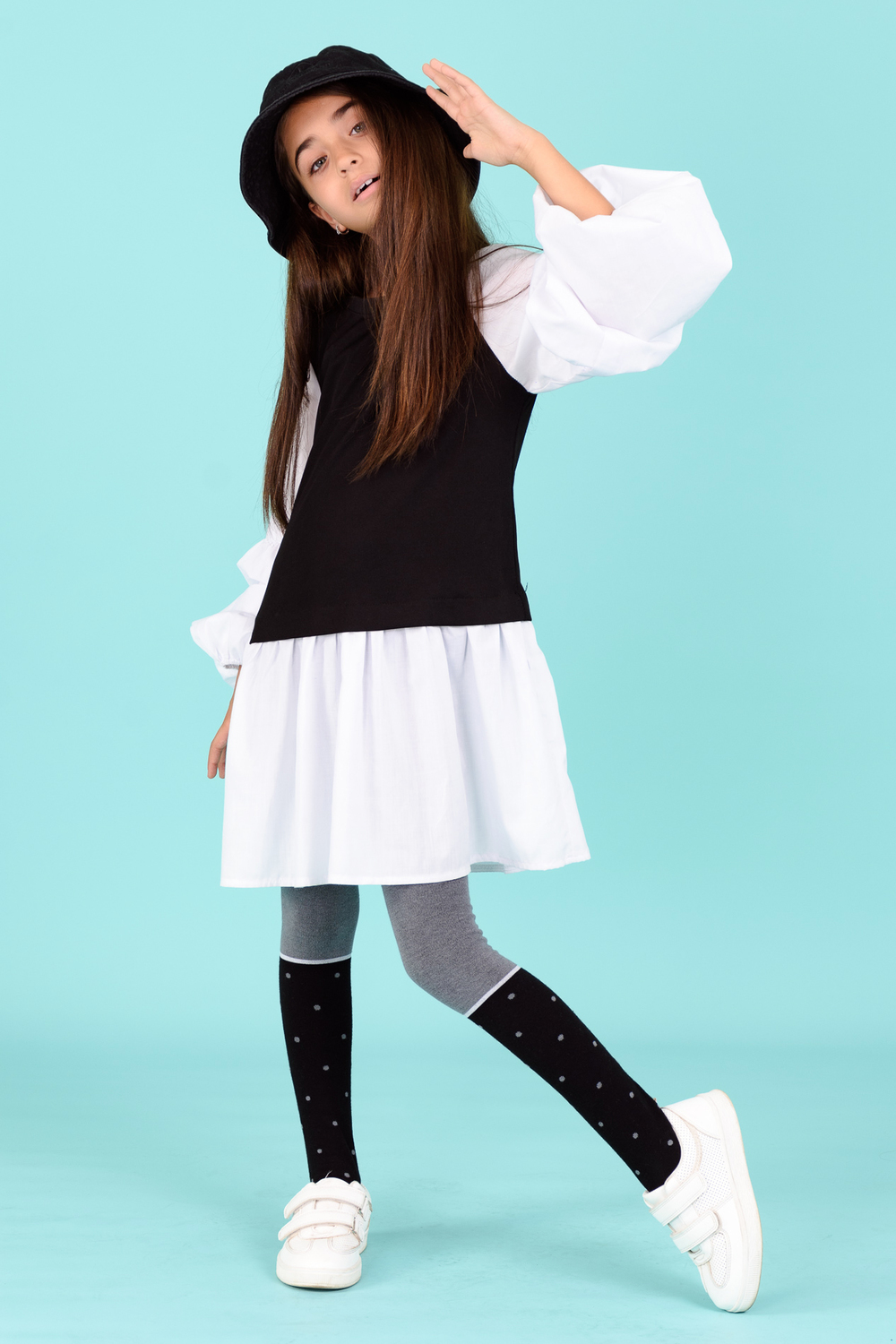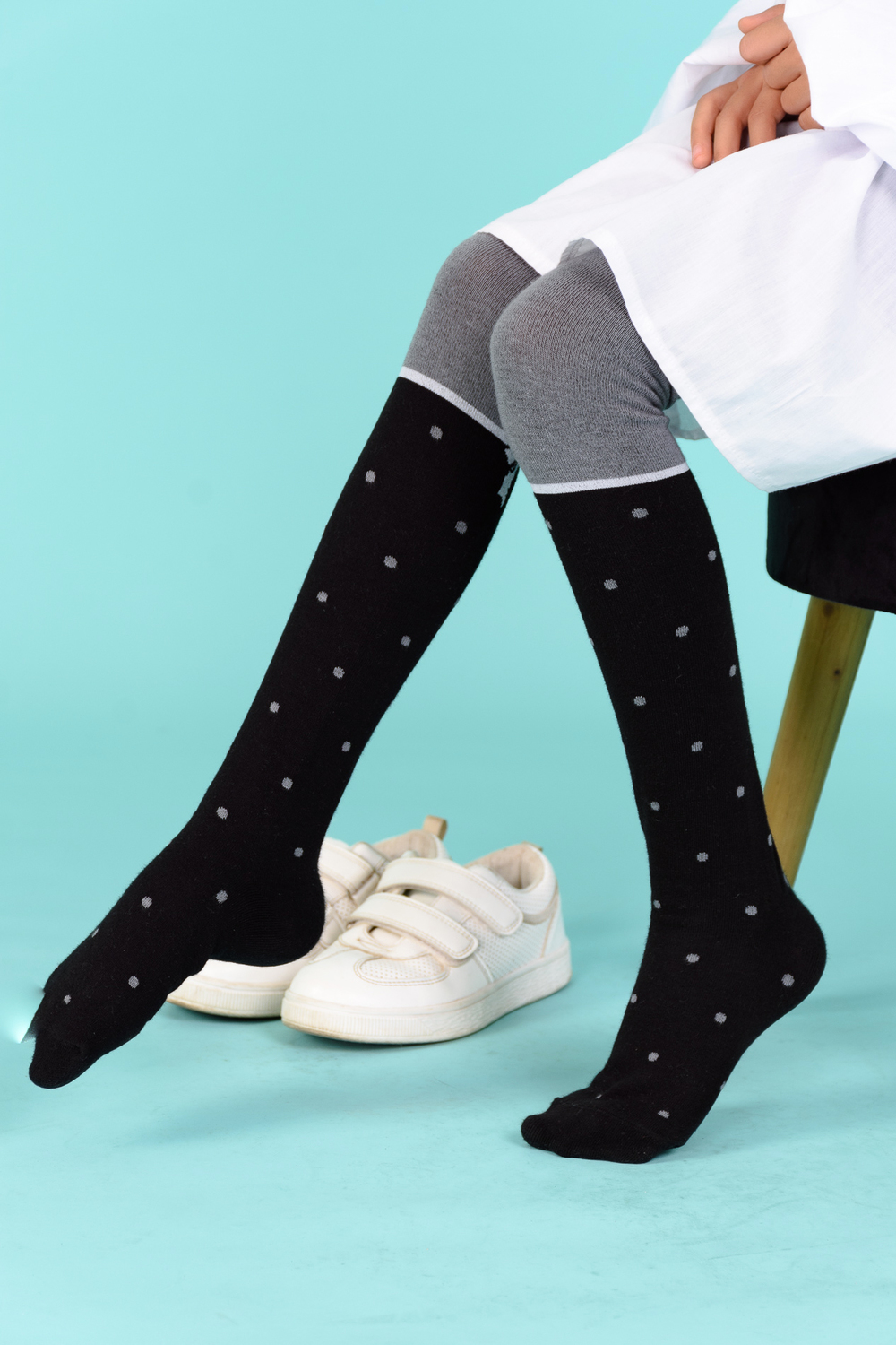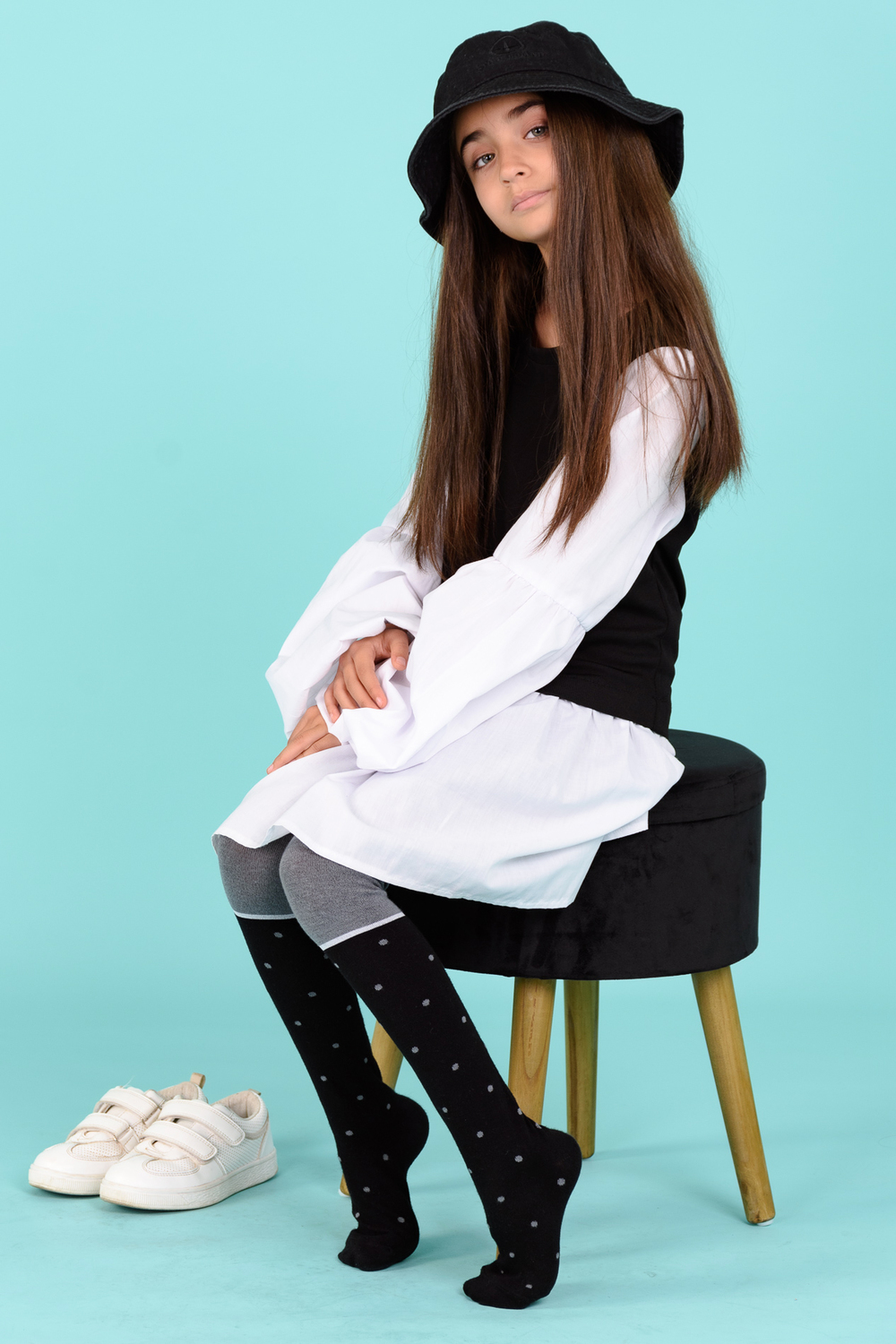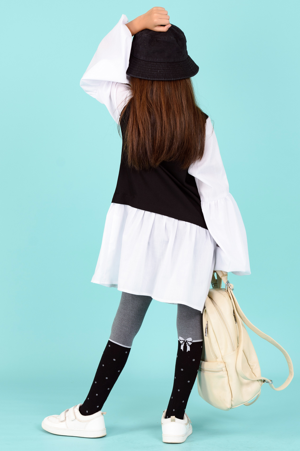 Колготки подростковые в лаконичных расцветках. Верх однотонный серый, низ черный в серый горошек с милым бантиком сзади. Спокойный дизайн и расцветка колготок отлично подойдут для стильного школьного образа.