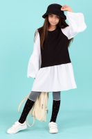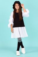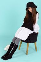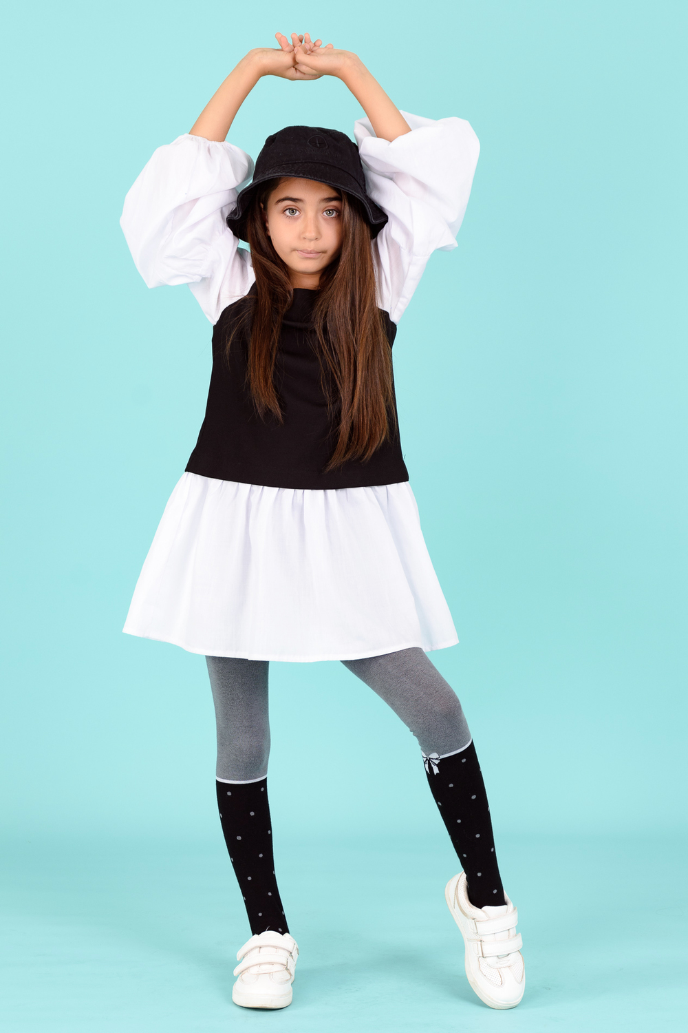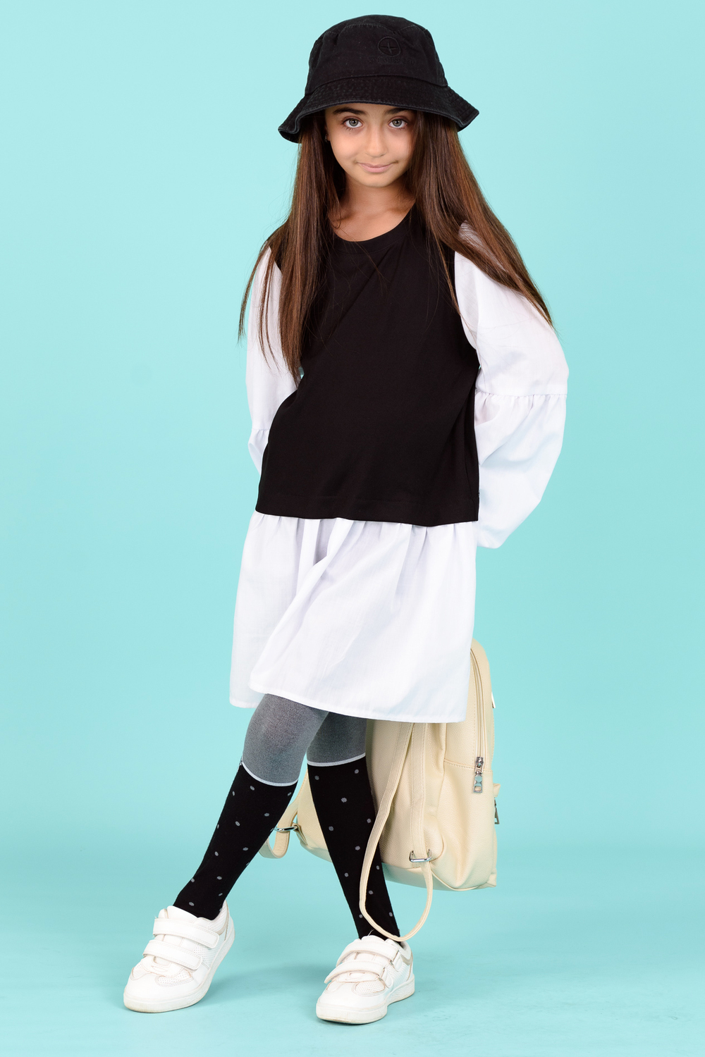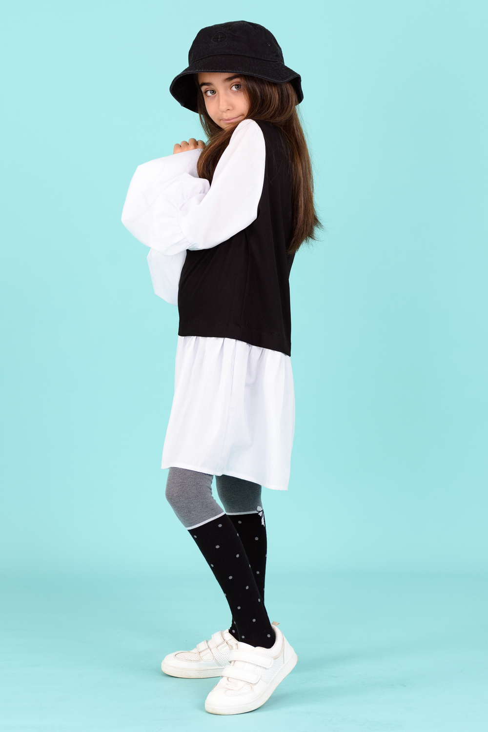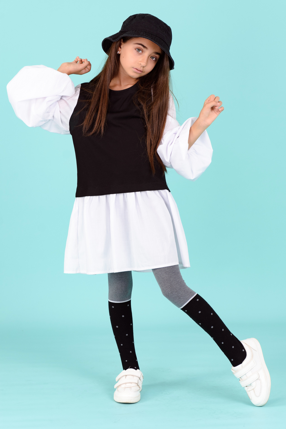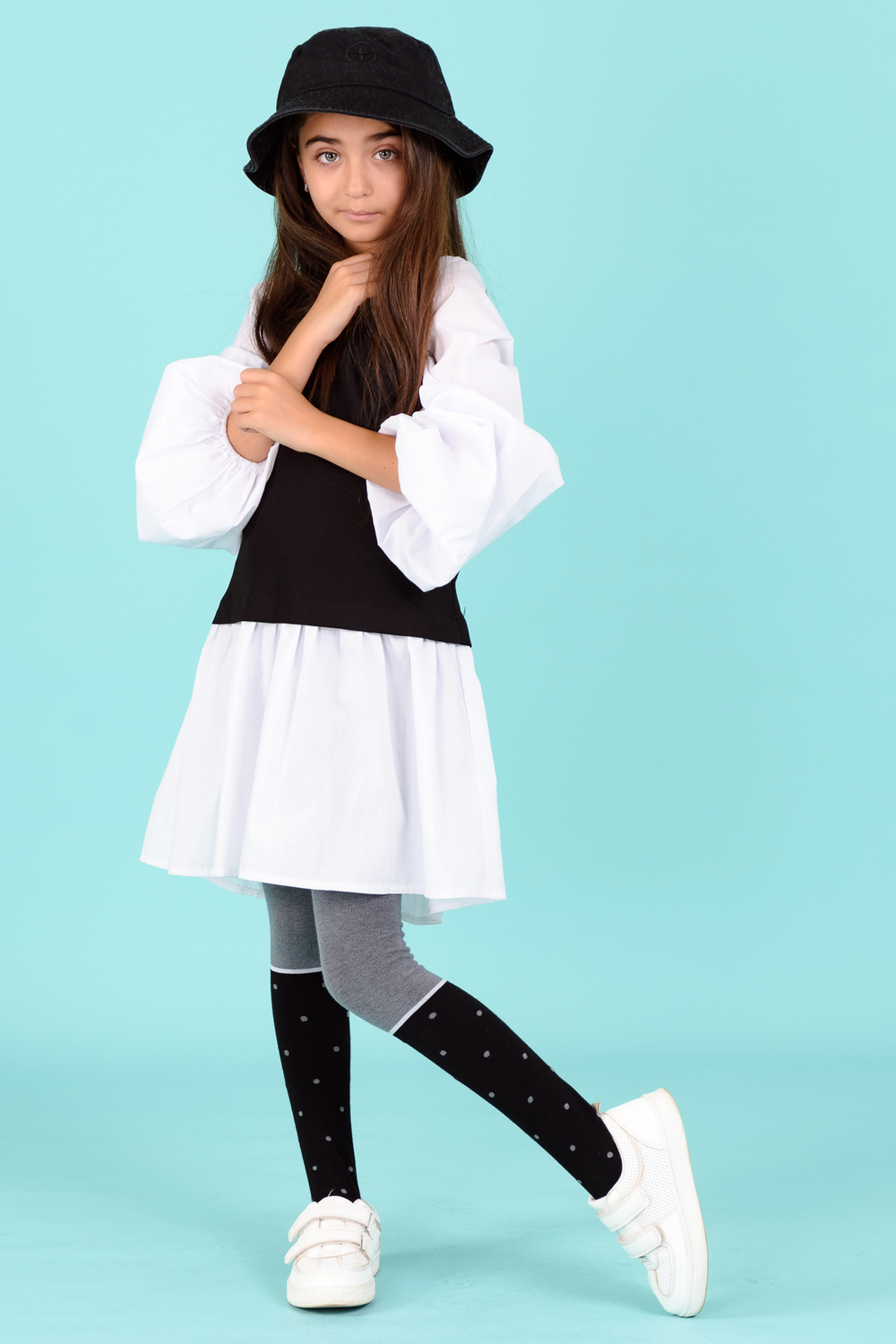 Колготки подростковые в лаконичных расцветках. Верх однотонный серый, низ черный в серый горошек с милым бантиком сзади. Спокойный дизайн и расцветка колготок отлично подойдут для стильного школьного образа.