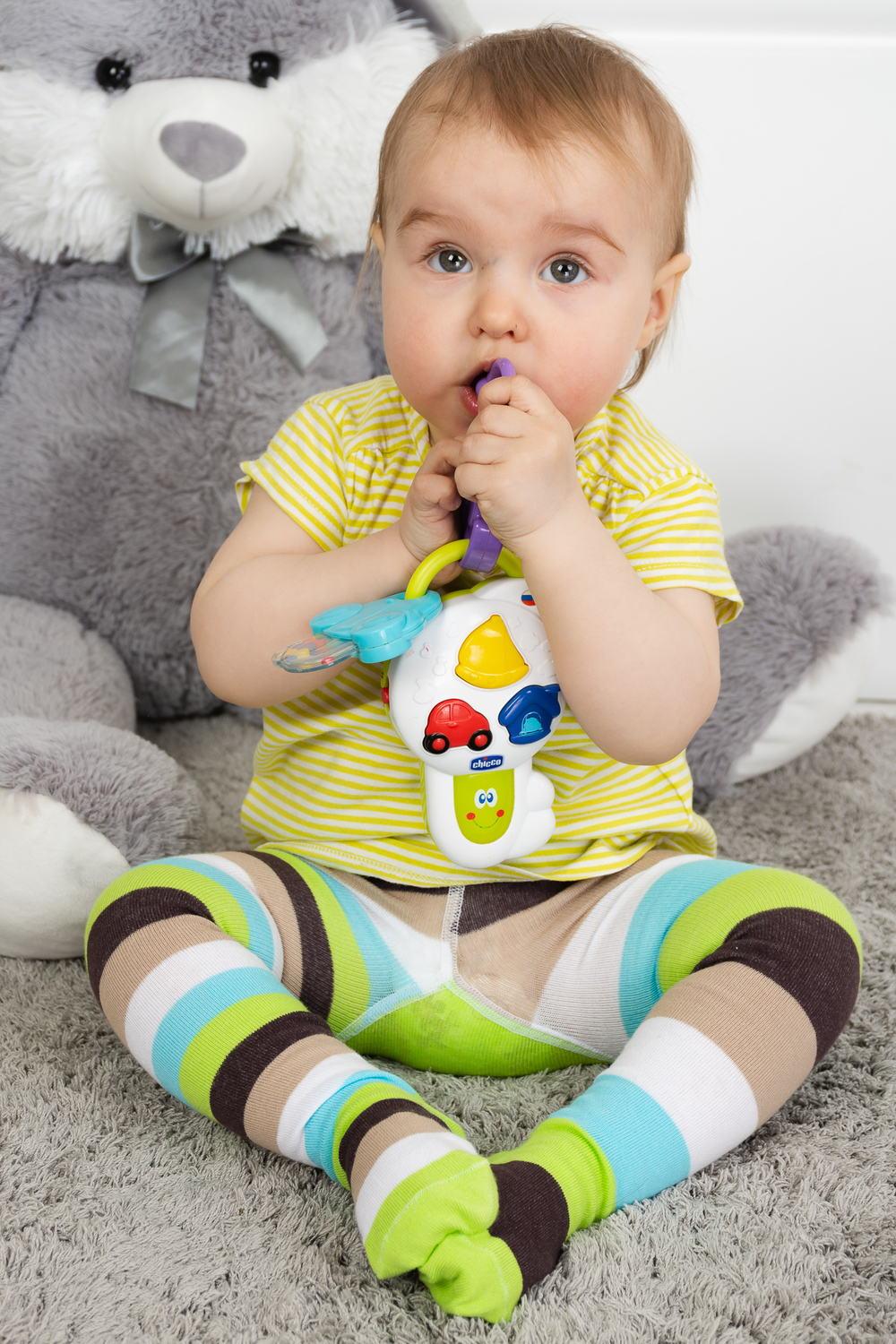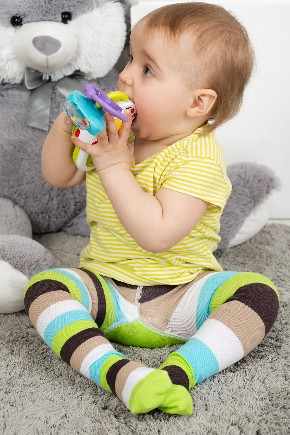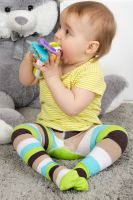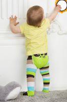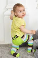 Яркие колготки для малышей. Оригинальная расцветка в полоску - по одной ножке широкая полоса, по другой - узкая. Сзади вывязана веселая мордочка