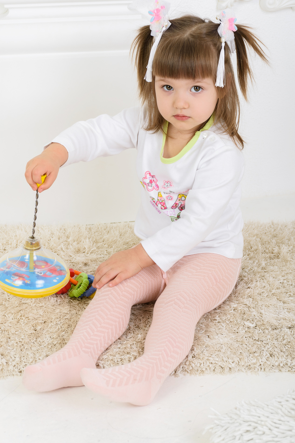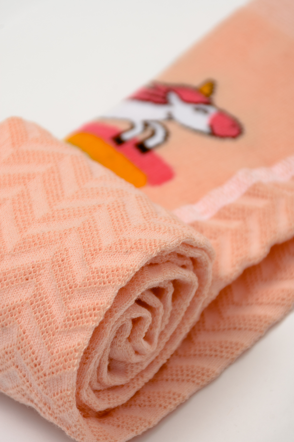 Очаровательные колготки в нежных оттенках. По всем поверхности вывязан узор, сзади - рисунок в виде единорога на радуге