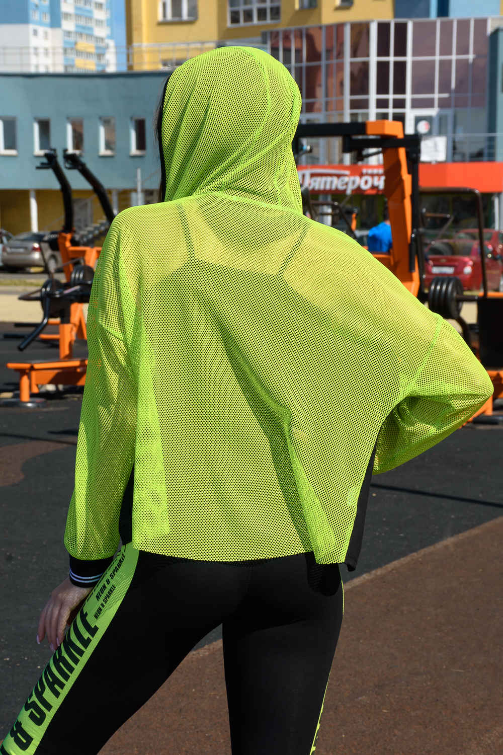 Комплект состоит из толстовки и майки. Толстовка прямая, свободная, с капюшоном из сетки, на молнии. Рукав длинный, из сетки, на эластичном манжете. Спинка удлиненная, из сетки. В верхней части полочки расположены кокетки из сетки. На полочку настрочены накладные карманы с клапанами из сетки. Майка на бретелях, полуприлегающая.