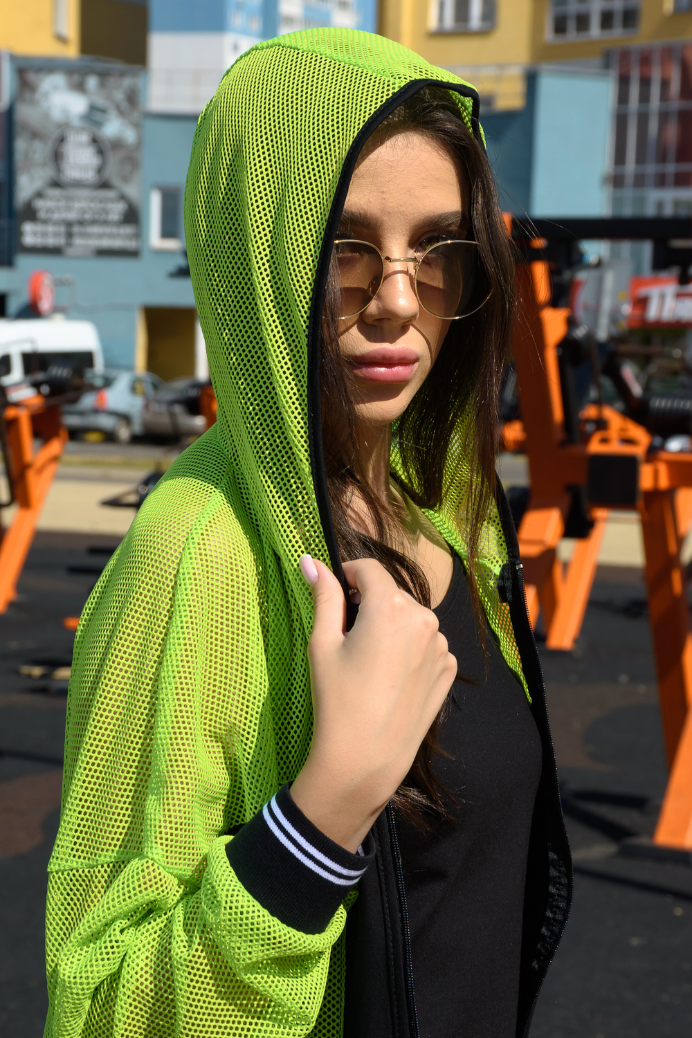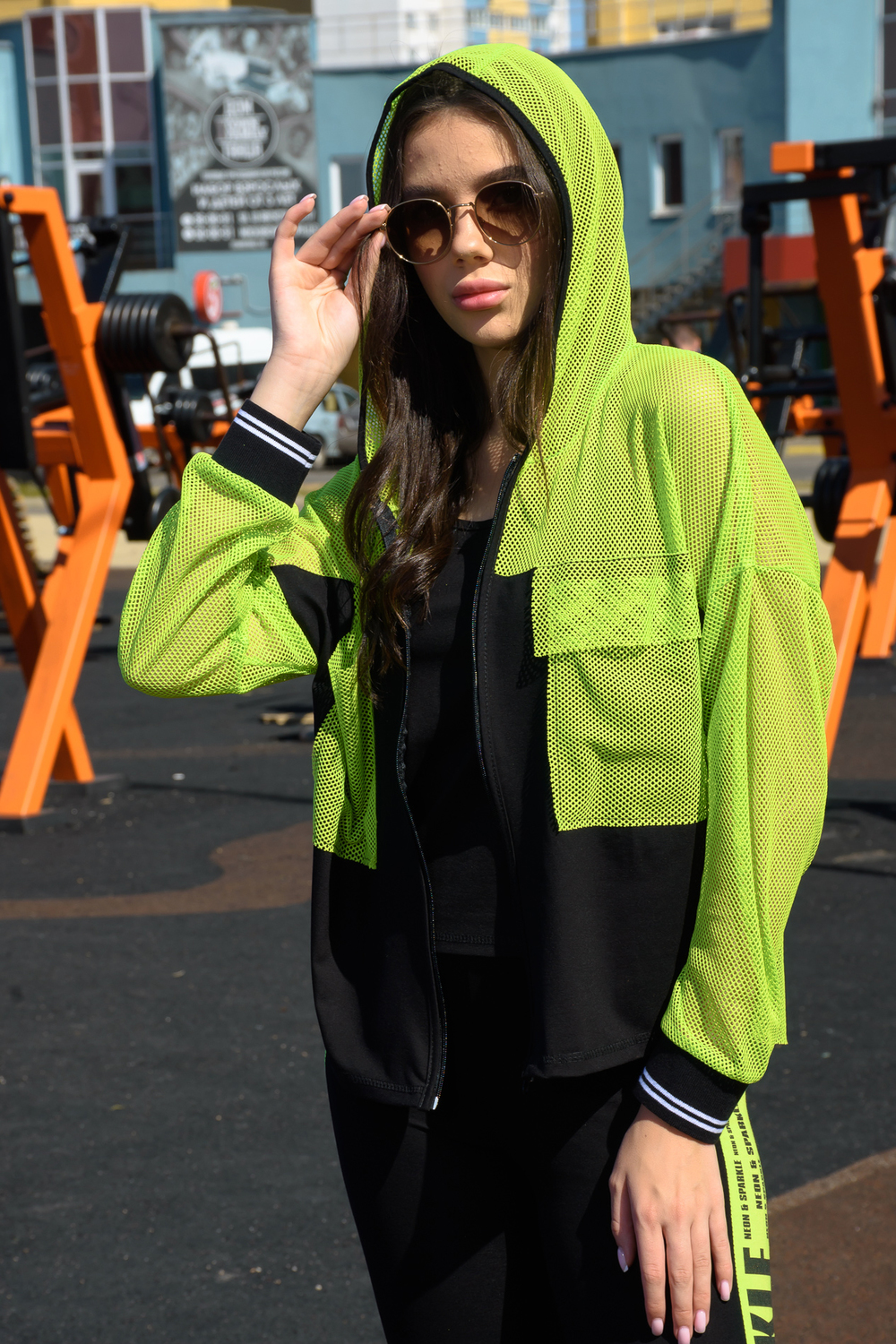 Комплект состоит из толстовки и майки. Толстовка прямая, свободная, с капюшоном из сетки, на молнии. Рукав длинный, из сетки, на эластичном манжете. Спинка удлиненная, из сетки. В верхней части полочки расположены кокетки из сетки. На полочку настрочены накладные карманы с клапанами из сетки. Майка на бретелях, полуприлегающая.