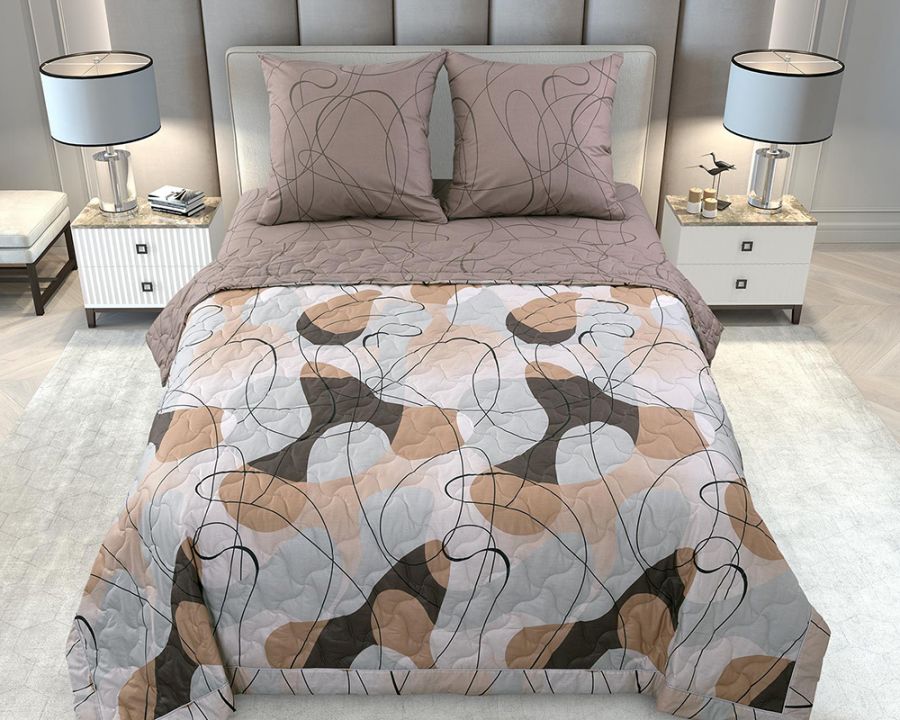 Комплект для сна изготовлен из перкаля. Ткань отличается плотной и тонкой фактурой, высокими эстетическими и практическими качествами, приятна на ощупь и очень комфортна. По прочности перкаль превосходит многие материалы, выполненные из более толстых волокон. Уникальность комплекта для сна заключается в том, что вместо традиционного пододеяльника и наволочек в комплект входит тонкое стеганое одеяло, выполненное из ткани того же дизайна, что и основной комплект. Преимущества данного комплекта в том, что стёганые изделия практичны в использовании. Заправленные подушки в стеганые наволочки можно использовать как декоративные. А одеяло одновременно полностью справиться с функцией покрывала. Цвет ткани может незначительно отличаться от фото. Характеристики размера 1,5 спальный: Размер наволочек 70х70 (2 шт) (молния) Размер простыни 180х220 (1шт) (без резинки) Размер одеяла 140х205 (1 шт) Характеристики размера 2 спальный с европростыней: Размер наволочек 70х70 (2 шт) (молния) Размер простыни 220х240 (1шт) (без резинки) Размер одеяла 172х205 (1 шт) Характеристики размера Евро: Размер наволочек 70х70 (2 шт) (молния) Размер простыни 220х240 (1шт) (без резинки) Размер одеяла 200х220 (1 шт)