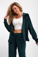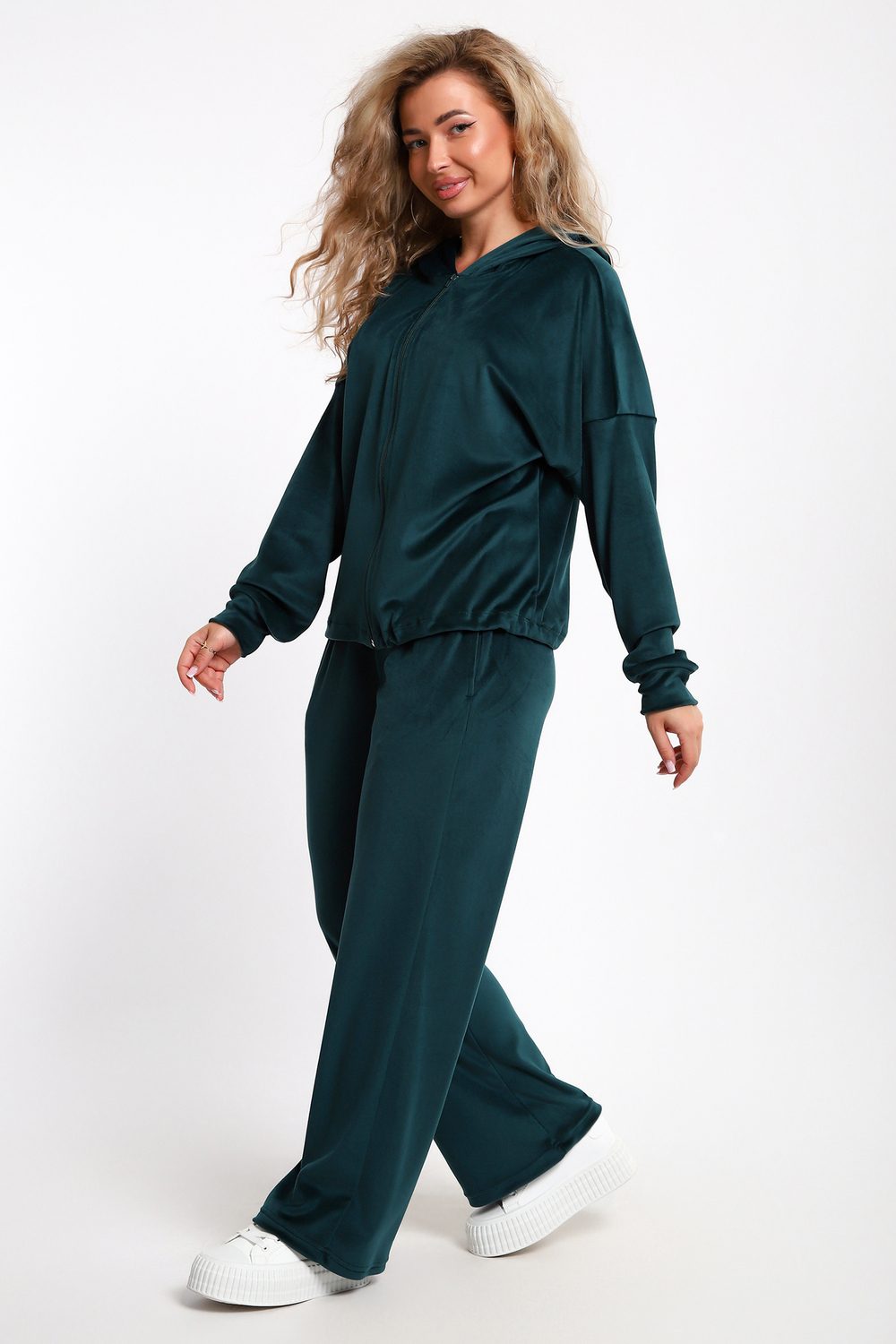 Костюм женский велюровый состоит из толстовки на молнии и брюк. Толстовка с глубоким капюшоном, по низу утягивающий шнур с фиксаторами, рукав спущенный с манжетом, брюки прямые с карманами. Костюм мягкий, удобный, отлично подойдет для дома, прогулок и отдыха.