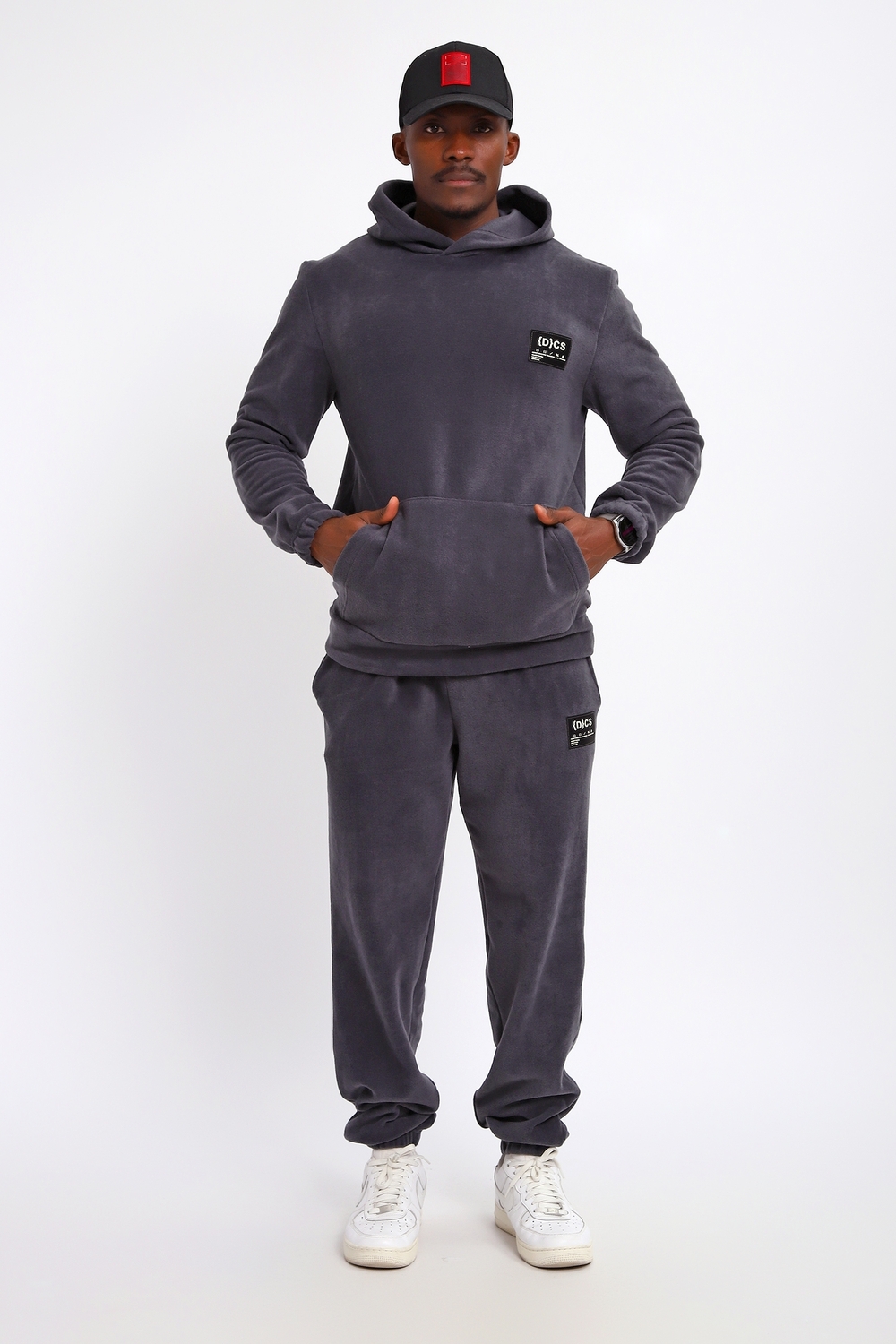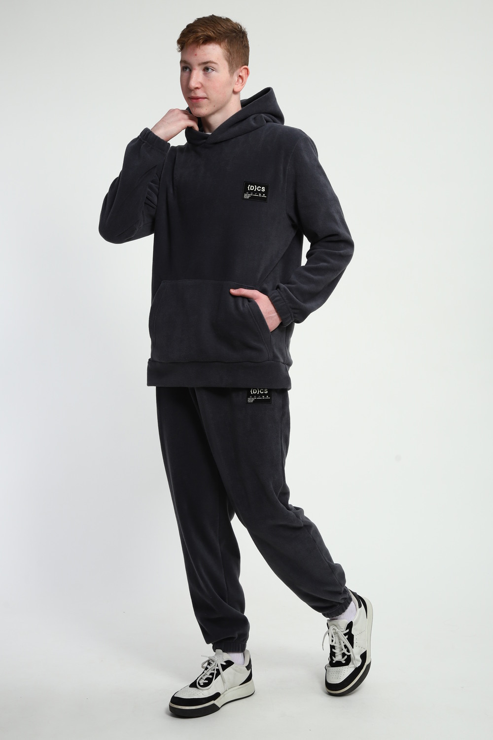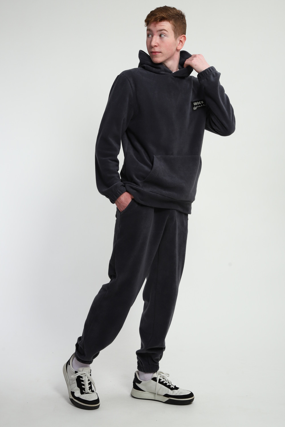 Костюм мужской из флиса состоит из брюк и толстовки с капюшоном. На кофте и брюках имеется нашивка, брюки с карманами в боках и сзади 1 накладной карман, толстовка с карманом-кенгуру. Костюм идеально подойдет на прохладную погоду.