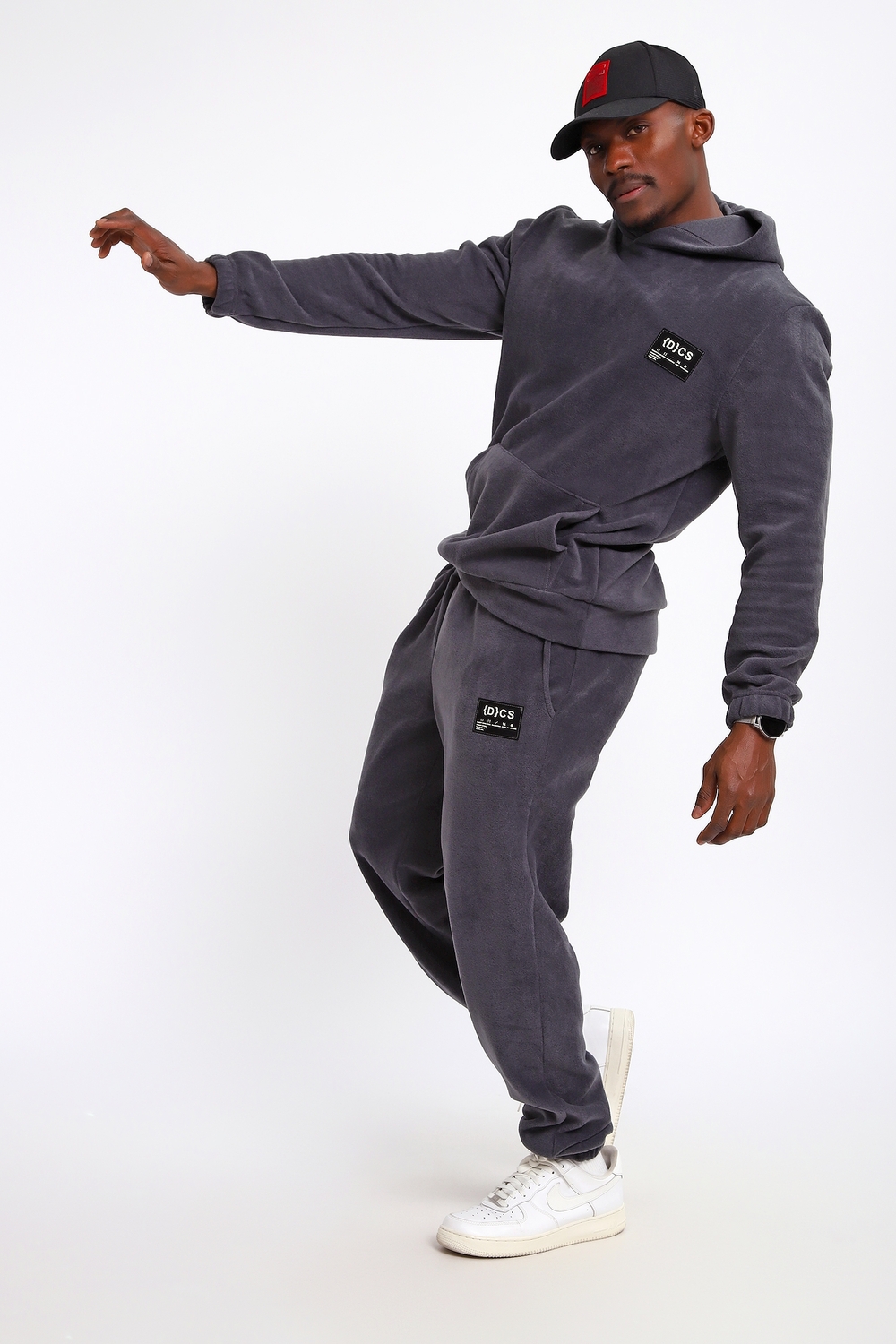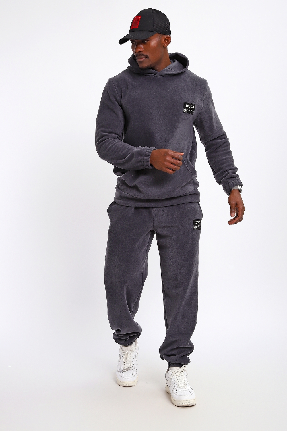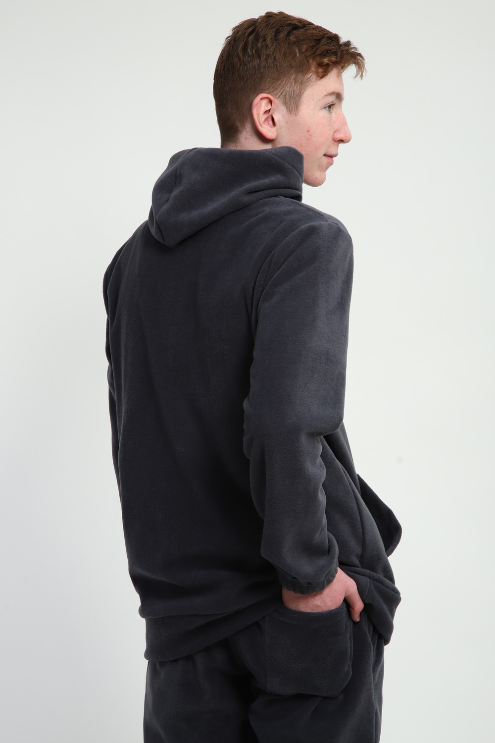 Костюм мужской из флиса состоит из брюк и толстовки с капюшоном. На кофте и брюках имеется нашивка, брюки с карманами в боках и сзади 1 накладной карман, толстовка с карманом-кенгуру. Костюм идеально подойдет на прохладную погоду.