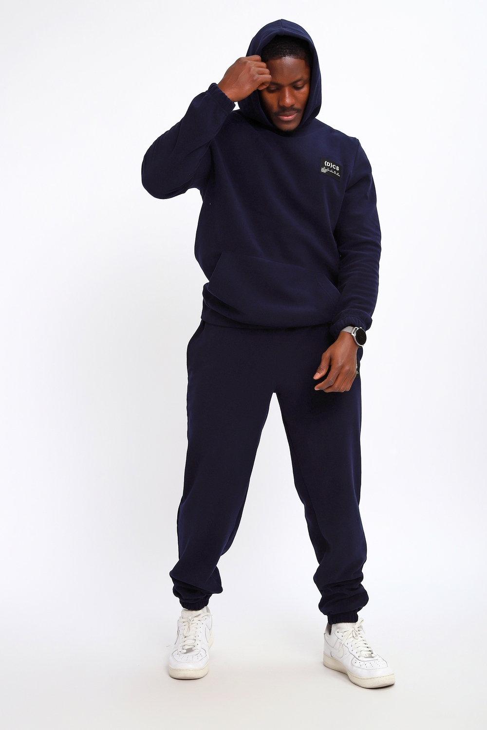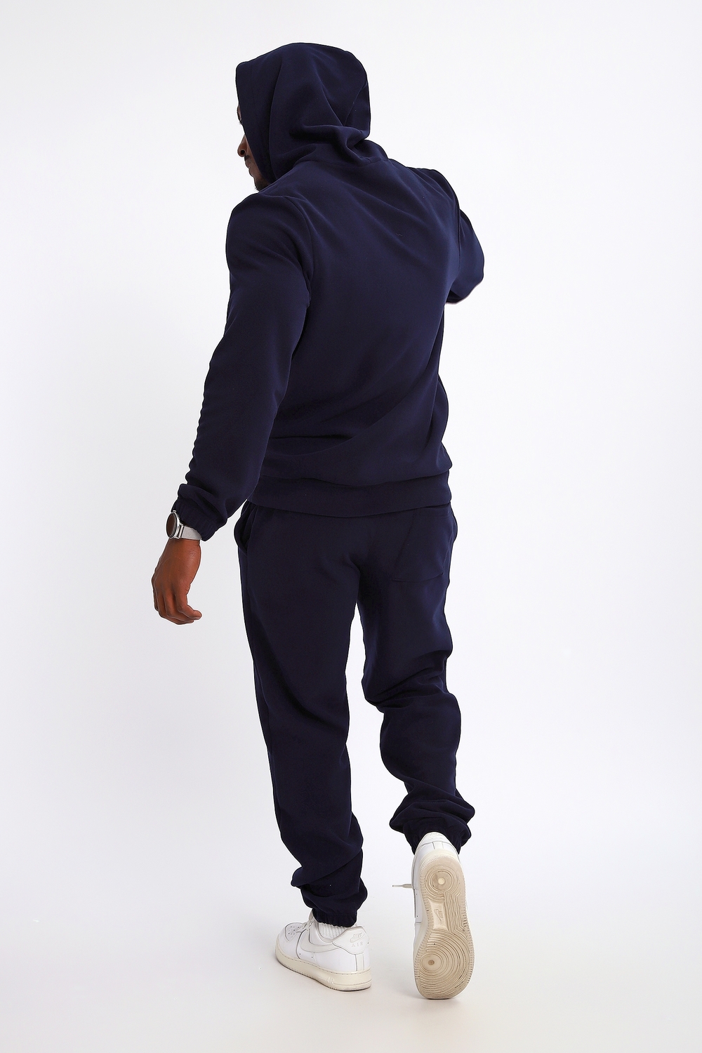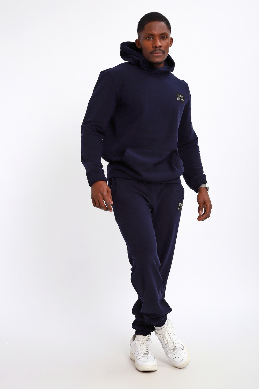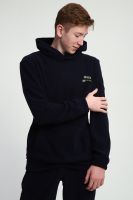 Костюм мужской из флиса состоит из брюк и толстовки с капюшоном. На кофте и брюках имеется нашивка, брюки с карманами в боках и сзади 1 накладной карман, толстовка с карманом-кенгуру. Костюм идеально подойдет на прохладную погоду.