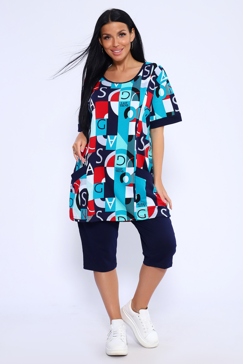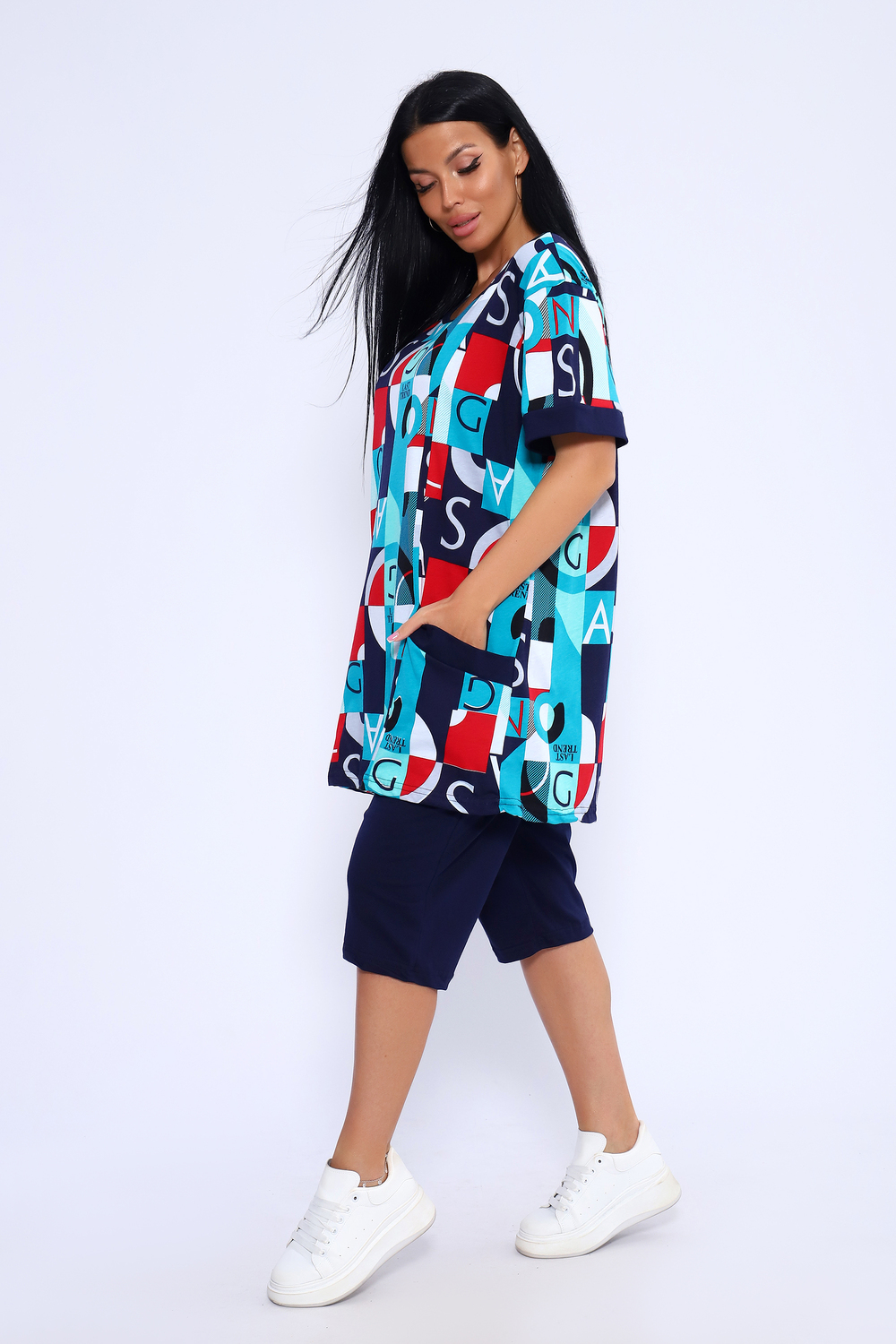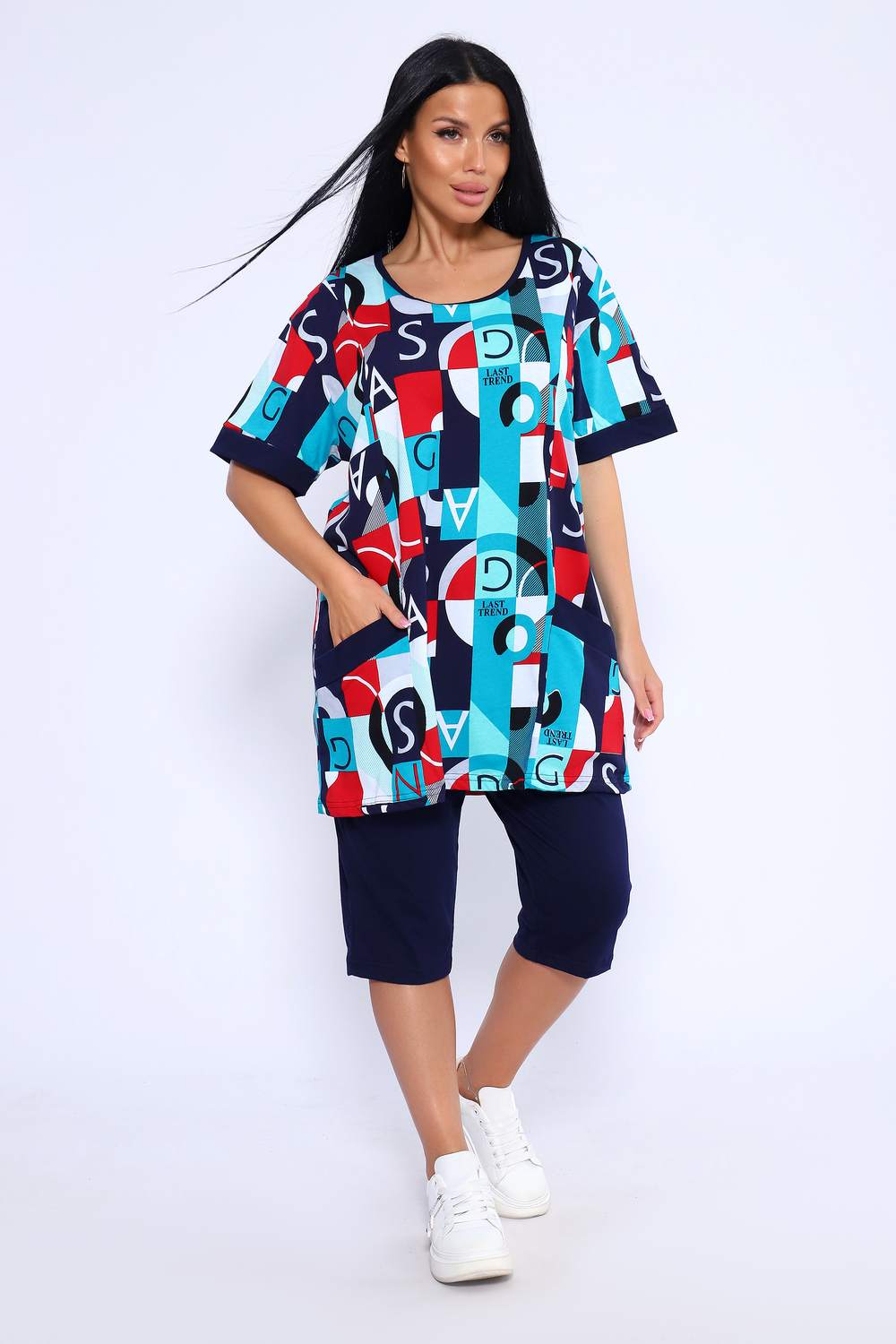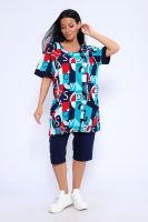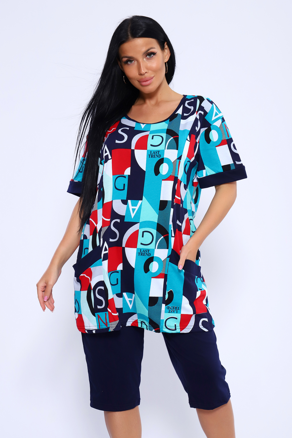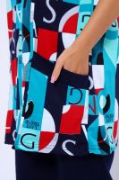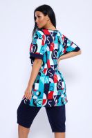 Костюм состоит из туники и бридж. Бриджи с карманами, длиной ниже колена. Туника с короткими рукавами на манжетах. Полочка с отрезными бочками и накладными карманами.