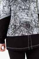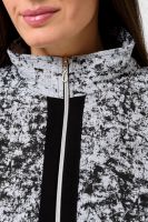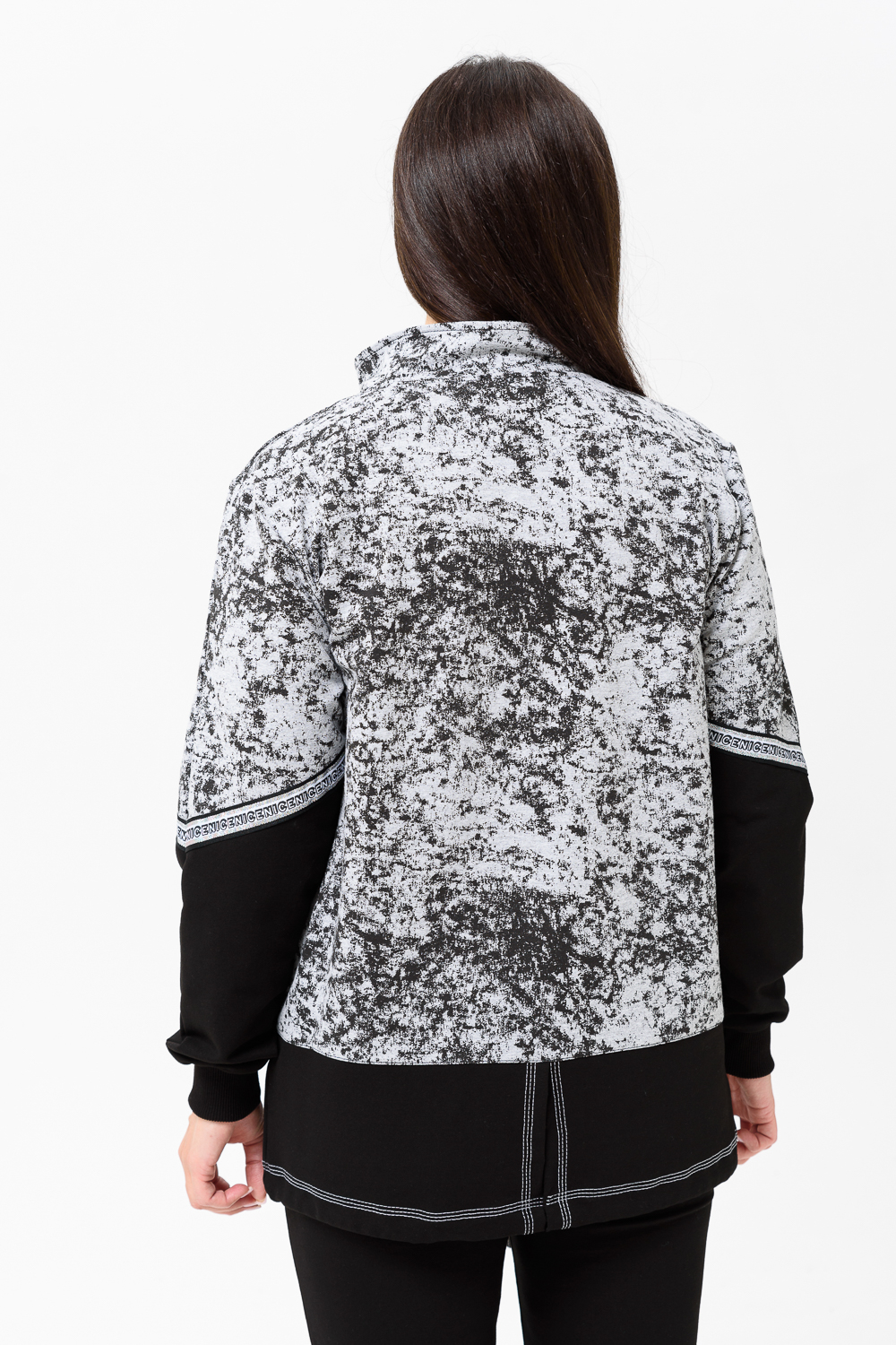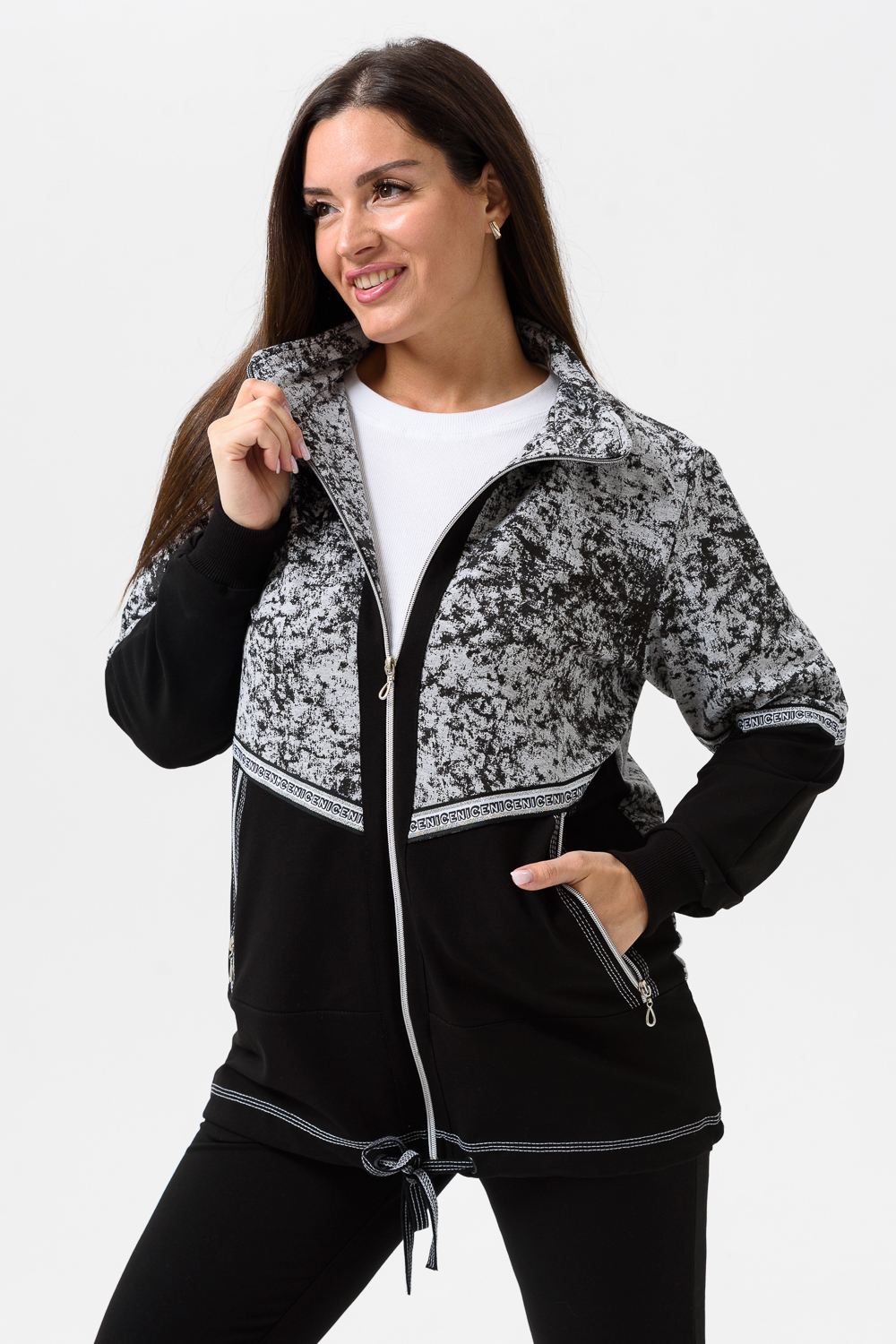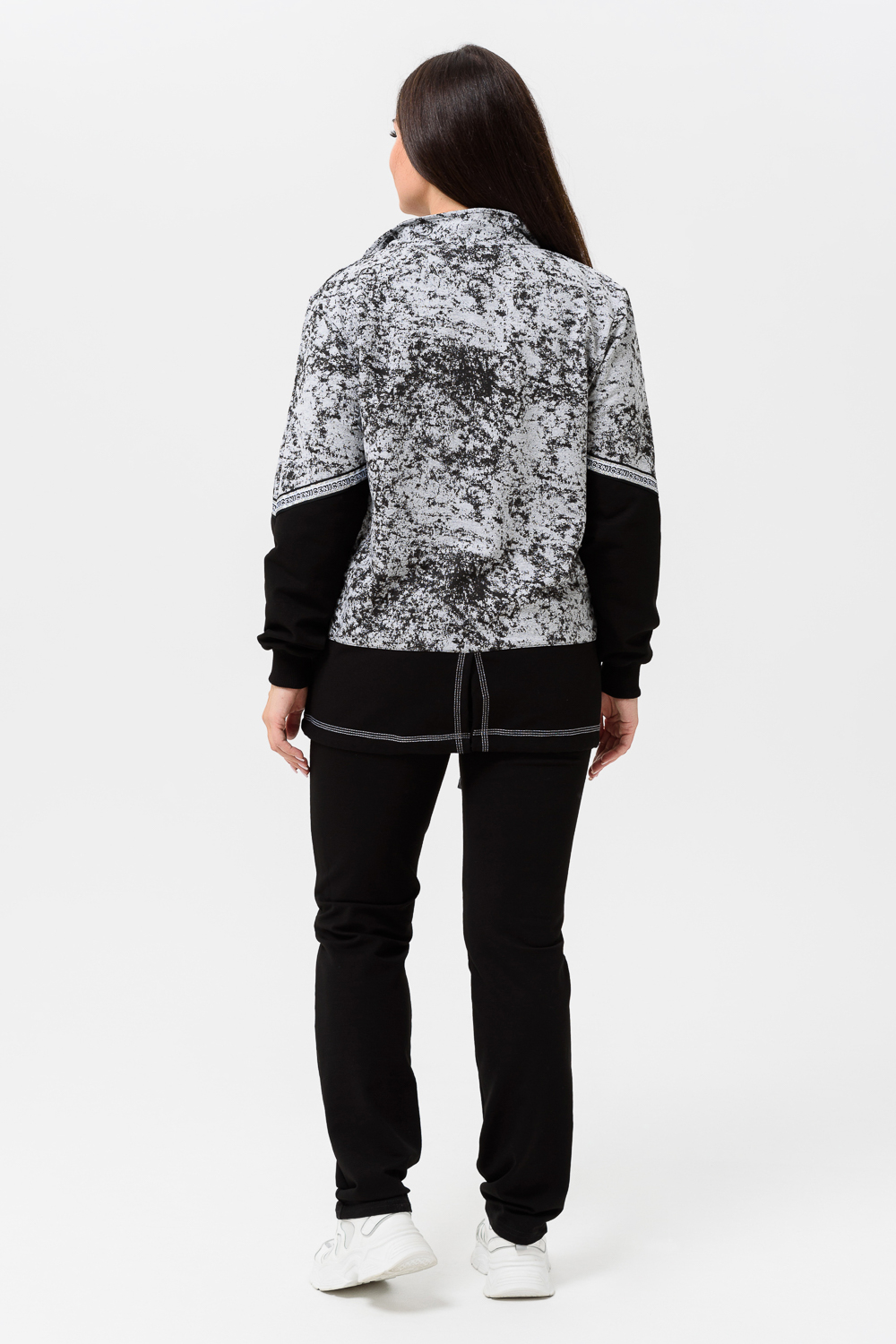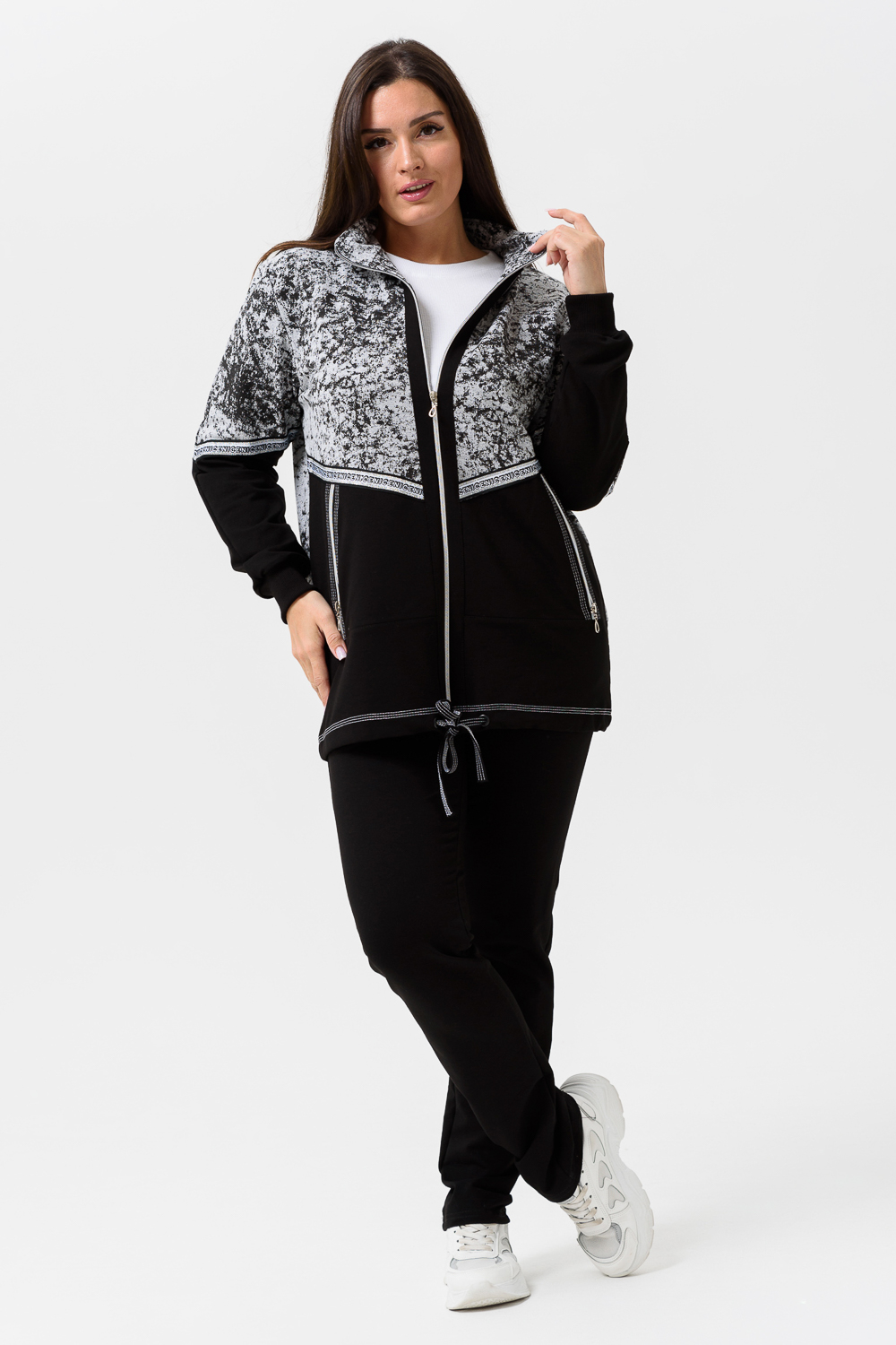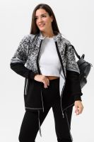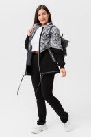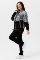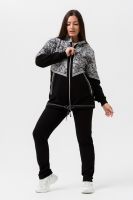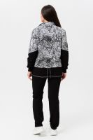 Костюм женский куртка и брюки. Куртка прямого силуэта с втачным рукавом на манжете из кашкорсе. Застежка на тесьму-молнию. Верхние части куртки и верхние части рукавов из набивной ткани с космическим принтом. Воротник-стойка. Нижняя часть полочки и спинки из однотонной ткани затягивается шнуром. На полочке карманы на молнии. Брюки прямые, слегка зауженные к низу