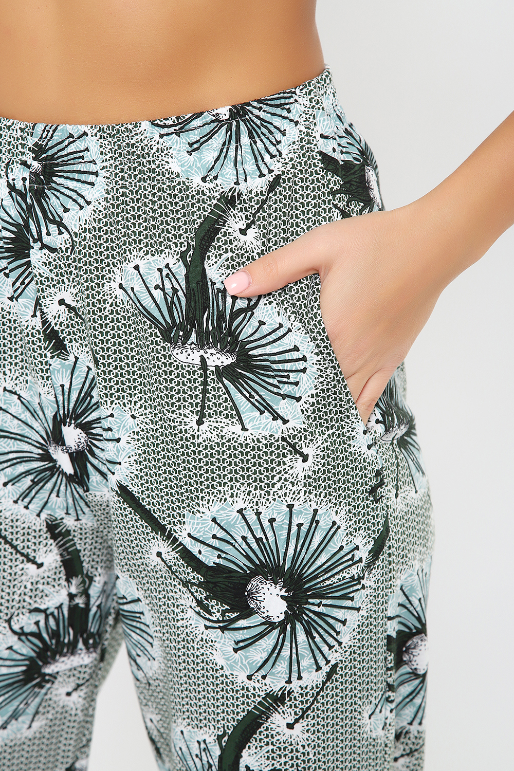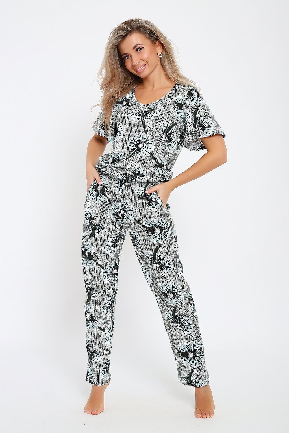 Домашний костюм состоит из футболки и брюк. Брюки с карманами. Футболка с короткими рукавами - крылышками. Комфортен для повседневной носки.