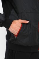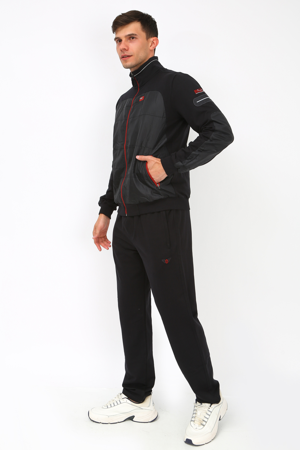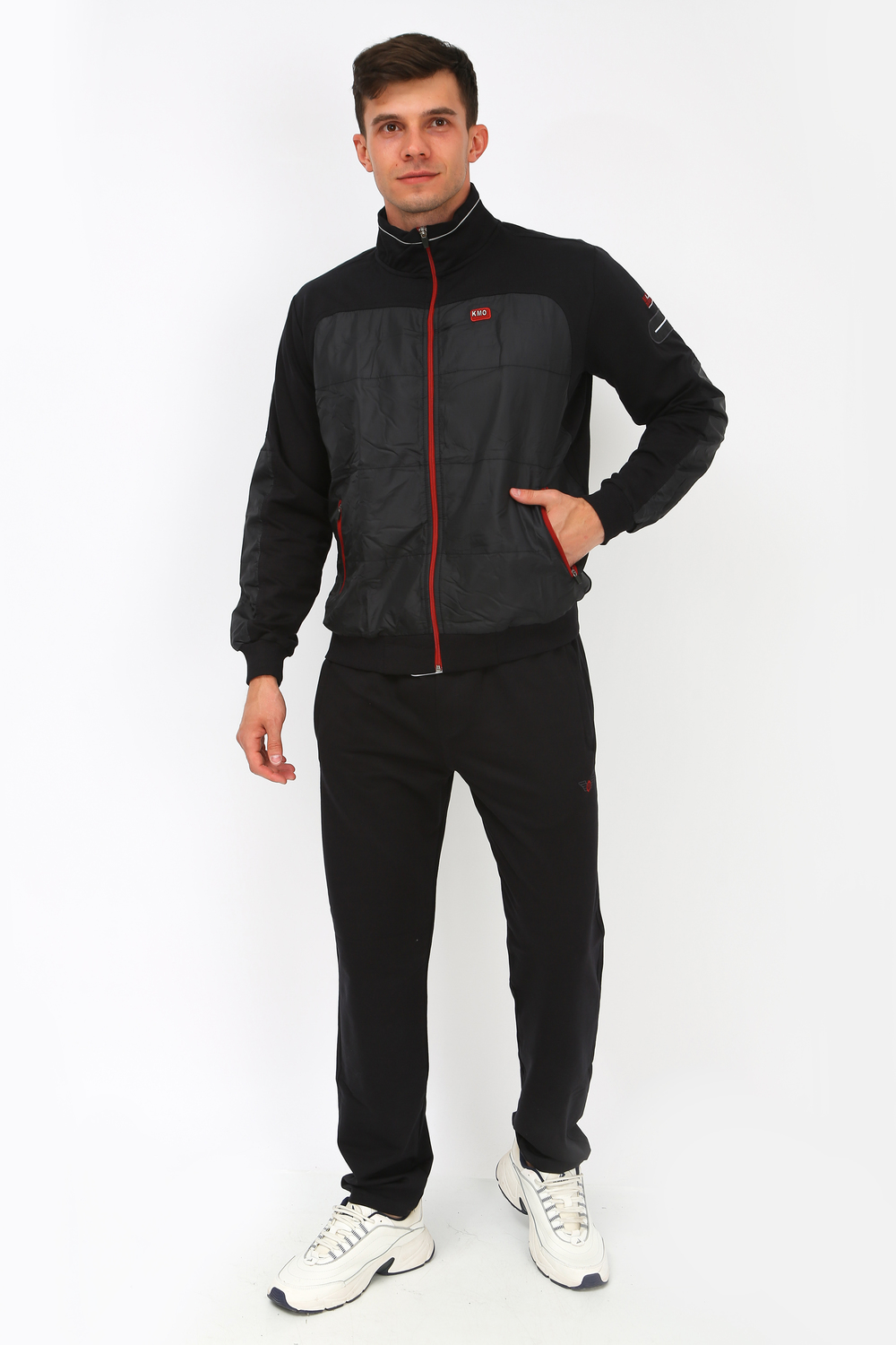 Спортивный мужской костюм. Кофта на молнии, спереди и на рукавах декоративная вставка из плащевки, сбоку вышивка с надписью. Воротник - стойка, низ кофты и рукава на резинке. Брюки прямого кроя, карманы на молнии. Турецкая ткань.