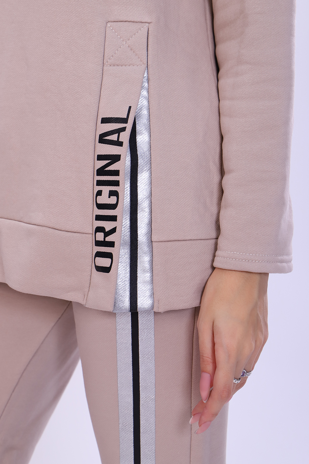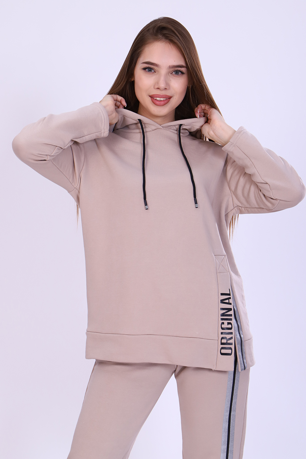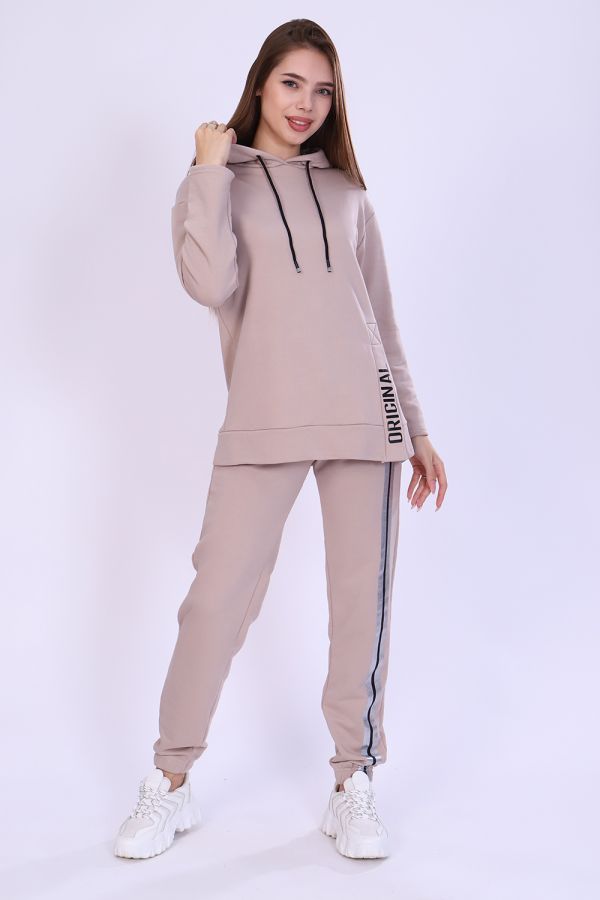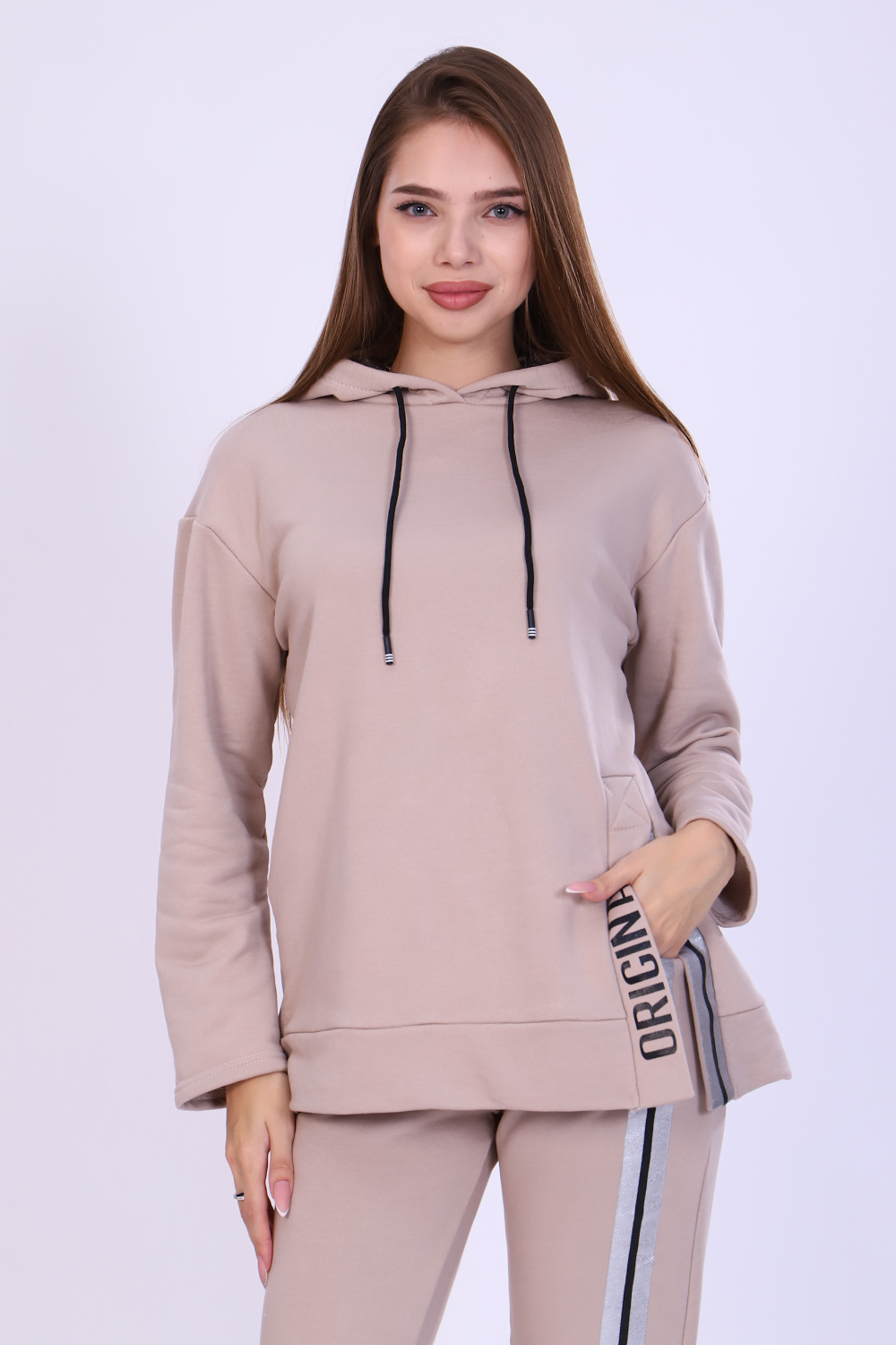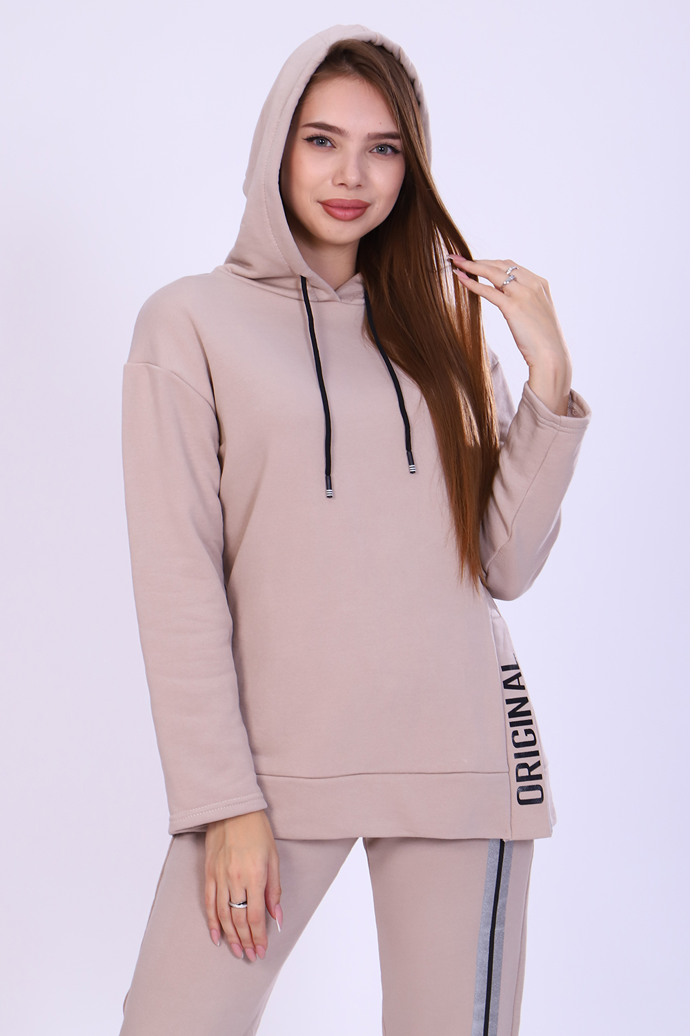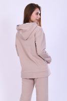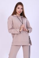 Костюм женский с принтом из футера 3-х нитки петля качества пенье. Свободная толстовка с капюшоном, обработанным внутри стильной тканью бифлекс; спущенная пройма, длинный рукав, низ передней полочки декорирован шлицей и принтом в виде надписи. Брюки прямые, полуприлегающего силуэта на распошитом поясе с удобными карманами, слегка зауженные к низу на резинке, украшены принтом в виде имитации лампаса, Тёплый, стильный костюм сделает ваш образ неповторимым. Это отличный выбор на холодную погоду. Благородные цвета изделия придают ему роскоши и элегантности.