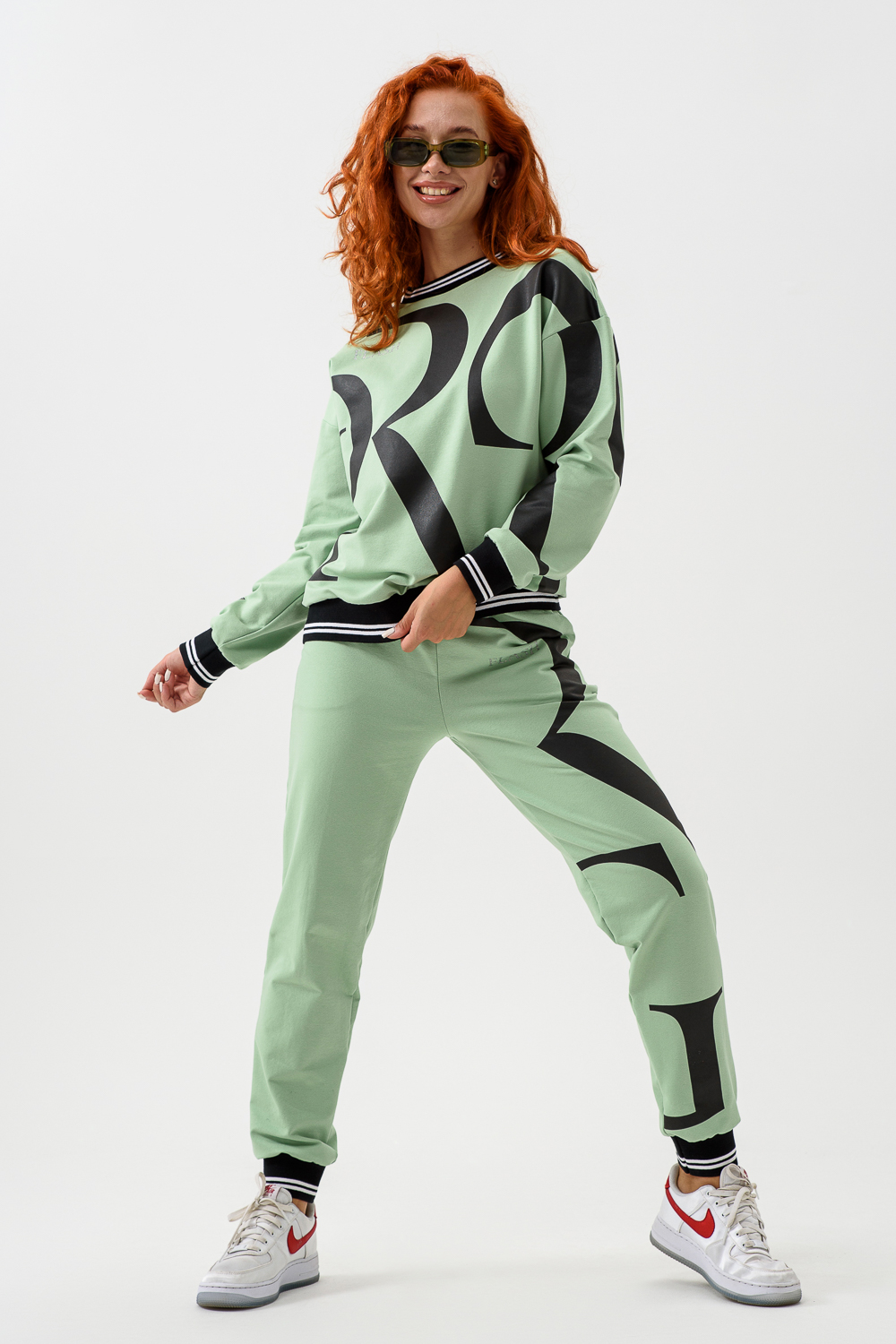 Женский костюм с брюками и толстовкой. Материал футер 2-х нитка с лайкрой. По все длине брюк и толстовки печать. Толстовка с манжетами, по низу брюк резинка.