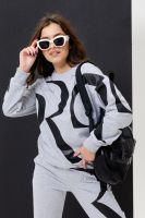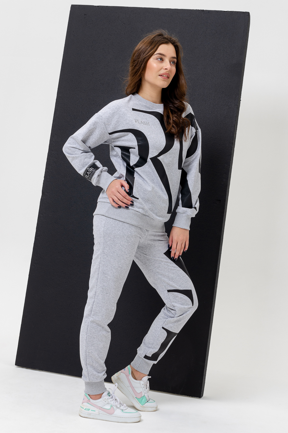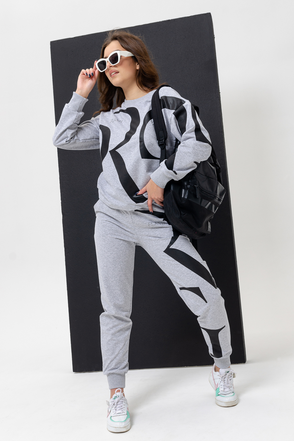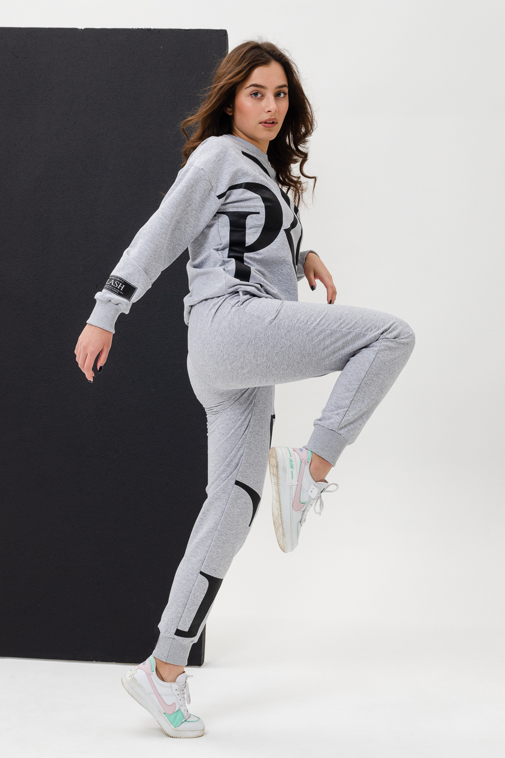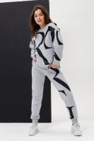 Женский костюм с брюками и толстовкой. Материал футер 2-х нитка с лайкрой. По все длине брюк и толстовки печать. Толстовка с манжетами, по низу брюк резинка.