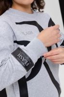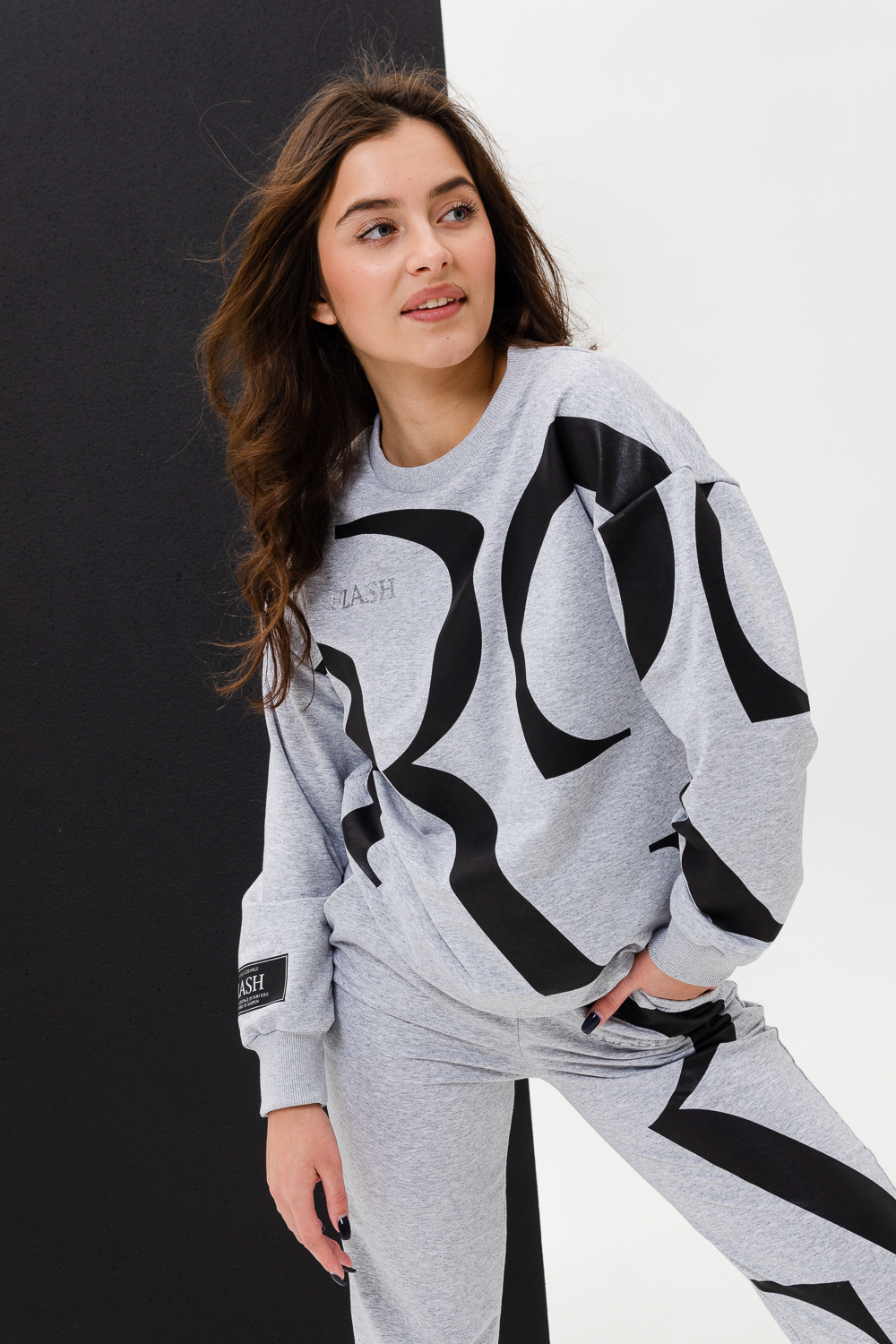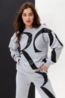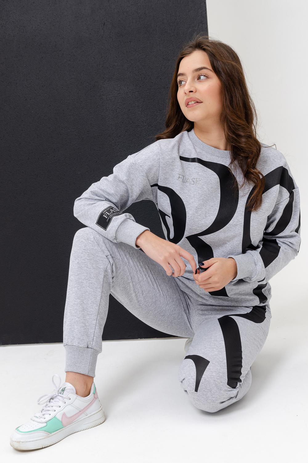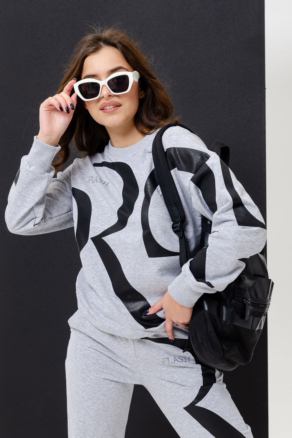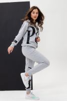 Женский костюм с брюками и толстовкой. Материал футер 2-х нитка с лайкрой. По все длине брюк и толстовки печать. Толстовка с манжетами, по низу брюк резинка.