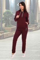 Костюм женский из футера 2-х нитки. Толстовка прямого силуэта, имеет капюшон, на полочке карман "кенгуру", рукав на резинке. Брюки без карманов, с манжетами. Толстовка оформлена декоративной тесьмой в капюшоне и декоративными петлями в поясе.
