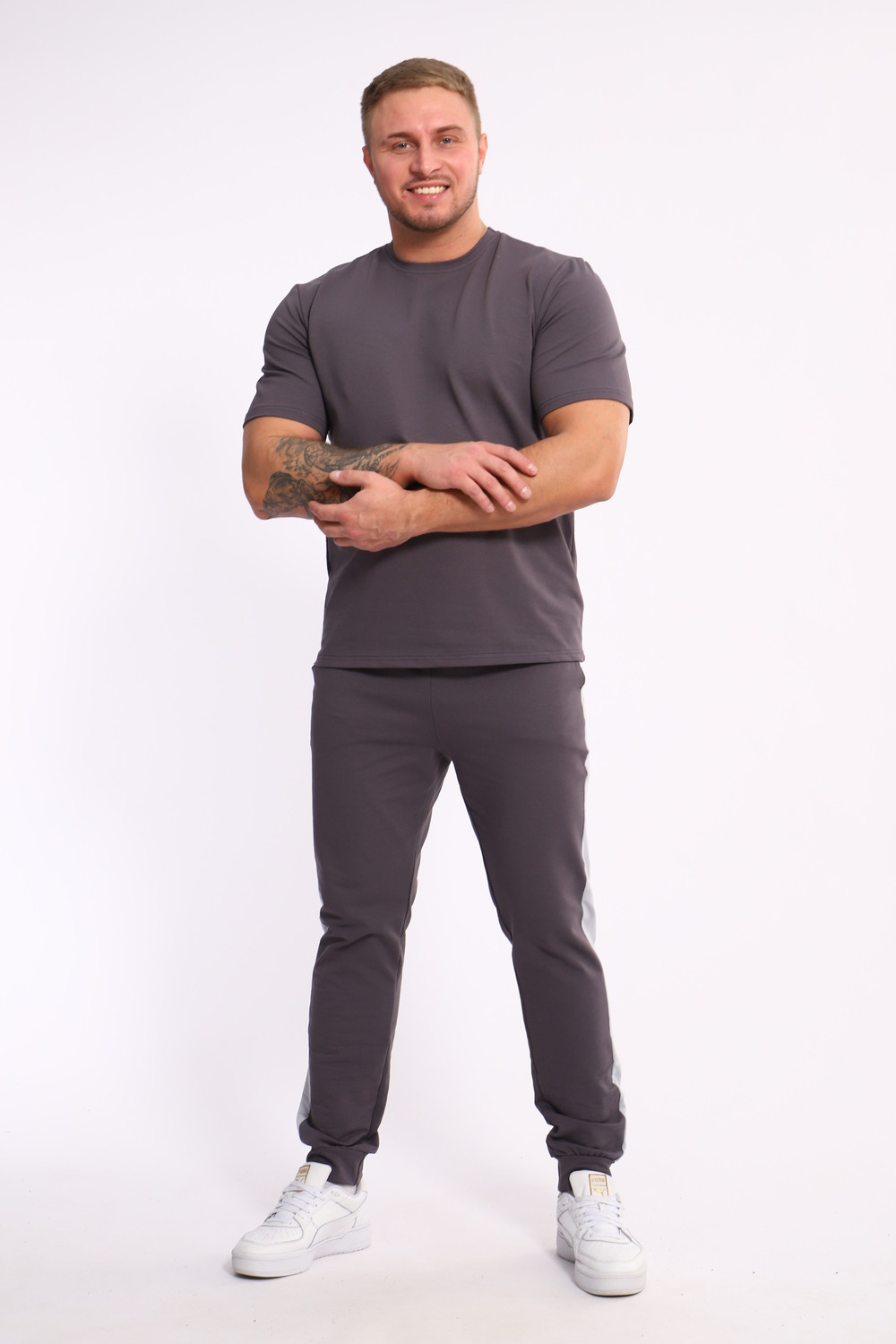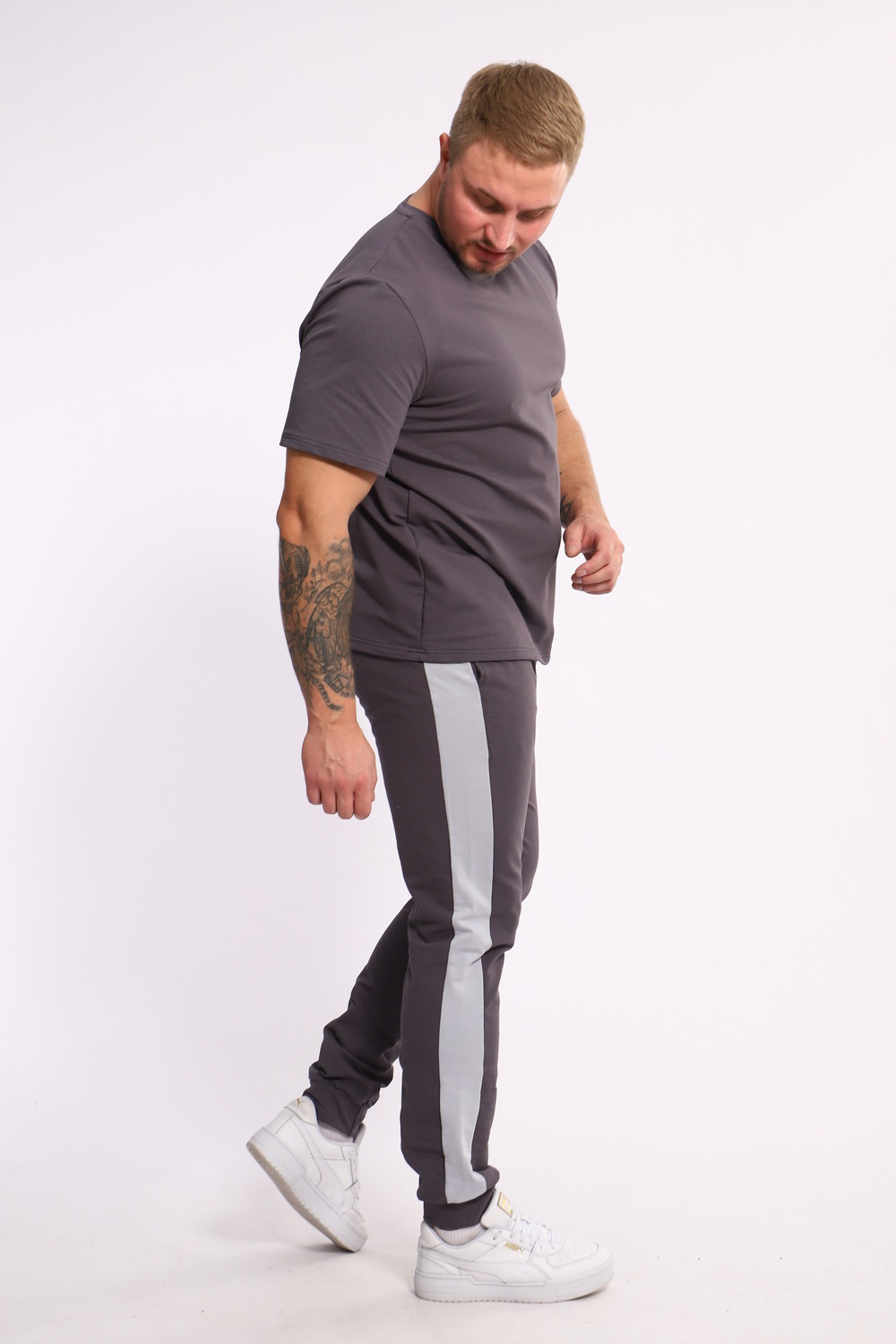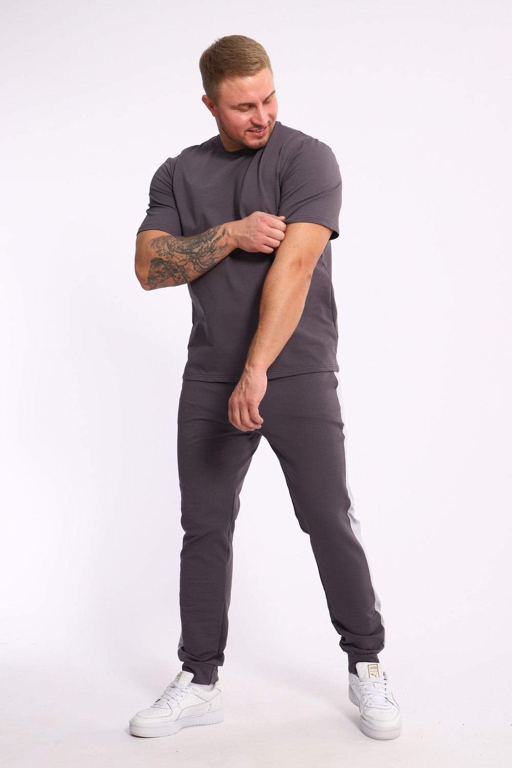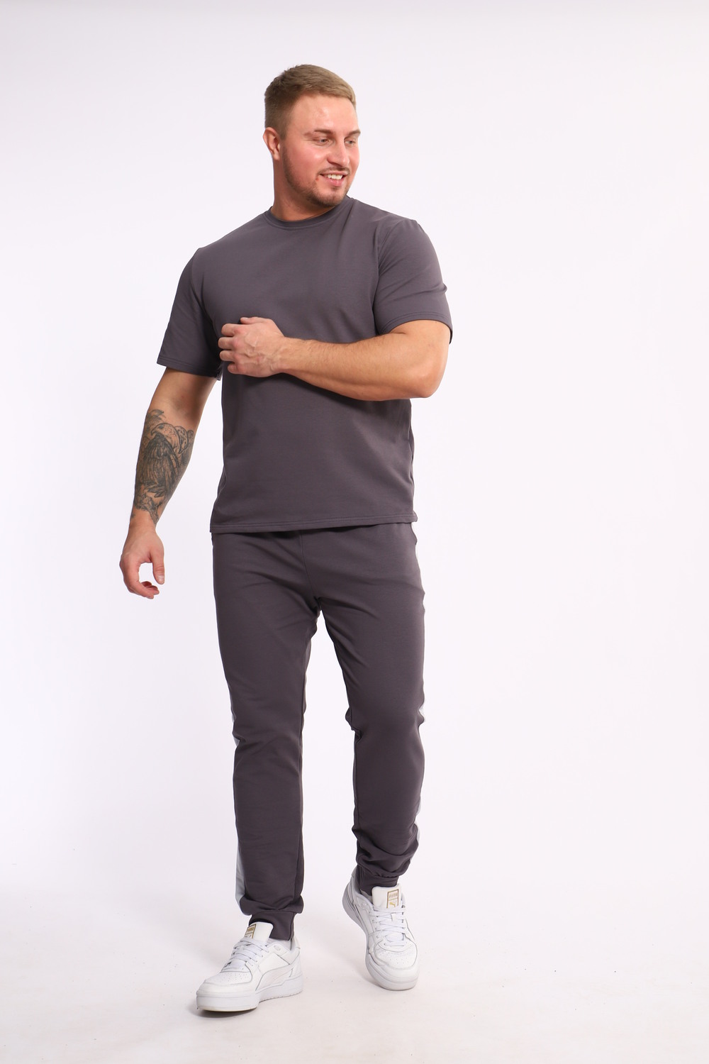 Стильный мужской костюм из мягкого и приятного на ощупь материала . Комплект состоит из футболки свободного кроя и комфортных прямых брюк с эластичным поясом и контрастной вставкой по бокам. Лаконичный дизайн делает этот костюм универсальным выбором для повседневной носки, прогулок или активного отдыха. Идеально сочетается с кроссовками для создания модного спортивного образа.