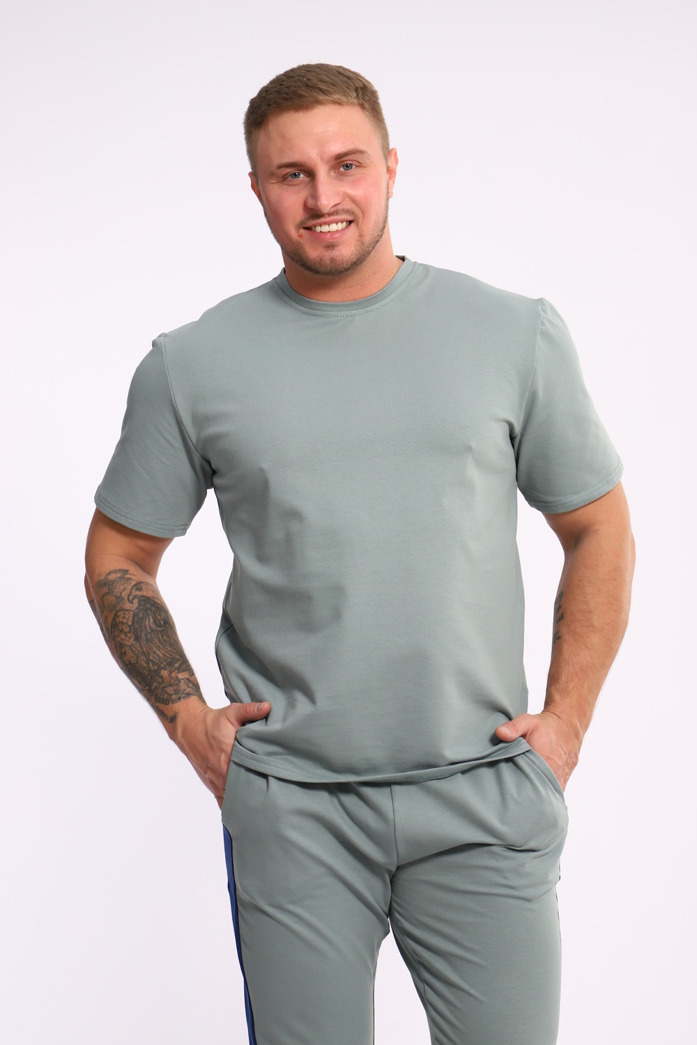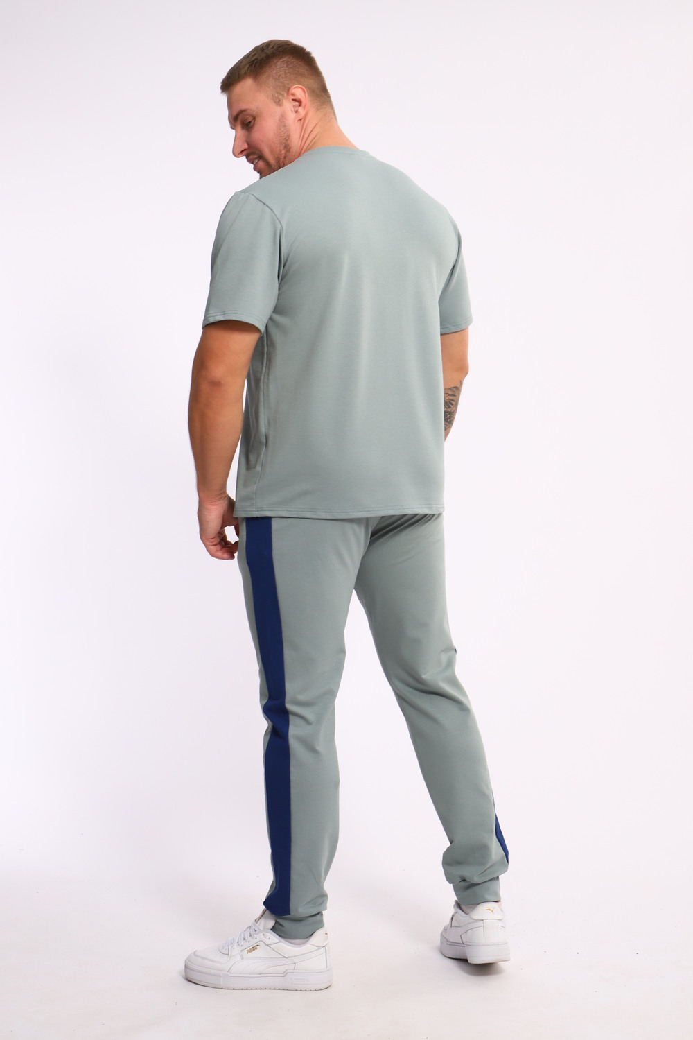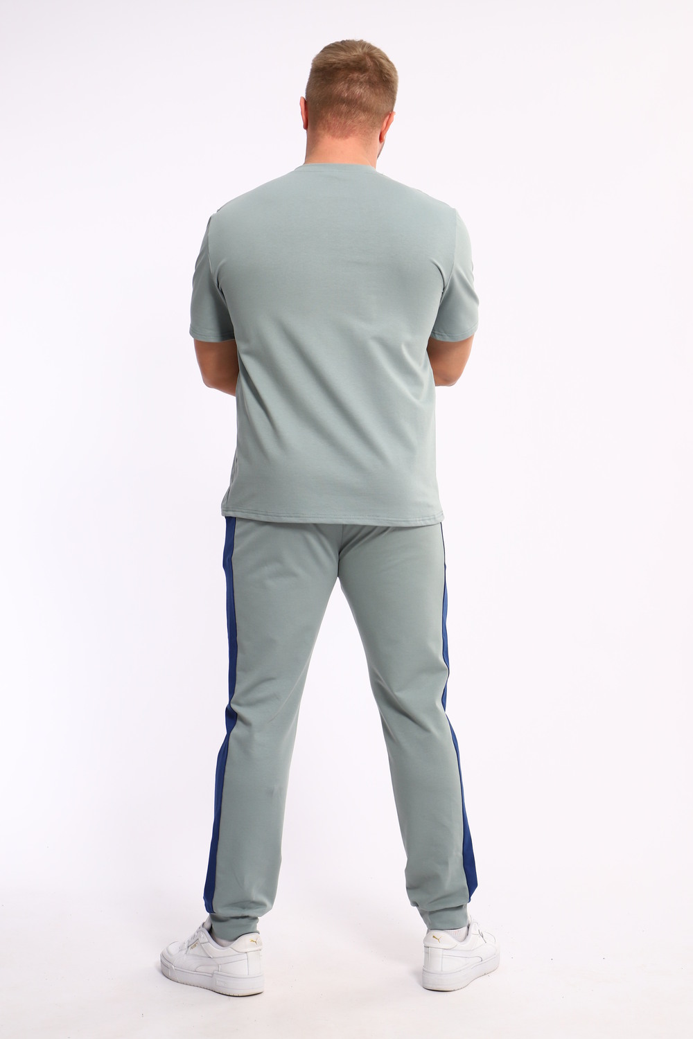 Стильный мужской костюм из мягкого и приятного на ощупь материала . Комплект состоит из футболки свободного кроя и комфортных прямых брюк с эластичным поясом и контрастной вставкой по бокам. Лаконичный дизайн делает этот костюм универсальным выбором для повседневной носки, прогулок или активного отдыха. Идеально сочетается с кроссовками для создания модного спортивного образа.