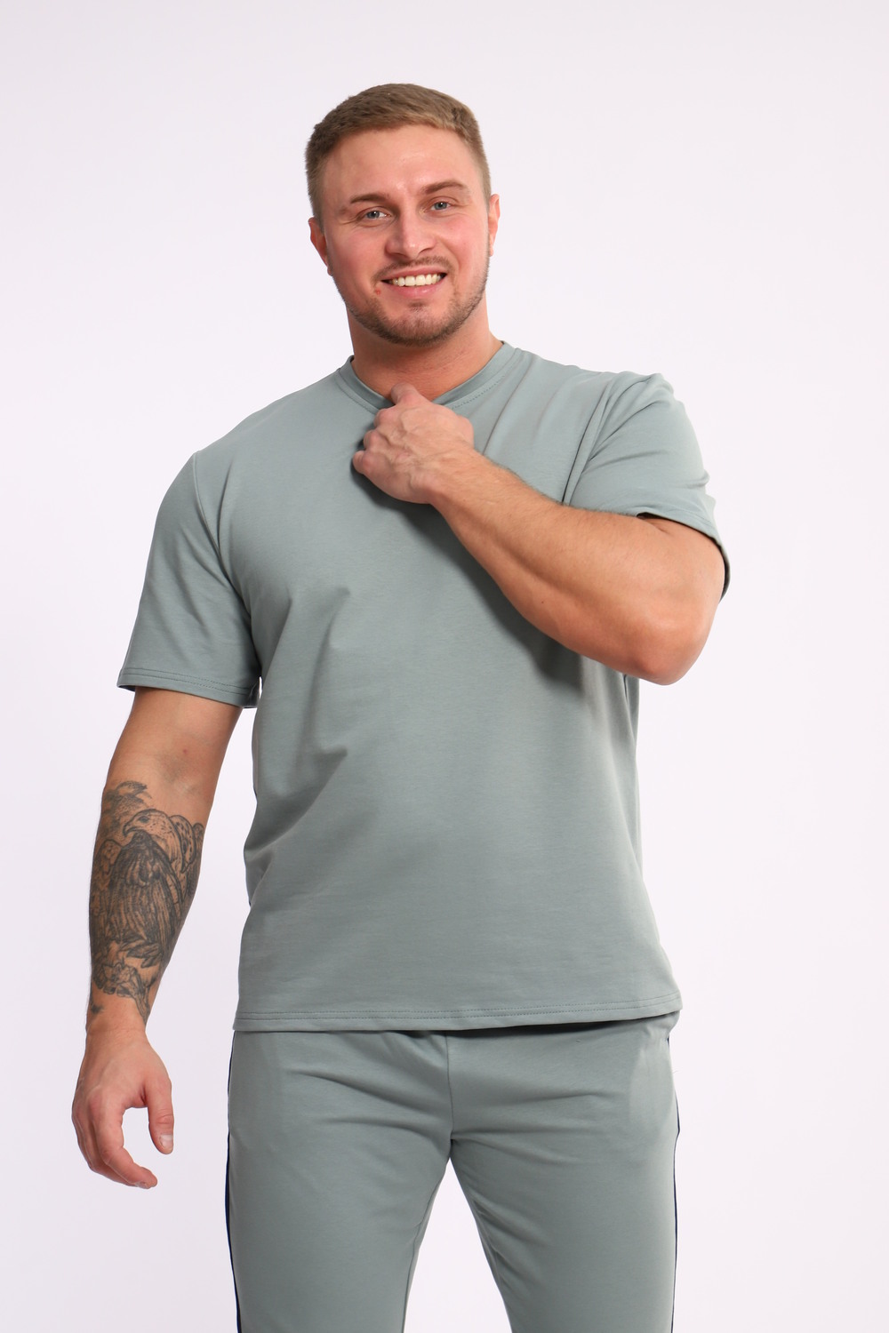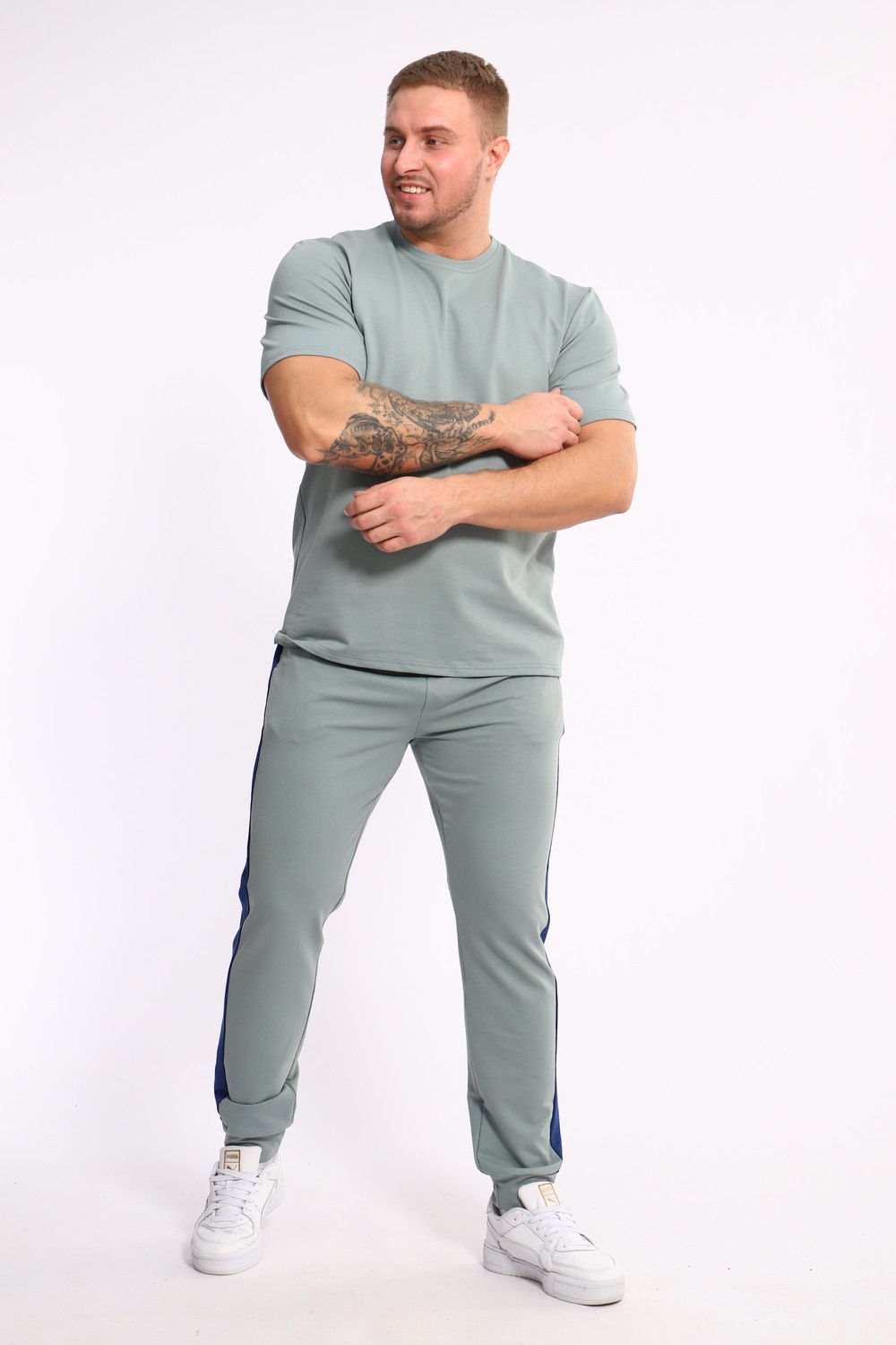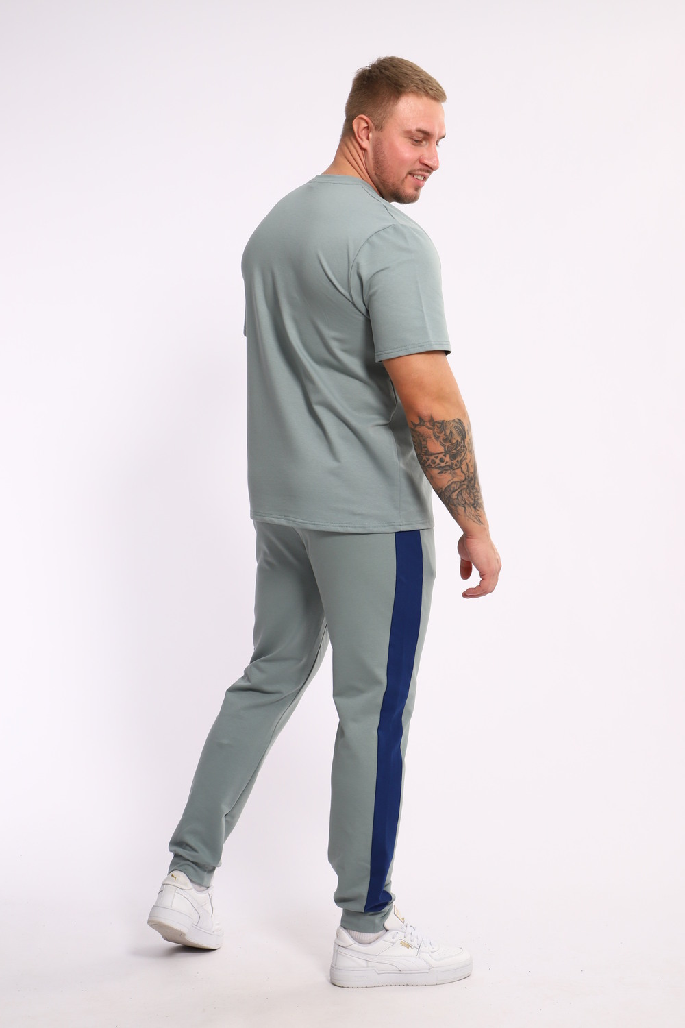 Стильный мужской костюм из мягкого и приятного на ощупь материала . Комплект состоит из футболки свободного кроя и комфортных прямых брюк с эластичным поясом и контрастной вставкой по бокам. Лаконичный дизайн делает этот костюм универсальным выбором для повседневной носки, прогулок или активного отдыха. Идеально сочетается с кроссовками для создания модного спортивного образа.