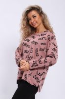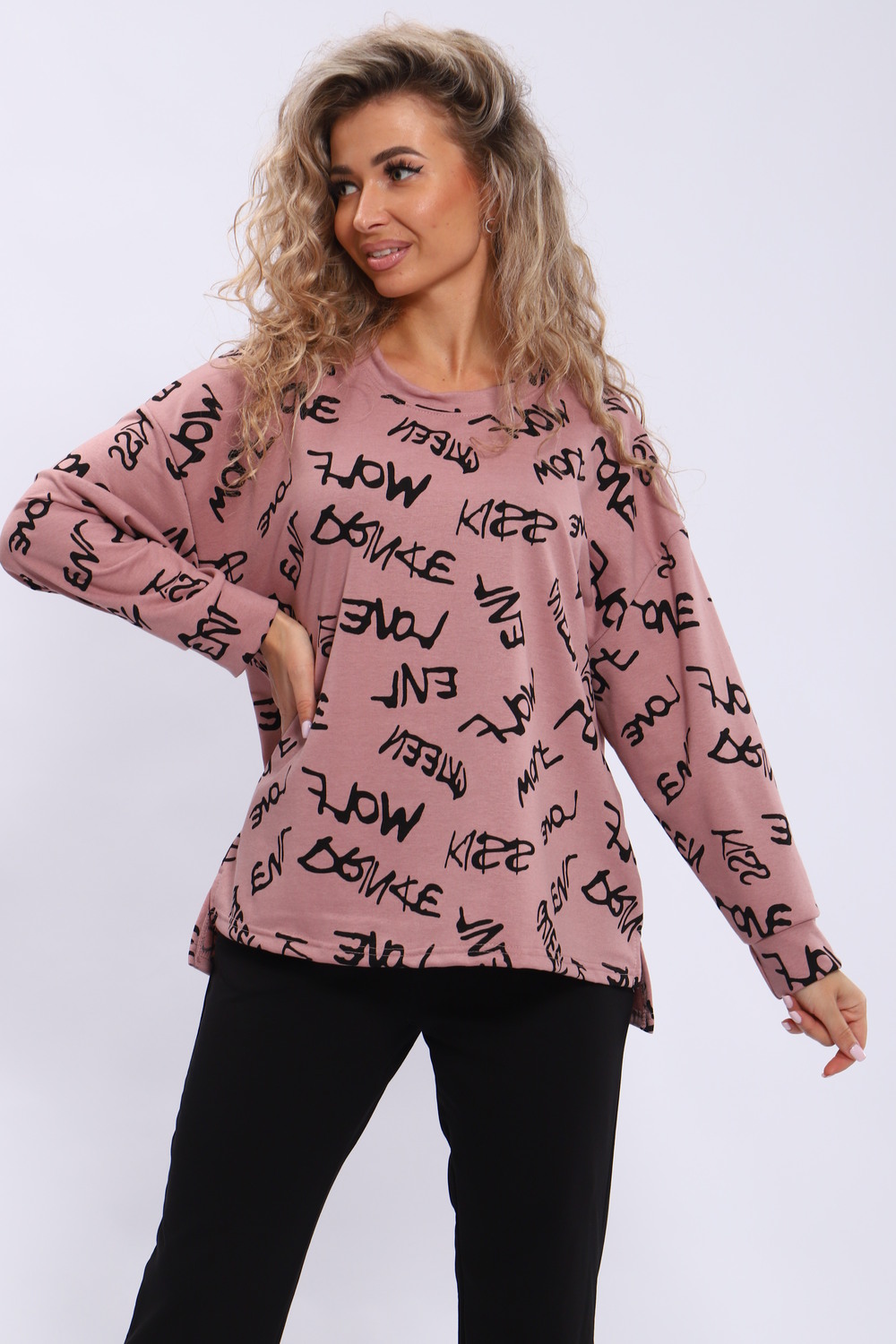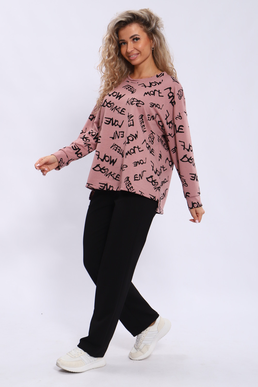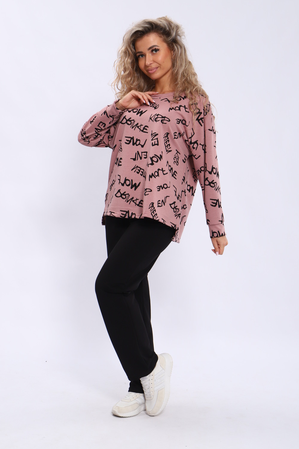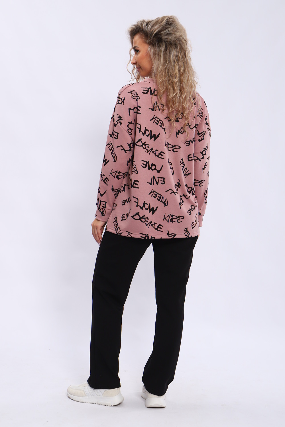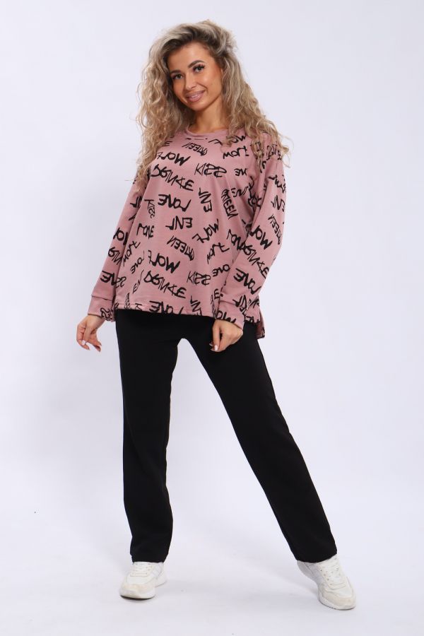 Костюм женский состоит из кофты свободного кроя и брюк с карманами. Плечо спущенное, спинка удлиненная.