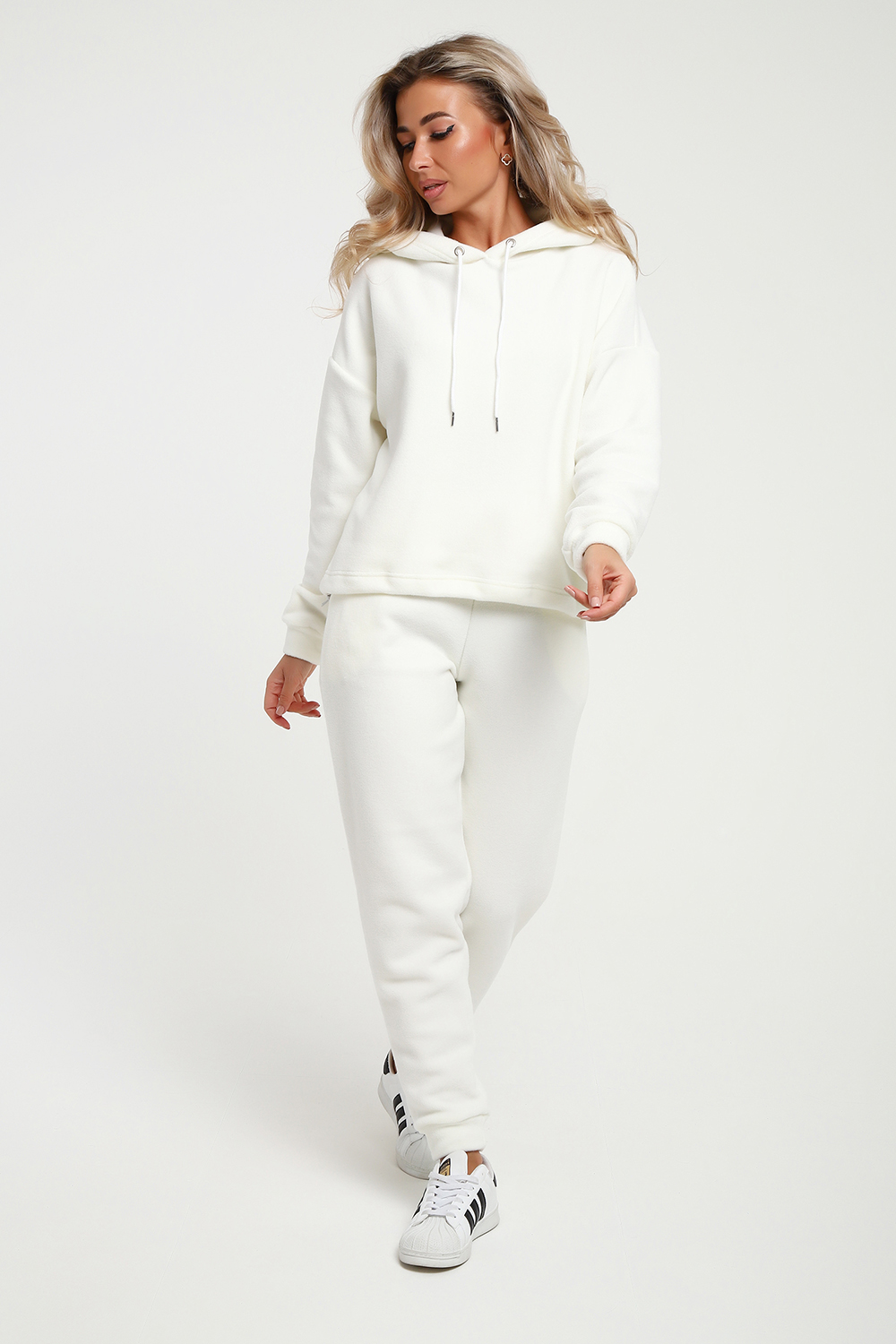 Женский костюм выполнен из флиса высокого качества. Флис - ткань с ворсистой поверхностью, что позволяет эффективно сохранять тепло. Материал прочный, эластичный, влагостойкий. Хорошо пропускает влагу, при этом не впитывает ее. По теплостойкости превосходит шерсть, но намного легче. Воздухопроницаемая гигроскопичная ткань создает для тела комфортный микроклимат. Материал гипоаллергенный, подходит для изготовления одежды детям, в том числе новорожденным. Изделия из флиса легкие, не мнутся, не деформируются, не вытягиваются. В такой одежде удобно и комфортно. Эластичность материала позволяет легко двигаться. Костюм состоит из толстовки и брюк. Толстовка с капюшоном и шнурком. Линия плеча спущена, длинный рукав. По низу толстовки имеется резинка с фиксатором, с помощью которой Вы можете собрать изделие как вам хочется и нравится. Брюки представлены с вместительными боковыми карманами. Манжеты брюк выполнены из основного материала, а пояс на специализированной поясной машине, что делает швы ровными и качественными. Свободный крой прекрасно будет смотреться на дамах с любыми формами. Костюм такого плана представлен в широкой размерной сетке, что позволяет выбрать его как девушке, так и женщине. Однотонный костюм модных расцветок будет удачным выбором для поездок в отпуск, на пикник, для школы, для активного отдыха и прогулок по городу. Будет гармонично сочетаться как с кроссовками, так и с ботинками. Используя эту модель в качестве домашнего костюма, Вы поймёте, что это именно тот самый идеальный вариант, в котором будете себя чувствовать удобно, комфортно и современно. Костюм с брюками - это настоящая находка для тех, кто ценит свою индивидуальность! Ориентируясь по таблице замеров, обратите внимание, что замеры длины рукава проводились от точки основания шеи.