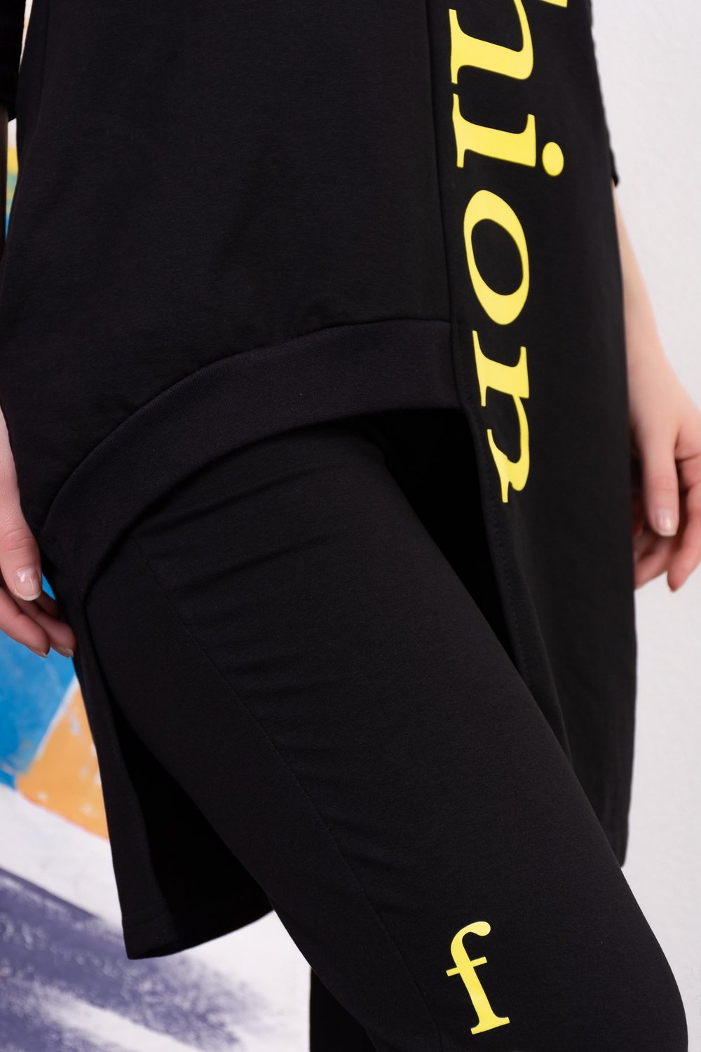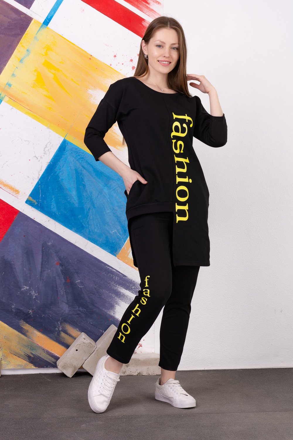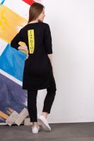 Стильный трикотажный костюм-двойка в стиле спорт шик. Удлиненная туника с потайными карманами, спереди на правой полочке косой срез до бедра. Горловина обработана рибаной. Рукава 3/4. Брючки укороченные, без карманов. Пояс на резинке.