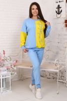 Костюм женский из футера 2 нитки. Кофта состоит из двух ярких половинок, рукав спущенный на манжете, на одной половинке принт из букв. Брюки прямые. Горловина рукава и низ брюк на кашкорсе.
