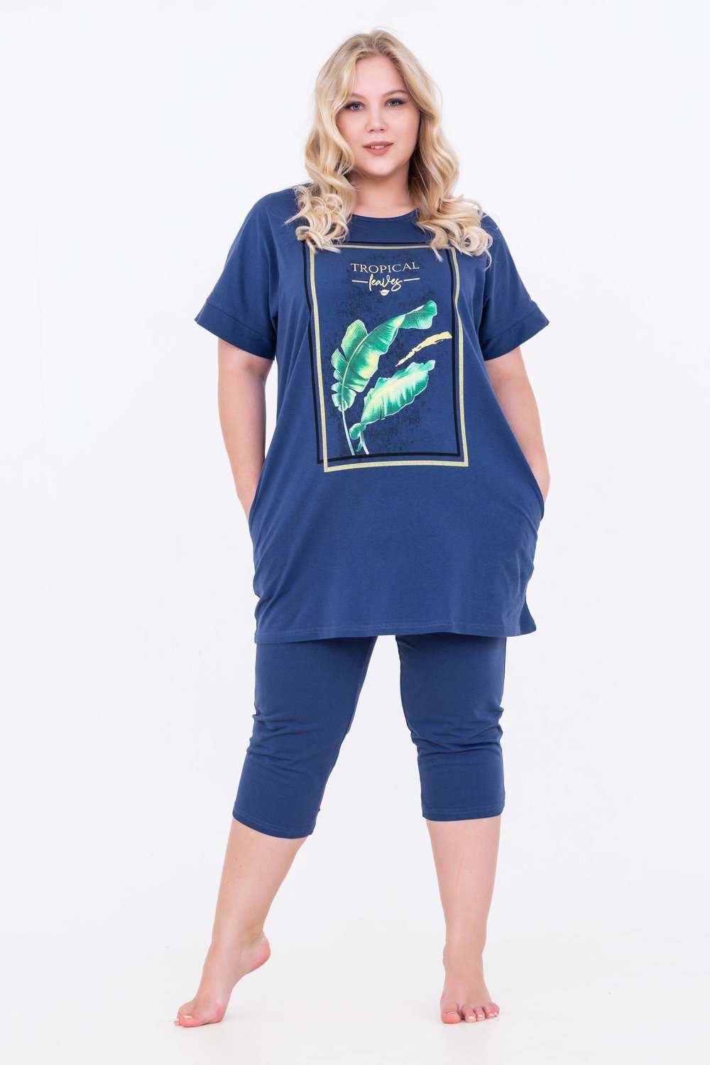 Домашний костюм женский изготовлен из ткани кулирка - мягкого и гладкого трикотажного полотна из хлопка. Костюм женский для дома и отдыха состоит из удлиненной футболки и бридж. Футболка прямого кроя, горловина круглая, обработана окантовкой, по бокам карманы. Рукав короткий. На полочке выполнен принт. За счет свободного кроя, брюки очень удобны и комфортны в эксплуатации.