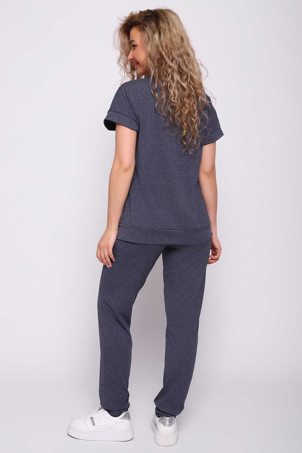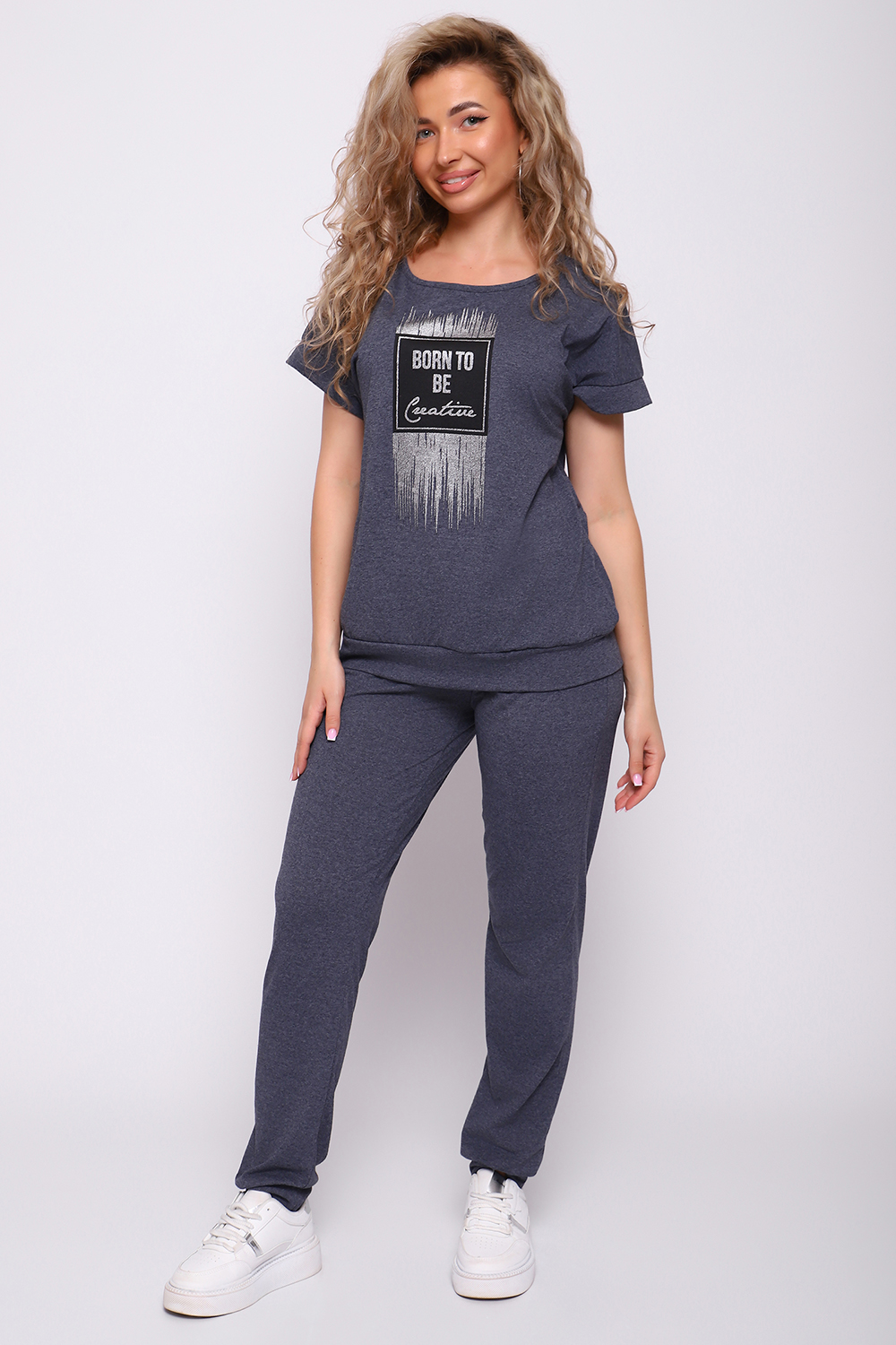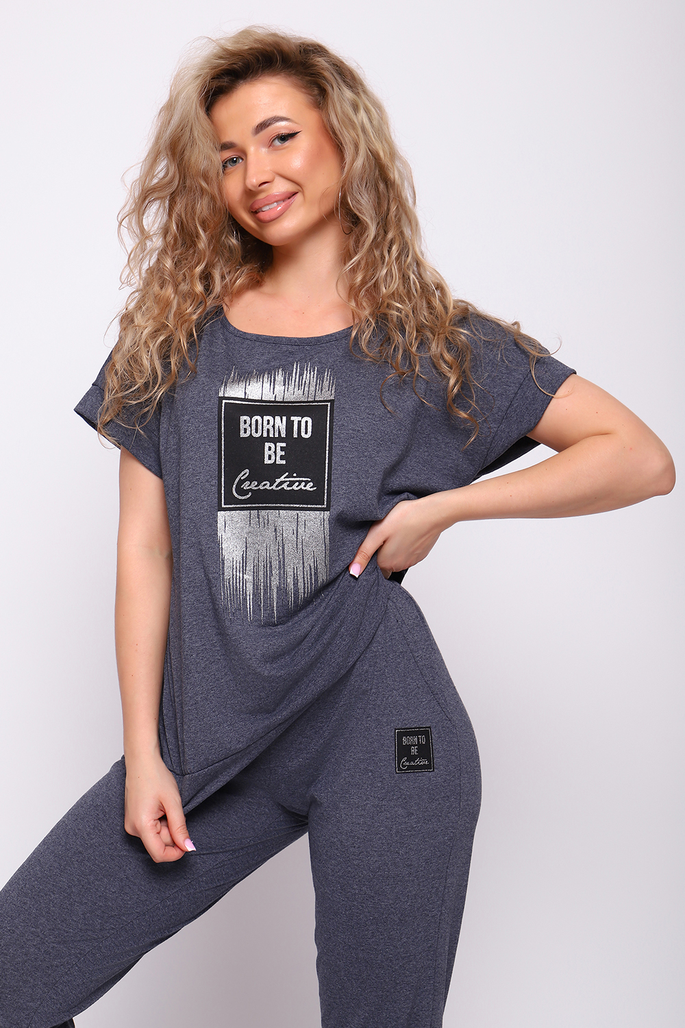 Комплекты из хлопковой кулирки, состав полотна смесовой хлопок с добавлением полиэстера. На полочке - принты с серебристым глиттером. Рукав спущенный, футболка внизу на поясе. Брюки свободные, есть боковые карманы, низ на манжетах.
