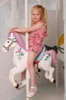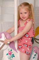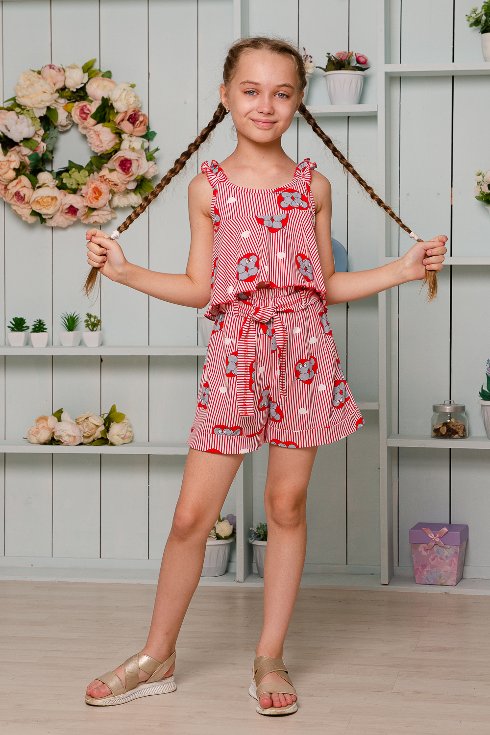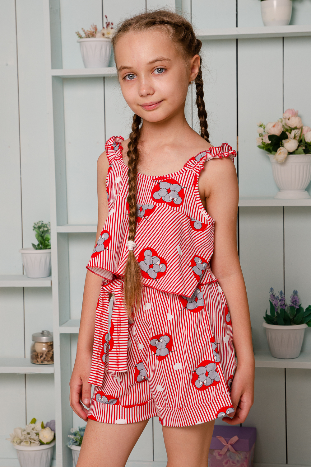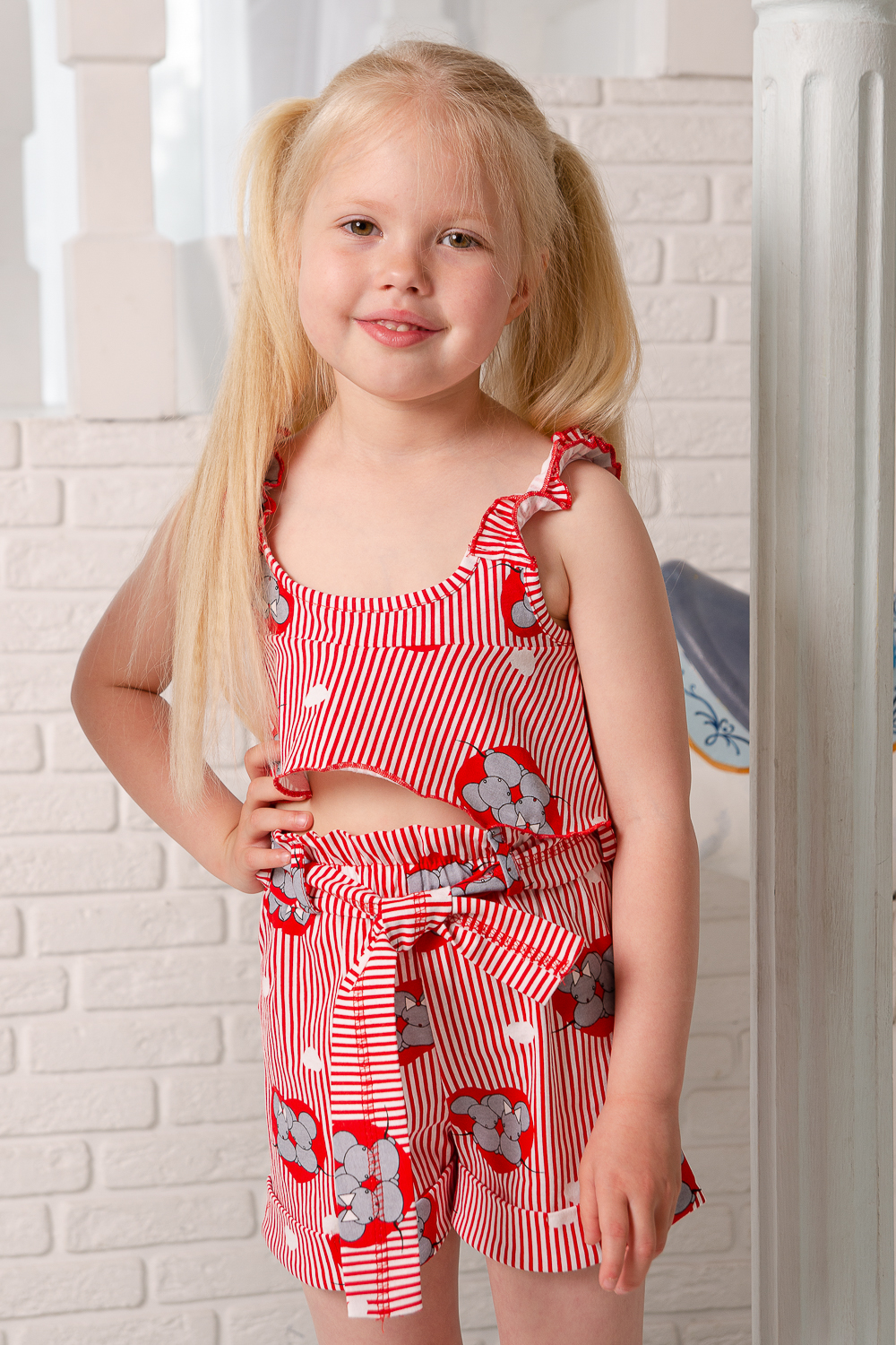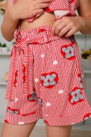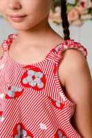 Костюм детский летний. Коротенький топ с шортами. Топ короткий, расклешенный с завышенной линией талии по переду, на широких бретельках из основной ткани, собранных в сборку на резинку. Низ топа обработан декоративной краеобметочной строчкой. Шорты с завышеной линией талии, на широкой резинке, шорты оформлены декоративным поясом со шлевками. Низ обработан притачными манжетами с отворотом.