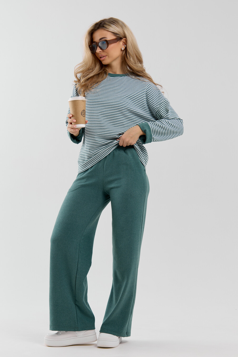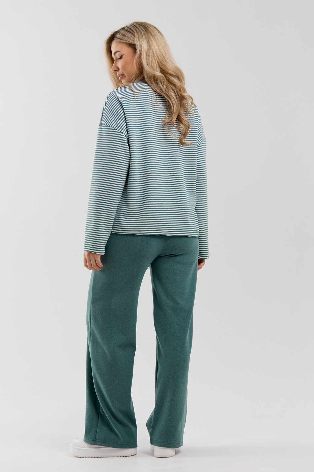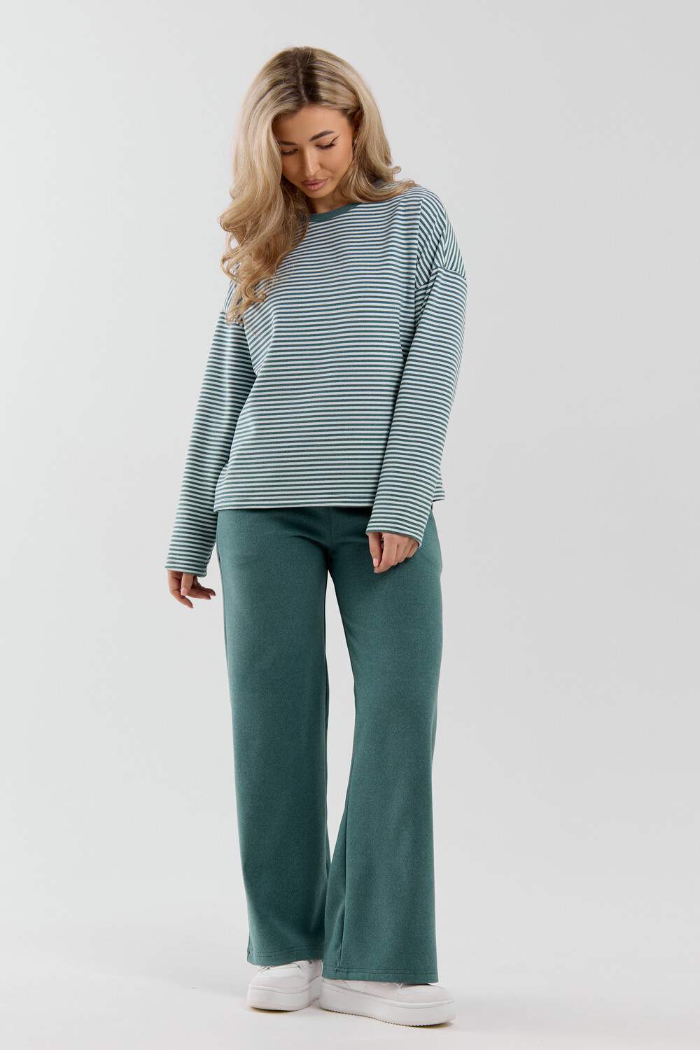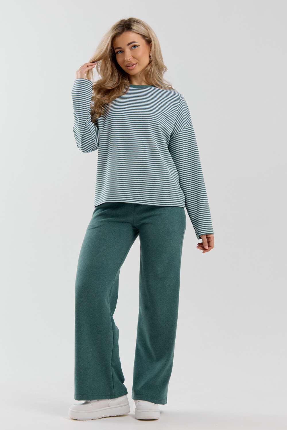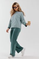 Женский костюм выполнен из двухстороннего флис полара высокого качества. Флис полар - высокотехнологичный материал, прошедшей особую обработку. Ткань отличается высокими теплозащитными свойствами, при этом является дышащей. По своим характеристикам она не уступает шерстяным полотнам. И даже в сыром состоянии удерживает тепло у тела. Материал прочный, эластичный, влагостойкий. Воздухопроницаемая гигроскопичная ткань создает для тела комфортный микроклимат. Материал гипоаллергенный, подходит для изготовления одежды детям, в том числе новорожденным. Изделия из флиса легкие, не мнутся, не деформируются, не вытягиваються.В такой одежде удобно и комфортно. Эластичность материала позволяет легко двигаться. Костюм состоит из лонгслива и брюк. Лонг в стиле OVERSIZE ( одежда свободного кроя ) - это свобода самовыражения, позволяющая чувствовать себя комфортно и стильно одновременно. Горловина футболки выполнена с обтачкой. Линия плеча спущена, длинный рукав. Женские стильные брюки - трубы представлены с вместительными боковыми карманами. Пояс выполнен на специализированной круговой поясной машине, что делает швы ровными и качественными. А профессиональные закрепки на поясе, придают изделию законченный вид и качество. Свободный крой прекрасно будет смотреться на дамах с любыми формами. Костюм такого плана представлен в широкой размерной сетке, что позволяет выбрать его как девушке, так и женщине. Костюм модных расцветок с полосой, будет удачным выбором для поездок в отпуск, на пикник, для школы, для активного отдыха и прогулок по городу. Будет гармонично сочетаться как с кроссовками, так и с ботинками. Используя эту модель в качестве домашнего костюма, Вы поймёте, что это именно тот самый идеальный вариант, в котором будете себя чувствовать удобно, комфортно и современно. Костюм с брюками - это настоящая находка для тех, кто ценит свою индивидуальность! Уход: -температура воды не более 40°С (лучше 30°С); -допустима ручная и автоматическая стирка; -Одежду не выкручивают, а развешивают на плечики, давая воде стечь. -сушка в стиральной машине недопустима; Ориентируясь по таблице замеров, обратите внимание, что замеры длины рукава проводились от точки основания шеи.