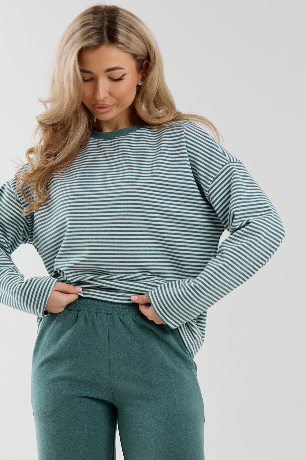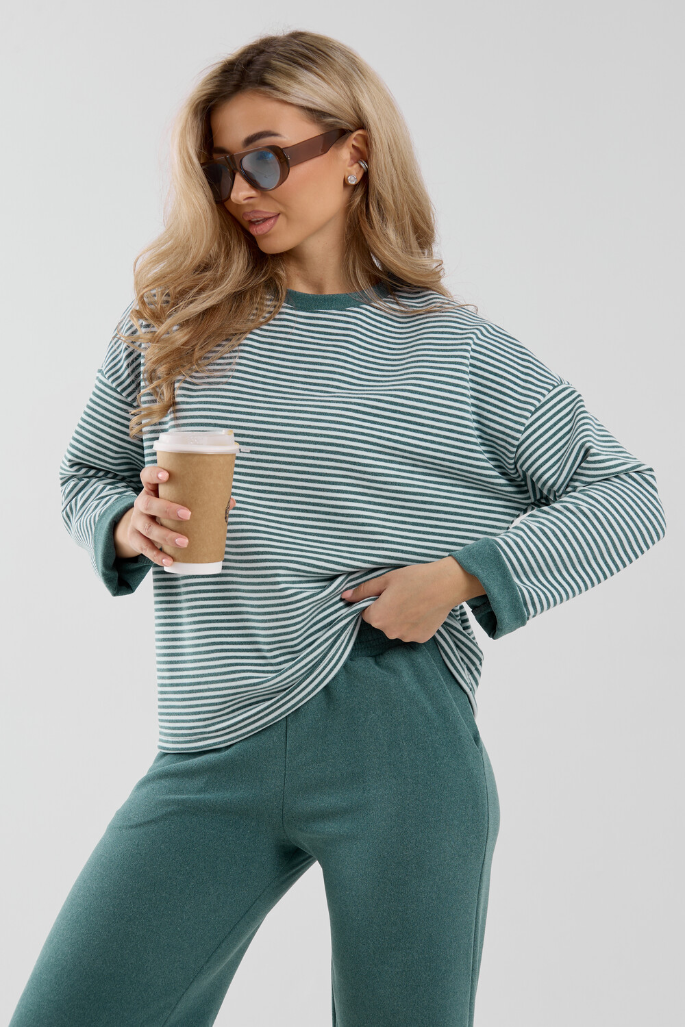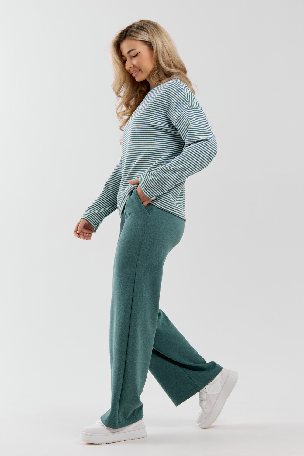 Женский костюм выполнен из двухстороннего флис полара высокого качества. Флис полар - высокотехнологичный материал, прошедшей особую обработку. Ткань отличается высокими теплозащитными свойствами, при этом является дышащей. По своим характеристикам она не уступает шерстяным полотнам. И даже в сыром состоянии удерживает тепло у тела. Материал прочный, эластичный, влагостойкий. Воздухопроницаемая гигроскопичная ткань создает для тела комфортный микроклимат. Материал гипоаллергенный, подходит для изготовления одежды детям, в том числе новорожденным. Изделия из флиса легкие, не мнутся, не деформируются, не вытягиваються.В такой одежде удобно и комфортно. Эластичность материала позволяет легко двигаться. Костюм состоит из лонгслива и брюк. Лонг в стиле OVERSIZE ( одежда свободного кроя ) - это свобода самовыражения, позволяющая чувствовать себя комфортно и стильно одновременно. Горловина футболки выполнена с обтачкой. Линия плеча спущена, длинный рукав. Женские стильные брюки - трубы представлены с вместительными боковыми карманами. Пояс выполнен на специализированной круговой поясной машине, что делает швы ровными и качественными. А профессиональные закрепки на поясе, придают изделию законченный вид и качество. Свободный крой прекрасно будет смотреться на дамах с любыми формами. Костюм такого плана представлен в широкой размерной сетке, что позволяет выбрать его как девушке, так и женщине. Костюм модных расцветок с полосой, будет удачным выбором для поездок в отпуск, на пикник, для школы, для активного отдыха и прогулок по городу. Будет гармонично сочетаться как с кроссовками, так и с ботинками. Используя эту модель в качестве домашнего костюма, Вы поймёте, что это именно тот самый идеальный вариант, в котором будете себя чувствовать удобно, комфортно и современно. Костюм с брюками - это настоящая находка для тех, кто ценит свою индивидуальность! Уход: -температура воды не более 40°С (лучше 30°С); -допустима ручная и автоматическая стирка; -Одежду не выкручивают, а развешивают на плечики, давая воде стечь. -сушка в стиральной машине недопустима; Ориентируясь по таблице замеров, обратите внимание, что замеры длины рукава проводились от точки основания шеи.