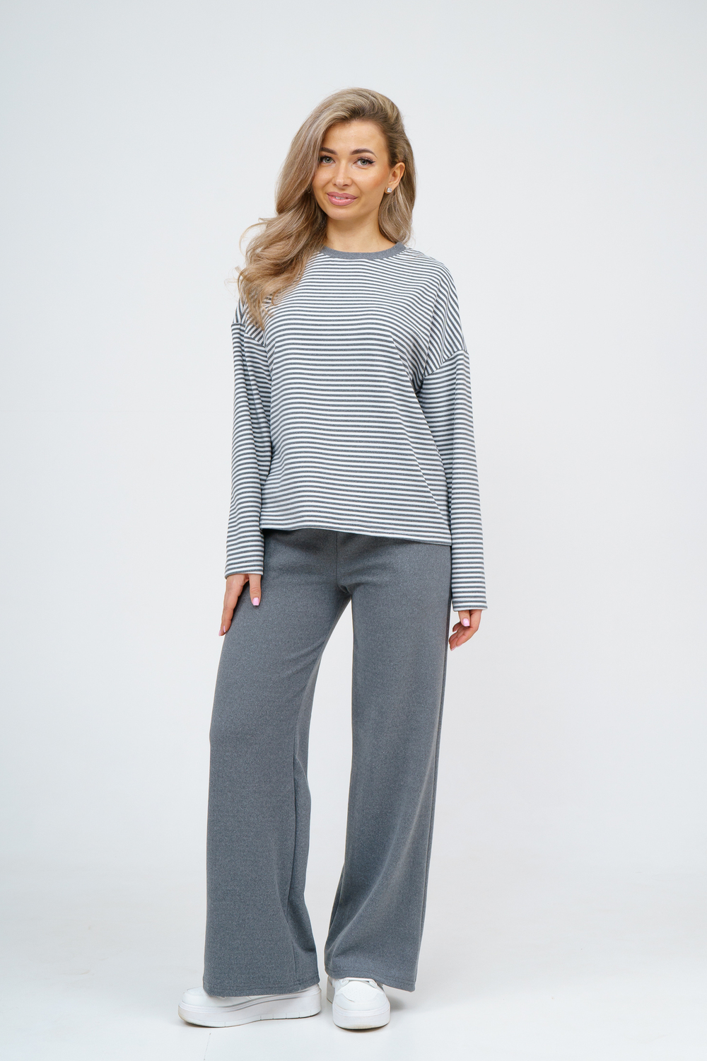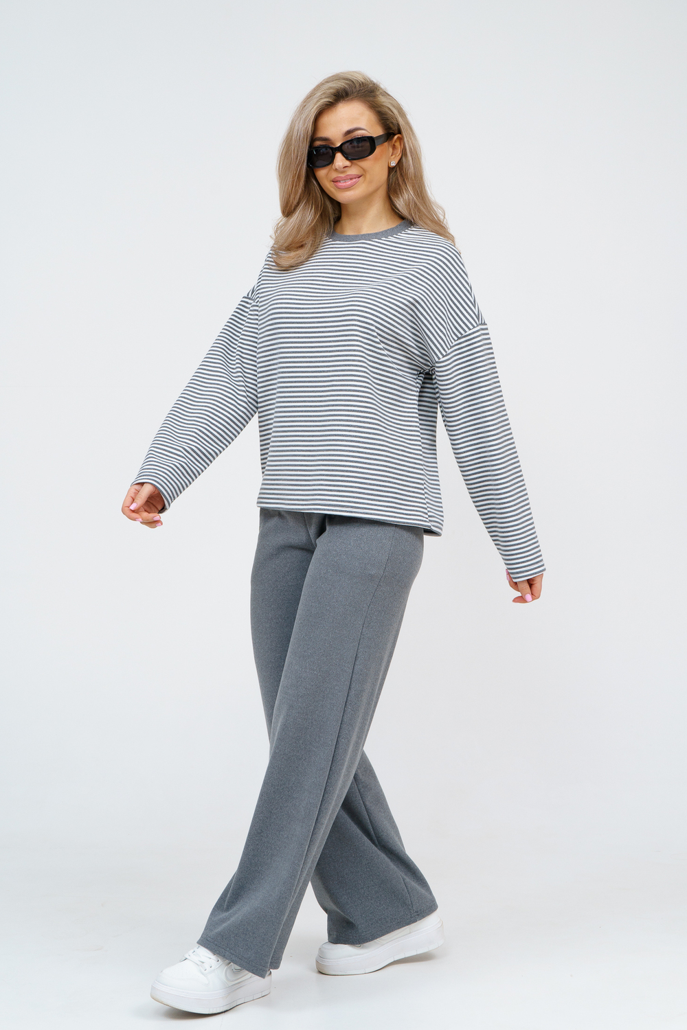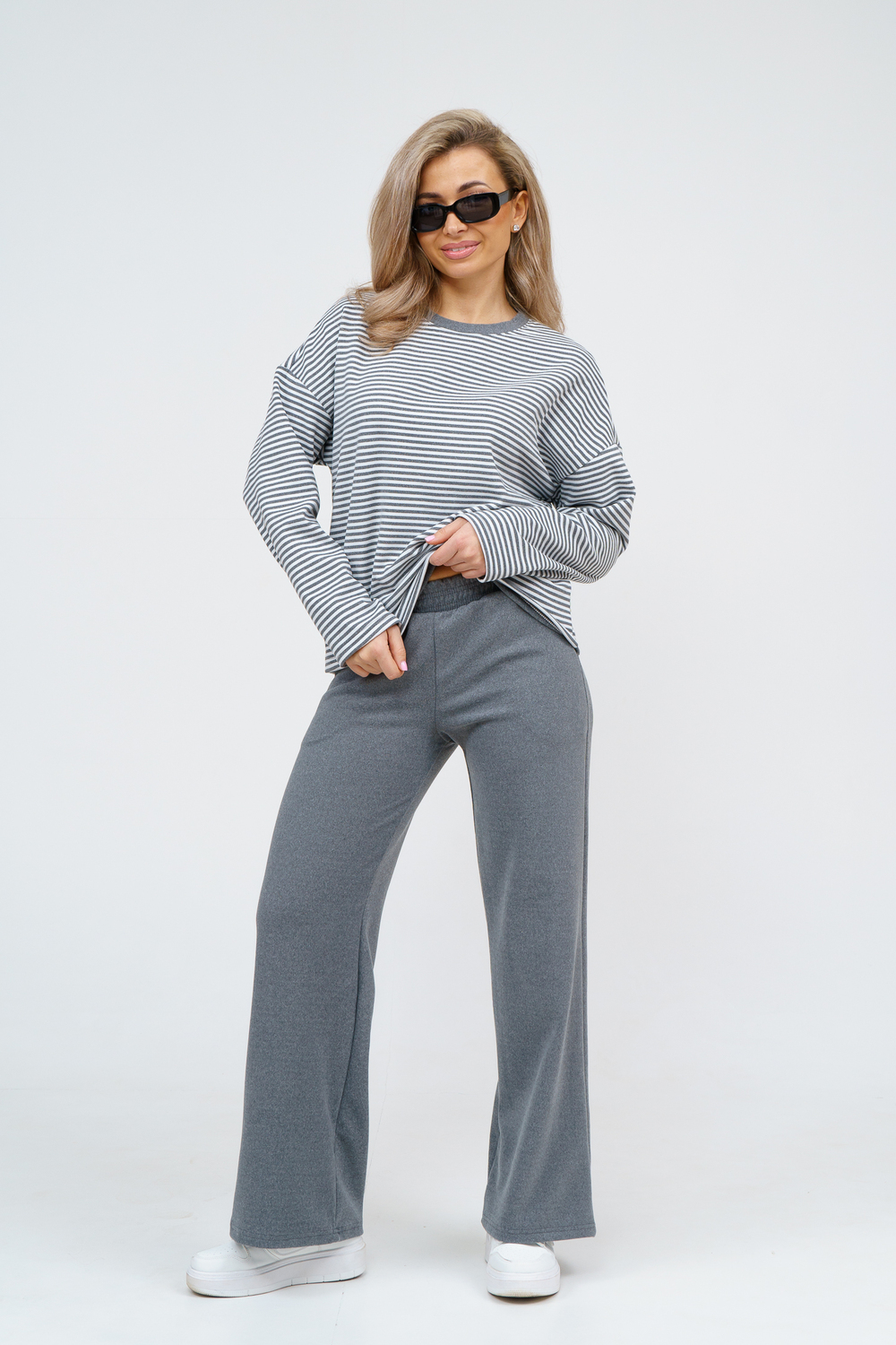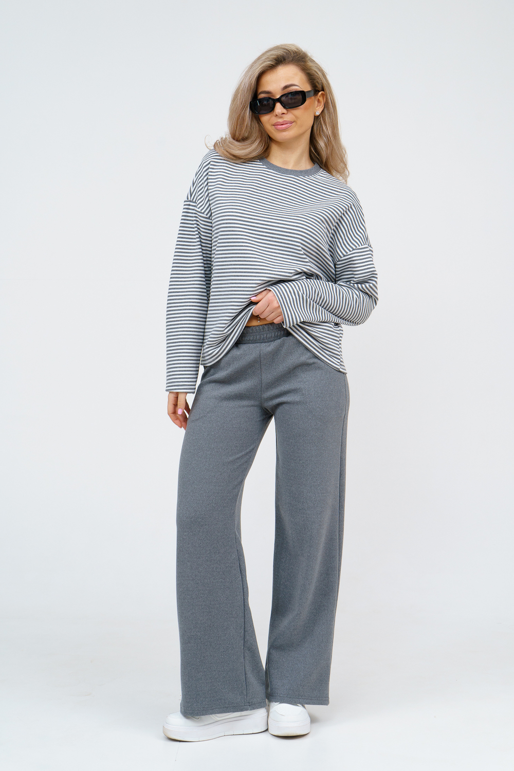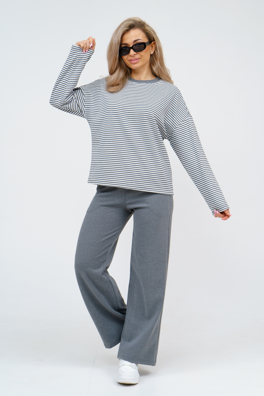 Женский костюм выполнен из двухстороннего флис полара высокого качества. Флис полар - высокотехнологичный материал, прошедшей особую обработку. Ткань отличается высокими теплозащитными свойствами, при этом является дышащей. По своим характеристикам она не уступает шерстяным полотнам. И даже в сыром состоянии удерживает тепло у тела. Материал прочный, эластичный, влагостойкий. Воздухопроницаемая гигроскопичная ткань создает для тела комфортный микроклимат. Материал гипоаллергенный, подходит для изготовления одежды детям, в том числе новорожденным. Изделия из флиса легкие, не мнутся, не деформируются, не вытягиваються.В такой одежде удобно и комфортно. Эластичность материала позволяет легко двигаться. Костюм состоит из лонгслива и брюк. Лонг в стиле OVERSIZE ( одежда свободного кроя ) - это свобода самовыражения, позволяющая чувствовать себя комфортно и стильно одновременно. Горловина футболки выполнена с обтачкой. Линия плеча спущена, длинный рукав. Женские стильные брюки - трубы представлены с вместительными боковыми карманами. Пояс выполнен на специализированной круговой поясной машине, что делает швы ровными и качественными. А профессиональные закрепки на поясе, придают изделию законченный вид и качество. Свободный крой прекрасно будет смотреться на дамах с любыми формами. Костюм такого плана представлен в широкой размерной сетке, что позволяет выбрать его как девушке, так и женщине. Костюм модных расцветок с полосой, будет удачным выбором для поездок в отпуск, на пикник, для школы, для активного отдыха и прогулок по городу. Будет гармонично сочетаться как с кроссовками, так и с ботинками. Используя эту модель в качестве домашнего костюма, Вы поймёте, что это именно тот самый идеальный вариант, в котором будете себя чувствовать удобно, комфортно и современно. Костюм с брюками - это настоящая находка для тех, кто ценит свою индивидуальность! Уход: -температура воды не более 40°С (лучше 30°С); -допустима ручная и автоматическая стирка; -Одежду не выкручивают, а развешивают на плечики, давая воде стечь. -сушка в стиральной машине недопустима; Ориентируясь по таблице замеров, обратите внимание, что замеры длины рукава проводились от точки основания шеи.