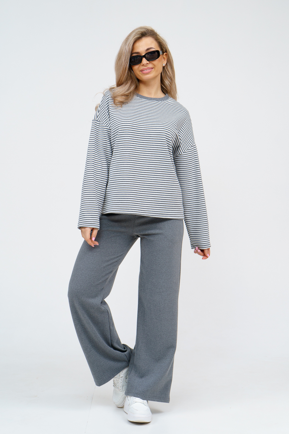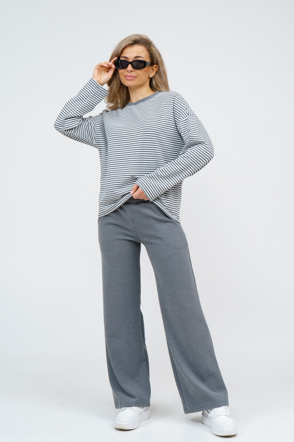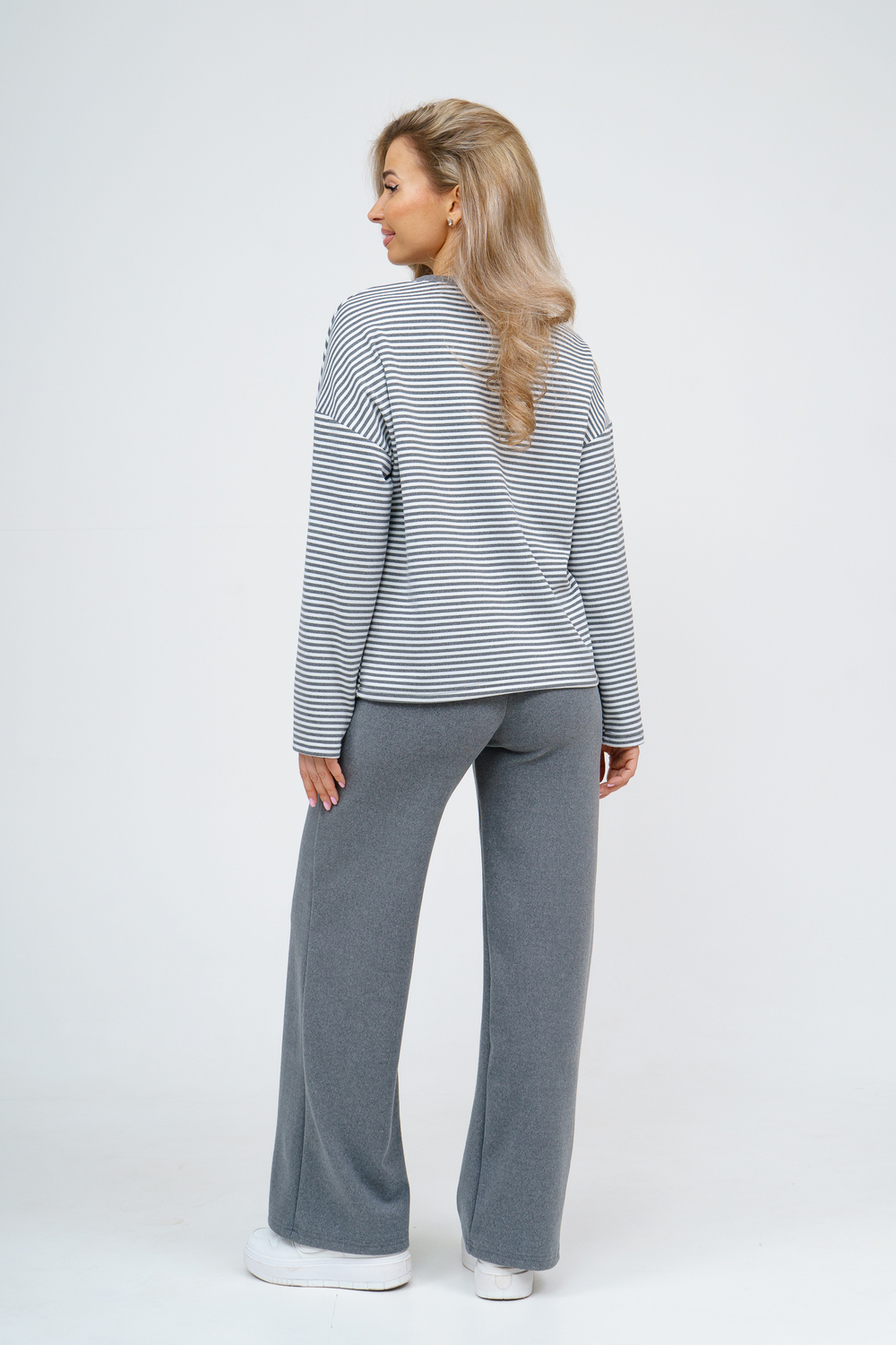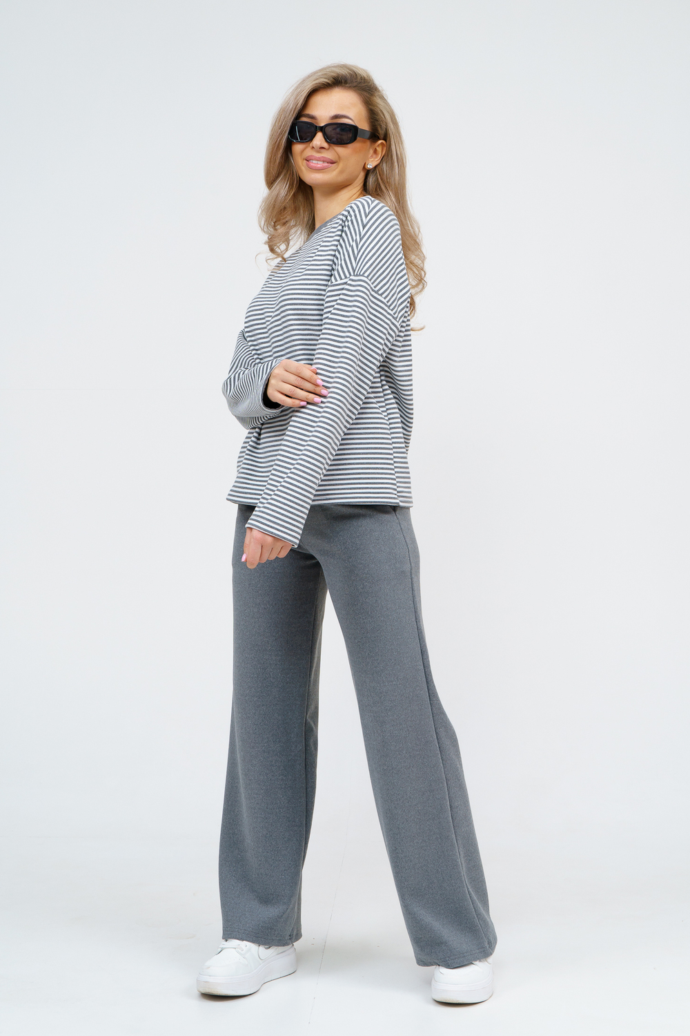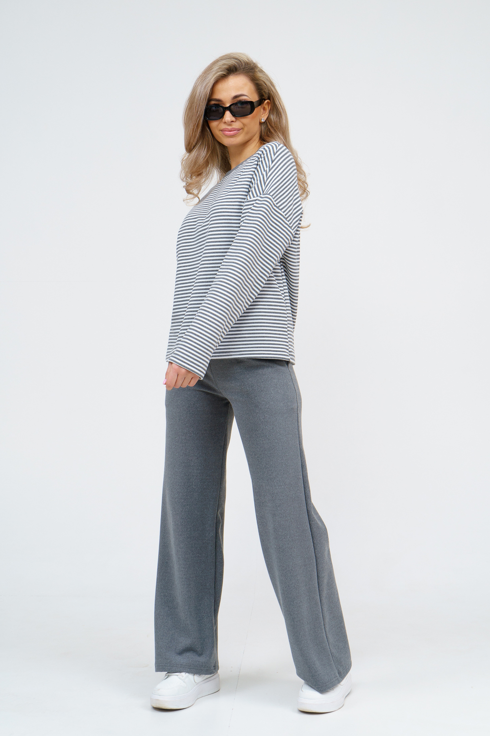 Женский костюм выполнен из двухстороннего флис полара высокого качества. Флис полар - высокотехнологичный материал, прошедшей особую обработку. Ткань отличается высокими теплозащитными свойствами, при этом является дышащей. По своим характеристикам она не уступает шерстяным полотнам. И даже в сыром состоянии удерживает тепло у тела. Материал прочный, эластичный, влагостойкий. Воздухопроницаемая гигроскопичная ткань создает для тела комфортный микроклимат. Материал гипоаллергенный, подходит для изготовления одежды детям, в том числе новорожденным. Изделия из флиса легкие, не мнутся, не деформируются, не вытягиваються.В такой одежде удобно и комфортно. Эластичность материала позволяет легко двигаться. Костюм состоит из лонгслива и брюк. Лонг в стиле OVERSIZE ( одежда свободного кроя ) - это свобода самовыражения, позволяющая чувствовать себя комфортно и стильно одновременно. Горловина футболки выполнена с обтачкой. Линия плеча спущена, длинный рукав. Женские стильные брюки - трубы представлены с вместительными боковыми карманами. Пояс выполнен на специализированной круговой поясной машине, что делает швы ровными и качественными. А профессиональные закрепки на поясе, придают изделию законченный вид и качество. Свободный крой прекрасно будет смотреться на дамах с любыми формами. Костюм такого плана представлен в широкой размерной сетке, что позволяет выбрать его как девушке, так и женщине. Костюм модных расцветок с полосой, будет удачным выбором для поездок в отпуск, на пикник, для школы, для активного отдыха и прогулок по городу. Будет гармонично сочетаться как с кроссовками, так и с ботинками. Используя эту модель в качестве домашнего костюма, Вы поймёте, что это именно тот самый идеальный вариант, в котором будете себя чувствовать удобно, комфортно и современно. Костюм с брюками - это настоящая находка для тех, кто ценит свою индивидуальность! Уход: -температура воды не более 40°С (лучше 30°С); -допустима ручная и автоматическая стирка; -Одежду не выкручивают, а развешивают на плечики, давая воде стечь. -сушка в стиральной машине недопустима; Ориентируясь по таблице замеров, обратите внимание, что замеры длины рукава проводились от точки основания шеи.