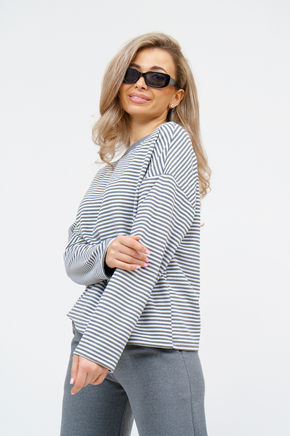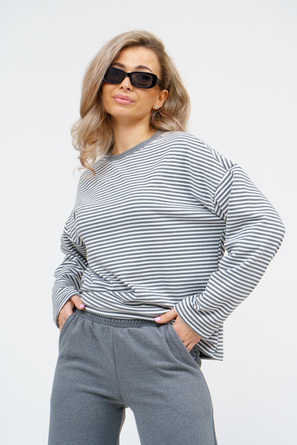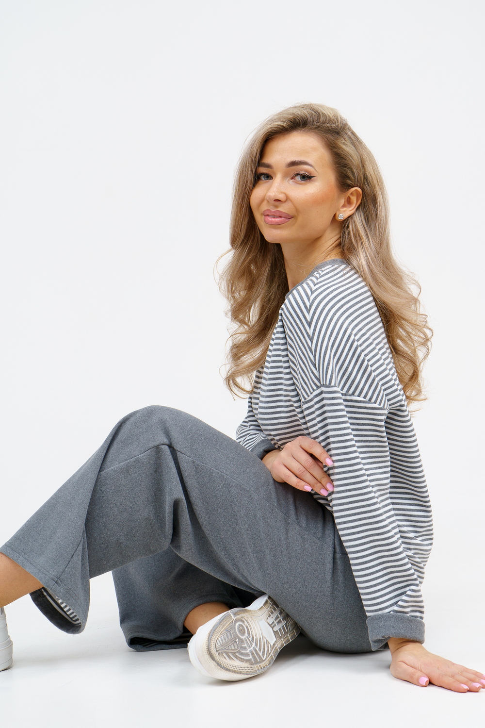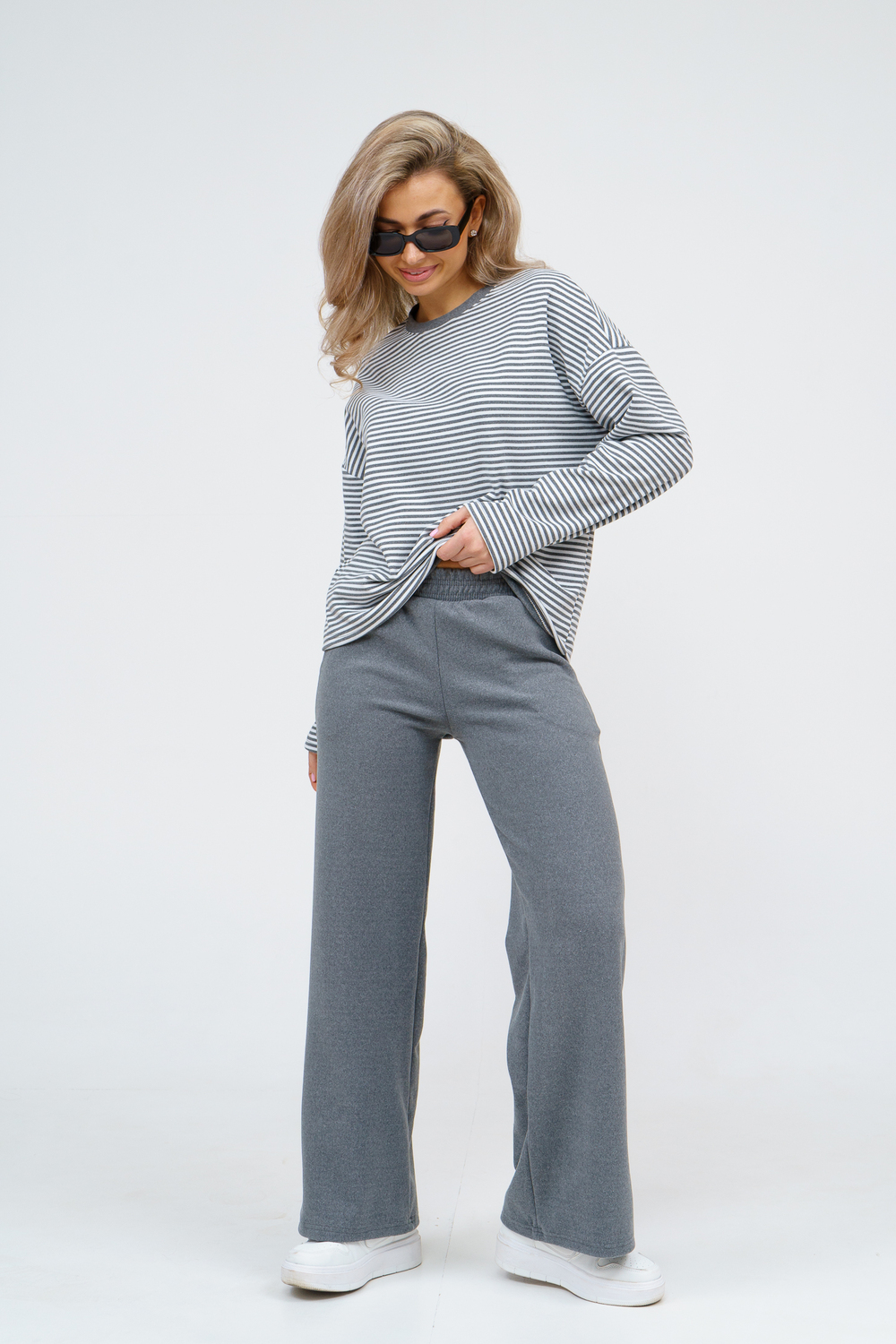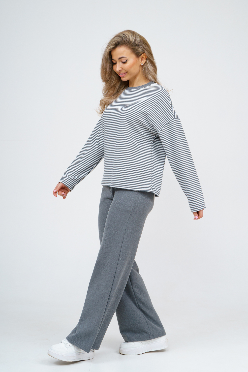 Женский костюм выполнен из двухстороннего флис полара высокого качества. Флис полар - высокотехнологичный материал, прошедшей особую обработку. Ткань отличается высокими теплозащитными свойствами, при этом является дышащей. По своим характеристикам она не уступает шерстяным полотнам. И даже в сыром состоянии удерживает тепло у тела. Материал прочный, эластичный, влагостойкий. Воздухопроницаемая гигроскопичная ткань создает для тела комфортный микроклимат. Материал гипоаллергенный, подходит для изготовления одежды детям, в том числе новорожденным. Изделия из флиса легкие, не мнутся, не деформируются, не вытягиваються.В такой одежде удобно и комфортно. Эластичность материала позволяет легко двигаться. Костюм состоит из лонгслива и брюк. Лонг в стиле OVERSIZE ( одежда свободного кроя ) - это свобода самовыражения, позволяющая чувствовать себя комфортно и стильно одновременно. Горловина футболки выполнена с обтачкой. Линия плеча спущена, длинный рукав. Женские стильные брюки - трубы представлены с вместительными боковыми карманами. Пояс выполнен на специализированной круговой поясной машине, что делает швы ровными и качественными. А профессиональные закрепки на поясе, придают изделию законченный вид и качество. Свободный крой прекрасно будет смотреться на дамах с любыми формами. Костюм такого плана представлен в широкой размерной сетке, что позволяет выбрать его как девушке, так и женщине. Костюм модных расцветок с полосой, будет удачным выбором для поездок в отпуск, на пикник, для школы, для активного отдыха и прогулок по городу. Будет гармонично сочетаться как с кроссовками, так и с ботинками. Используя эту модель в качестве домашнего костюма, Вы поймёте, что это именно тот самый идеальный вариант, в котором будете себя чувствовать удобно, комфортно и современно. Костюм с брюками - это настоящая находка для тех, кто ценит свою индивидуальность! Уход: -температура воды не более 40°С (лучше 30°С); -допустима ручная и автоматическая стирка; -Одежду не выкручивают, а развешивают на плечики, давая воде стечь. -сушка в стиральной машине недопустима; Ориентируясь по таблице замеров, обратите внимание, что замеры длины рукава проводились от точки основания шеи.