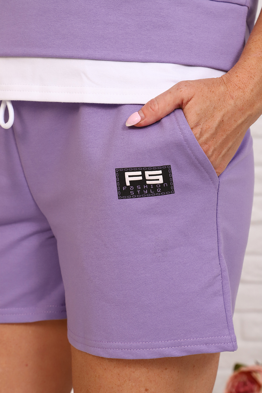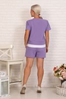 Костюм женский трикотажный - футболка и шорты. Футболка укороченная с отделкой по низу контрастного цвета. Шорты короткие с завязками и втачными боковыми карманами. На футболке и шортах небольшие отделочные печати.