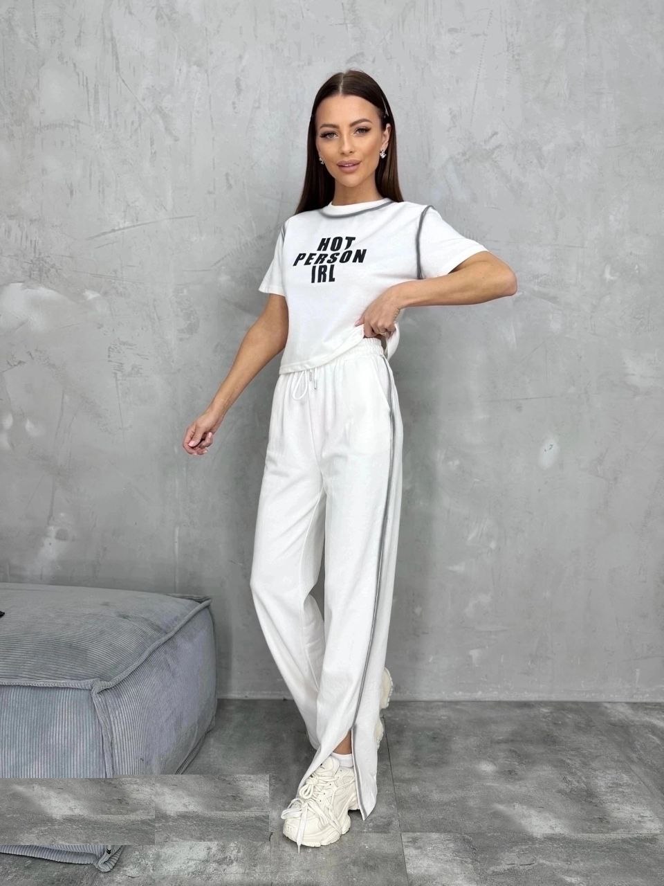 Женский костюм выполнен из футера высокого качества с хлопком и небольшим добавлением полиэстера и лайкры, что позволяет изделию не скатываться и оставлять идеальный внешний вид на долгое время. Костюм состоит из футболки с принтом и брюк с разрезами по бокам. Брюки на резинке с вместительными боковыми карманами.