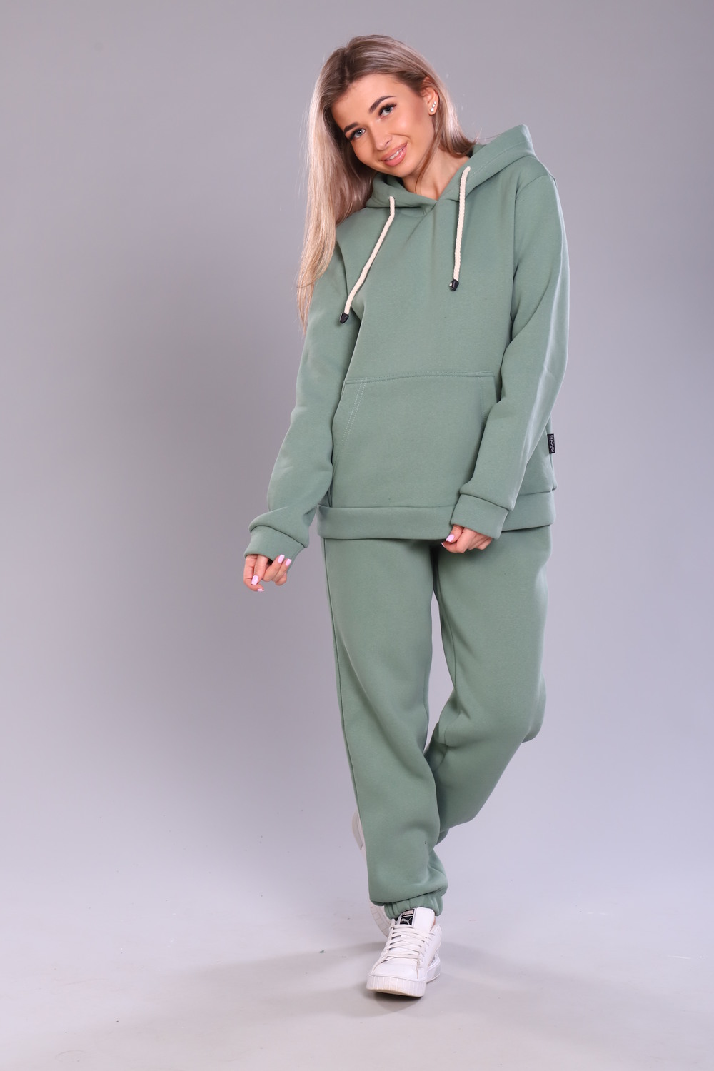 Теплый женский костюм толстовка + брюки. Толстовка с капюшоном, на животе карманы, рукава и низ отделаны манжетами. Брюки с карманами, внизу манжеты. Несколько вариантов расцветки. Размеры от 44 до 58.