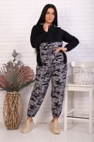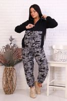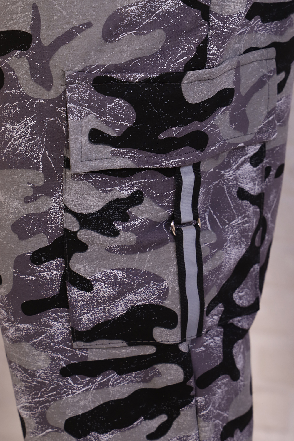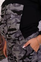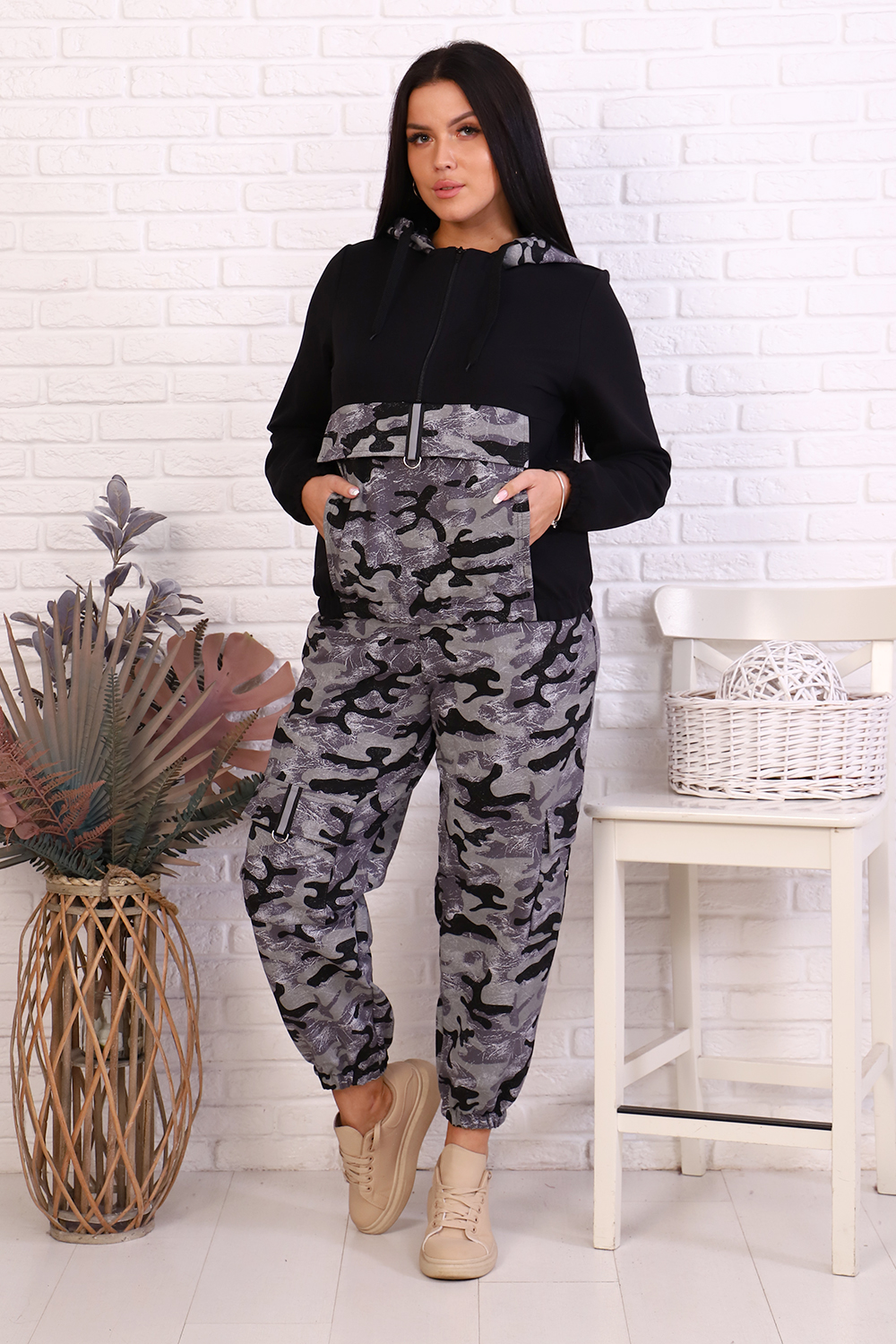 Женский костюм, выполненный из приятного к телу камуфляжного футера, состоит из толстовки и брюк. Толстовку оттенка хаки дополняет капюшон с плоским черным шнуром и тракторная молния, которая несет, как декоративную, так и функциональную роль. Низ и рукав изделия на резинке, спереди имеется удобный накладной вместительный карман с клапаном. Брюки свободные на резинке с боковыми и накладными карманами с клапанами. Костюм декорирован светоотражающими лентами и полукольцами. Комфорт, удобство и безопасность - основные функции костюма. Брюки можно приобрести отдельно - модель 6326