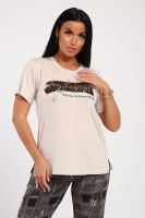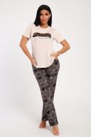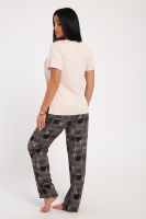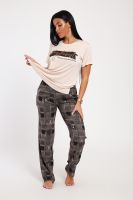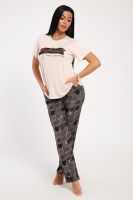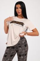 Классический и удобный трикотажный костюм с брюками из легкой хлопковой ткани динамичной расцветки! В комплекте костюма представлены кофта свободного кроя и брюки универсальной посадки Изюминкой костюма служит контраст верхи и низа -кофта нежного кремового оттенка и украшена лаконичным принтом, в тон расцветки брюк, которые сшиты из яркой, многоцветной ткани. универсальность костюма в том, что это идеальный вариант как домашней одежды для женщин, так и прекрасно подойдет для повседневной носки или одежды для сна.