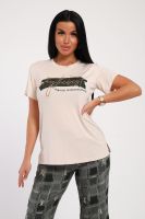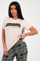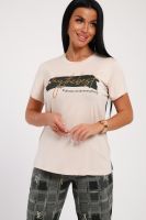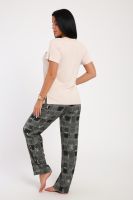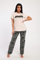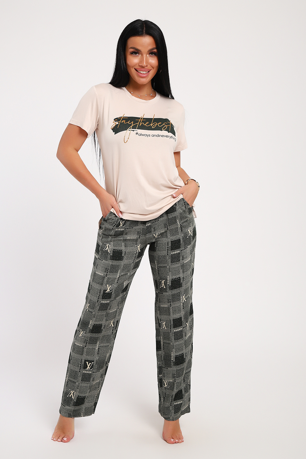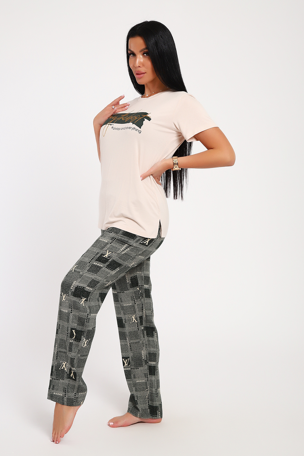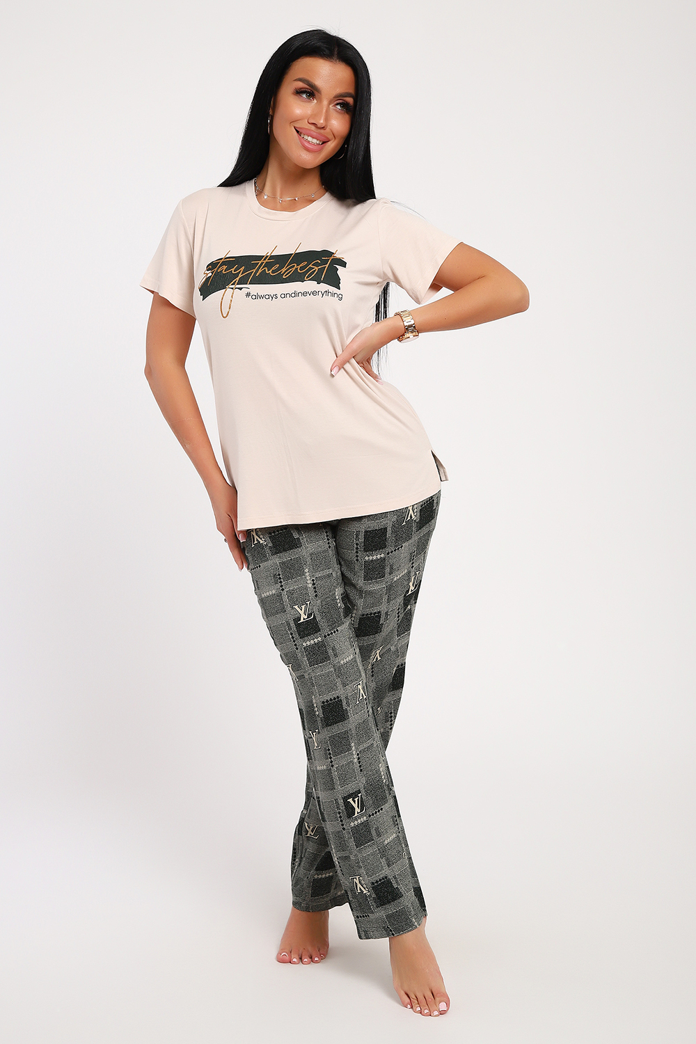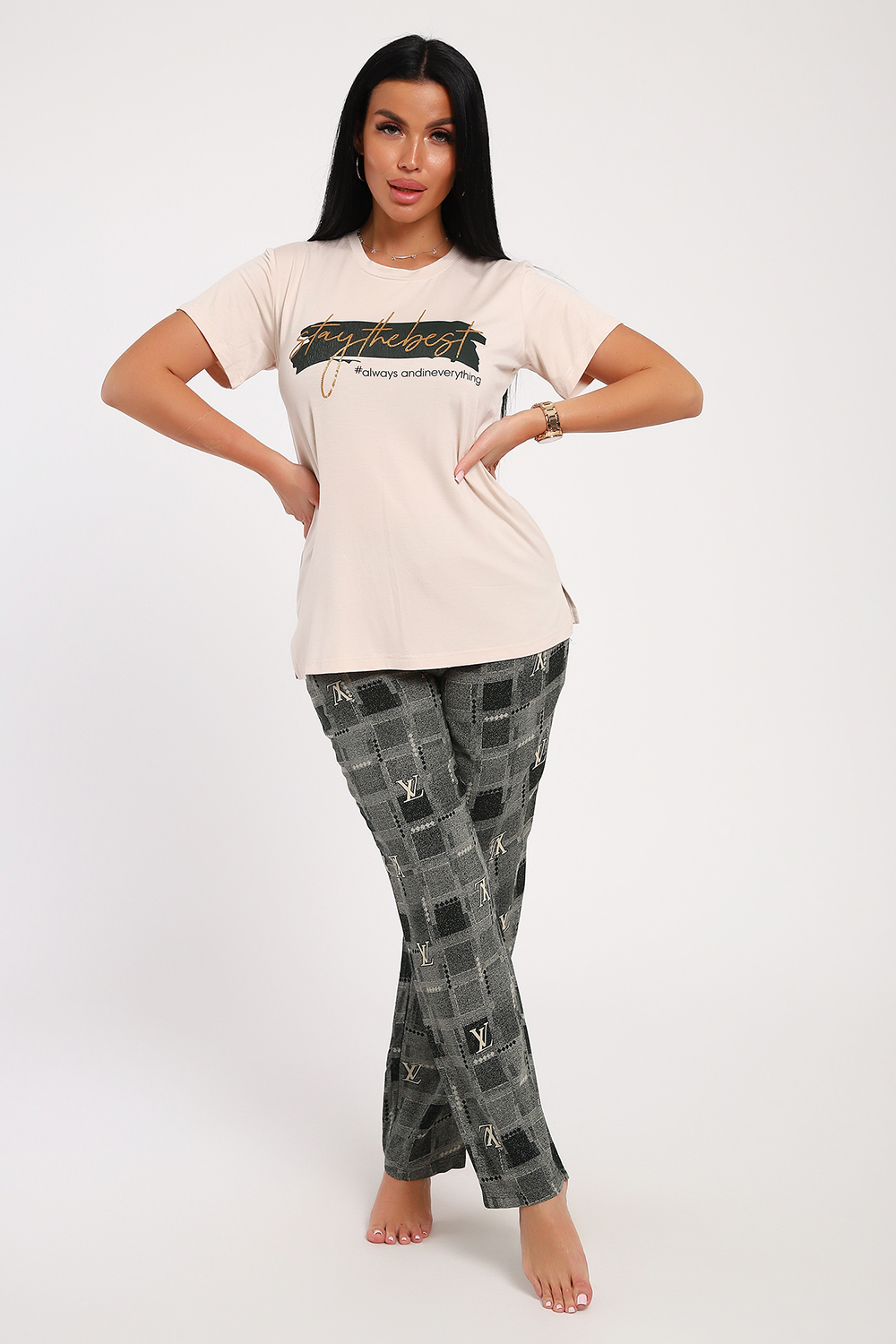 Классический и удобный трикотажный костюм с брюками из легкой хлопковой ткани динамичной расцветки! В комплекте костюма представлены кофта свободного кроя и брюки универсальной посадки Изюминкой костюма служит контраст верхи и низа -кофта нежного кремового оттенка и украшена лаконичным принтом, в тон расцветки брюк, которые сшиты из яркой, многоцветной ткани. универсальность костюма в том, что это идеальный вариант как домашней одежды для женщин, так и прекрасно подойдет для повседневной носки или одежды для сна.