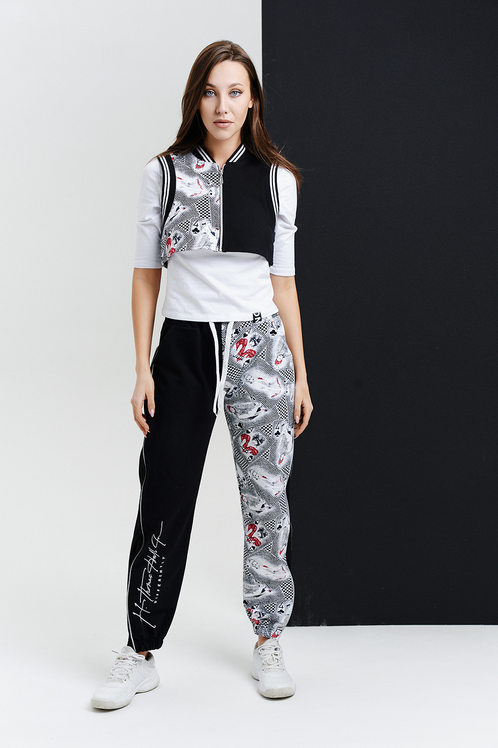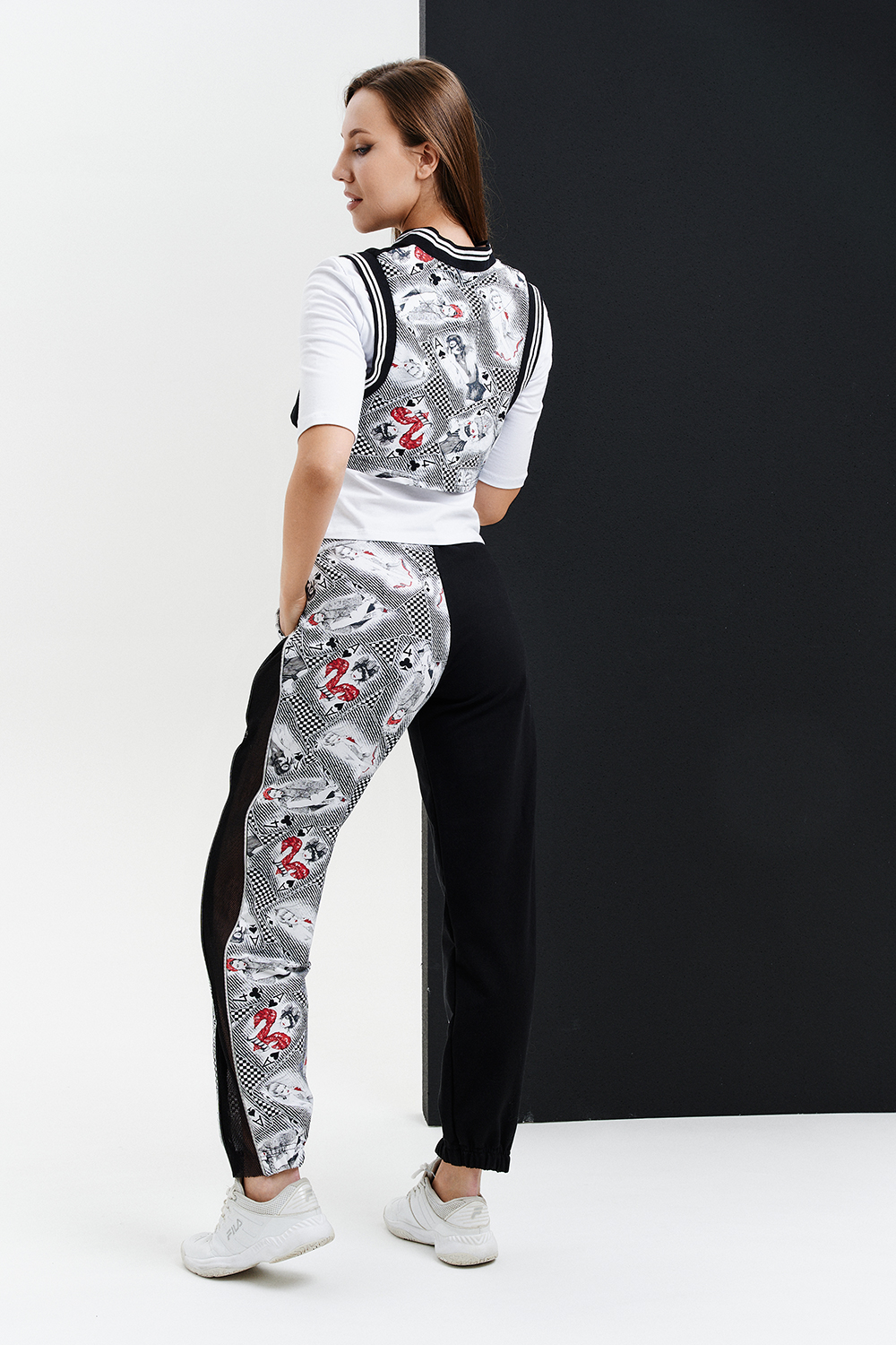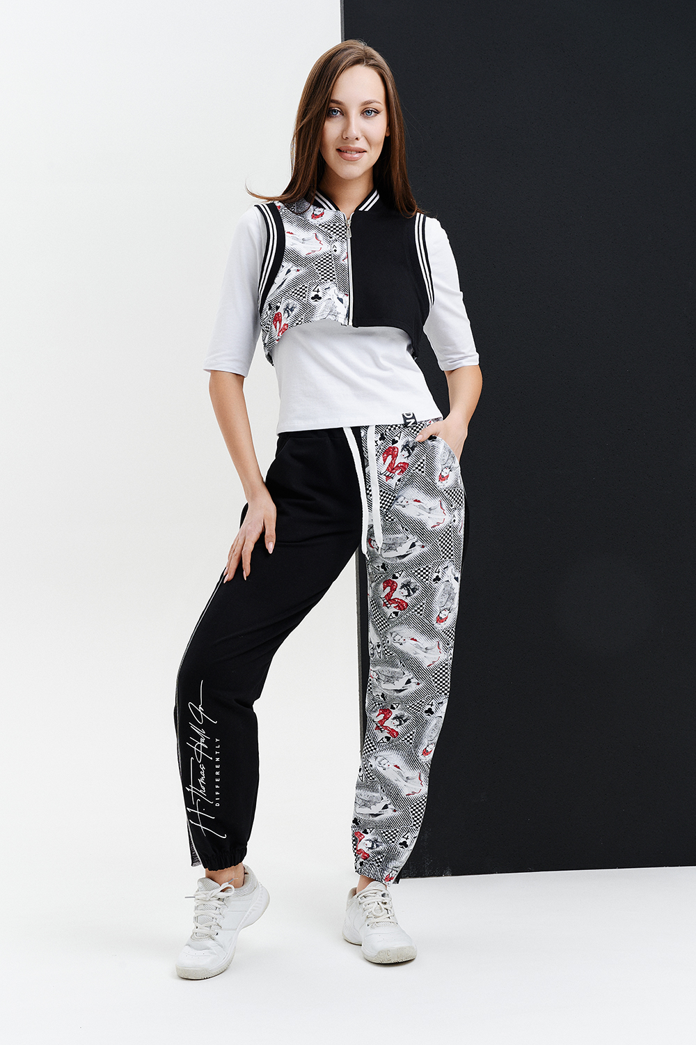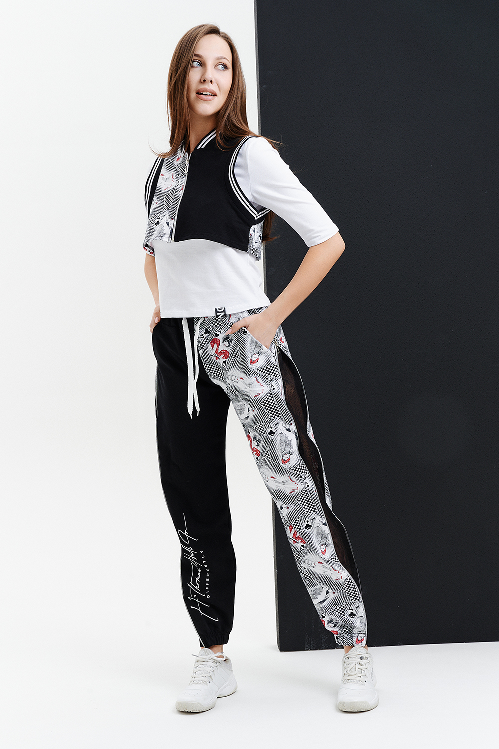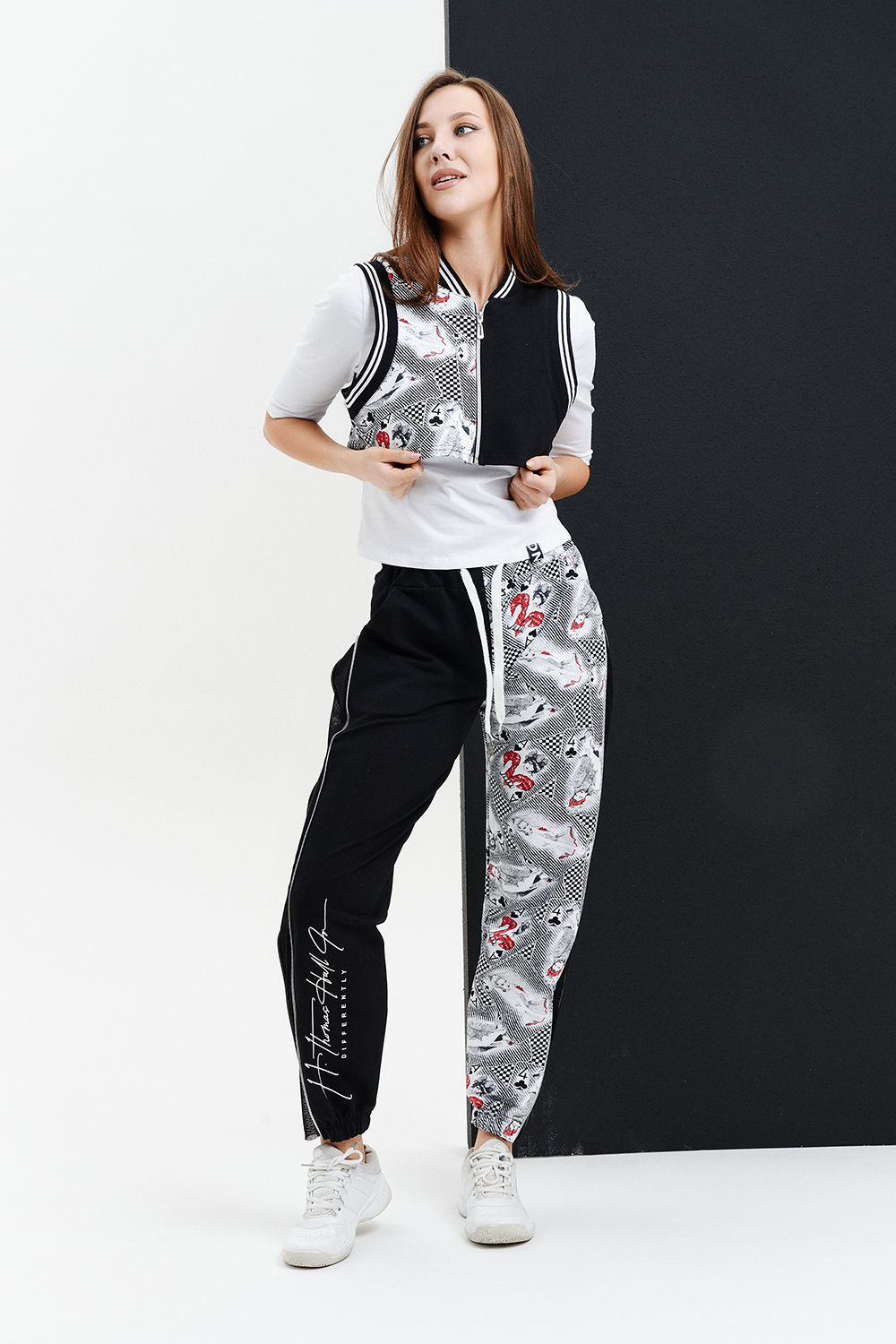 Молодежный костюм тройка, выполнен в технике COLOR BLOCKING, состоит из укороченного жилета на застежке- молнии, джоггеров со вставками из сетки и молниями в боковых швах с модным принтом на правой передней половинке брюк и белой трикотажной футболки декорированной шевроном на полочке. Оригинальный, модный и практичный костюм, который подойдет для встреч с друзьями и прогулок, для любителей активного отдыха.
