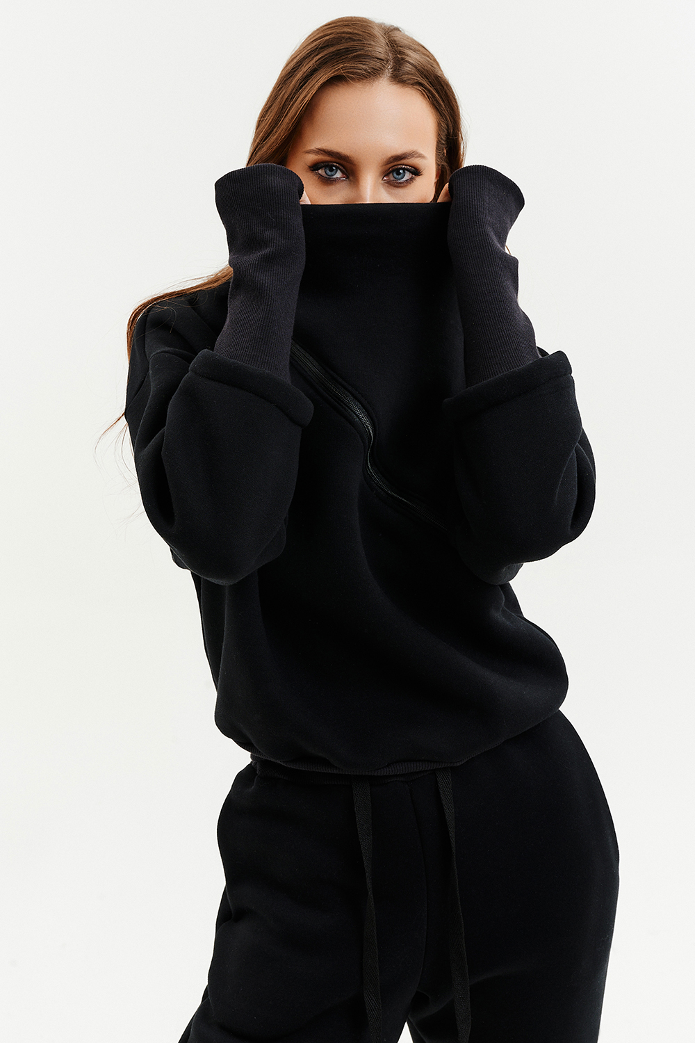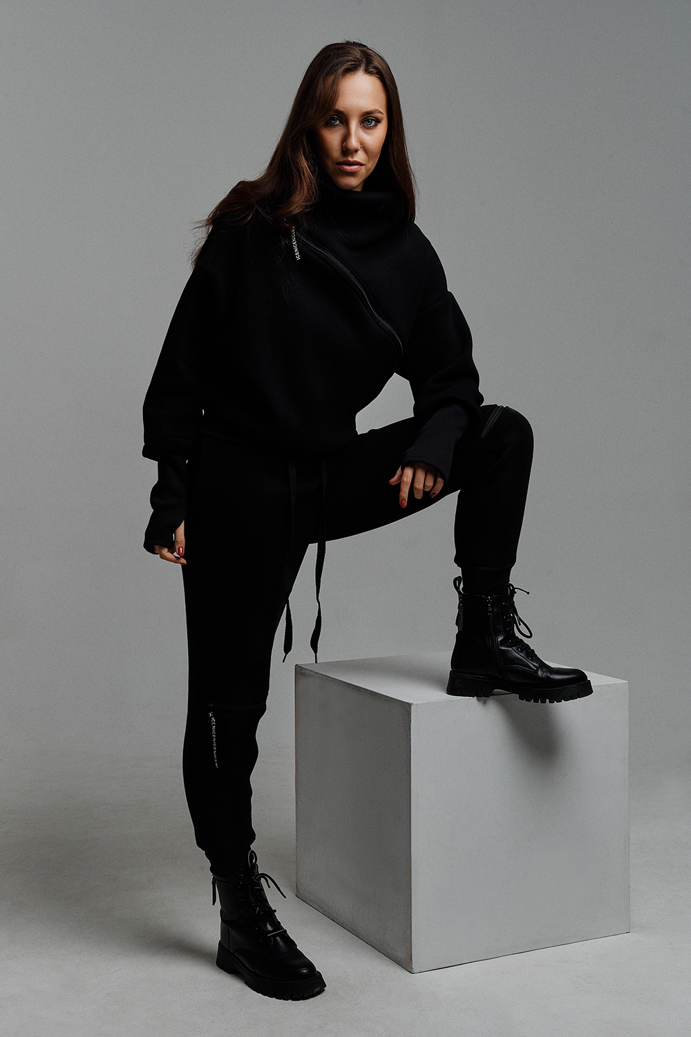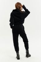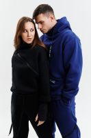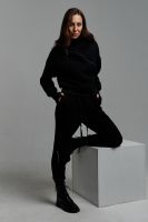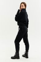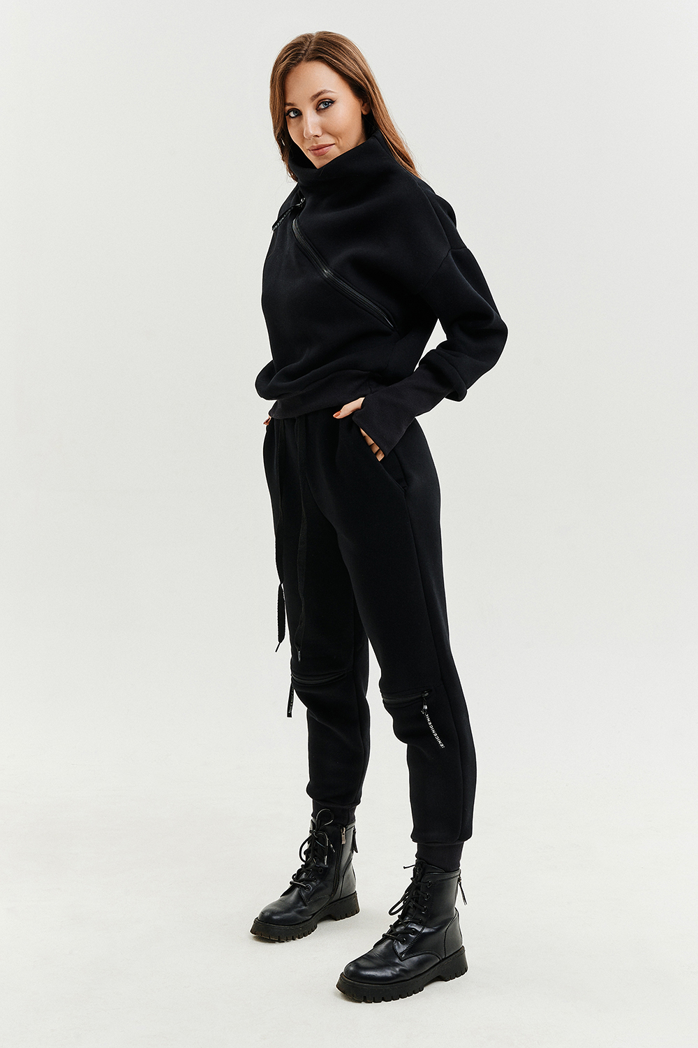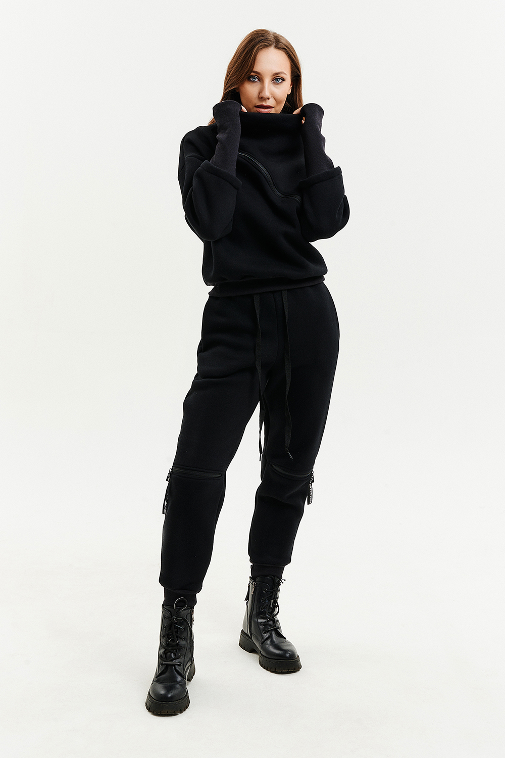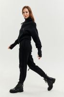 Удобный и стильный женский спортивный костюм. Состоит из свитшота и брюк-" джогеров". Толстовка и брюки оформлены функциональными, декоративными молниями. Толстовка с удобным воротником-стойкой, низ рукавов обработан высокой манжетой-перчаткойиз кашкорсе. Джогеры с высокой посадкой и широкой эластичной резинкой на поясе со шнурком. Низки брюк обработаны манжетами, что очень удобно при носке и отлично смотрятся с грубыми ботинками в стиле "челси". Спортивный костюм подходит как для зимних видов спорта, лыж, коньков, так и в холодную погоду осенью, весной. Расцветки "хаки" и "хаки с разрезом" отличаются отсутствием/наличием разреза на воротнике-стойке.